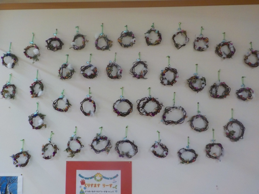 秋に収穫したさつま芋のつるを使って、クリスマスリースを作りました。お散歩で拾ったお茶の実や、園庭で育てた千日紅の花などで飾りつけをしました。ボンドを使い、小さな実をリースに付けるのは指先に集中して作らなくてはなりません。園長先生にも手伝... -