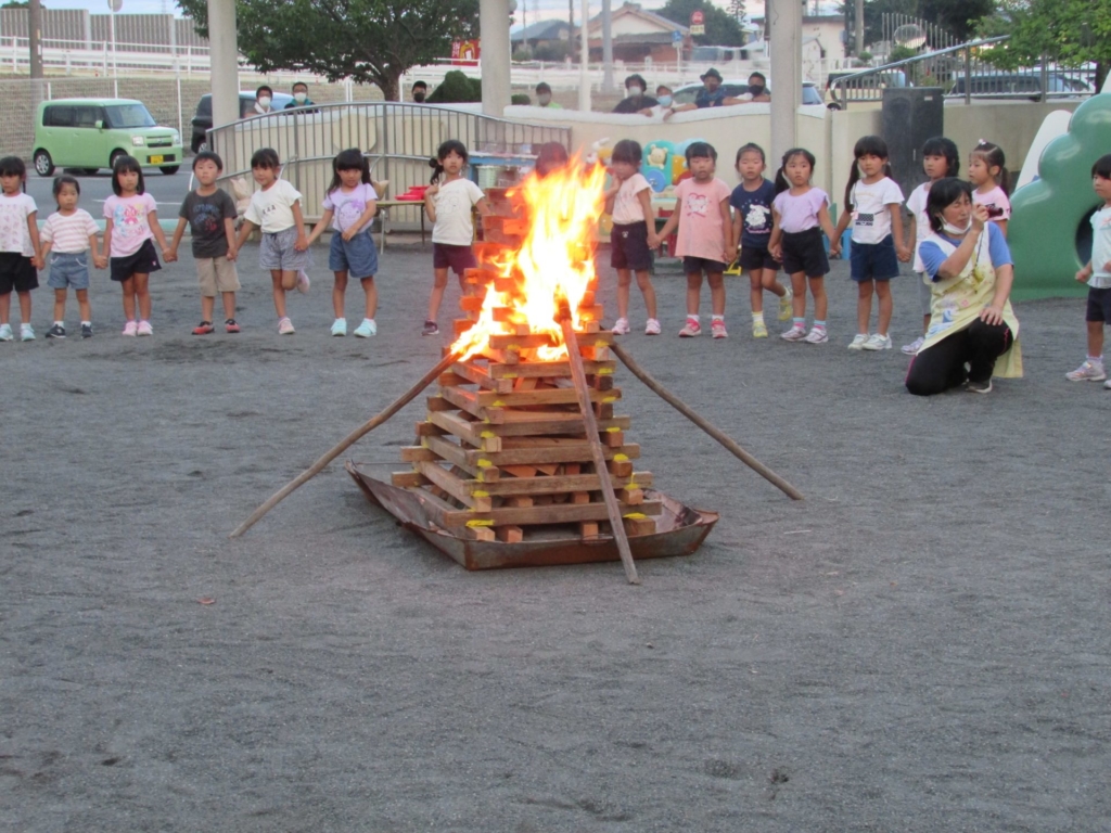 みんなで買い物をした材料で作ったもらった美味しカレーをモリモリ食べた後は最後のお楽しみ。キャンプファイヤーと花火を行いました。火の女神様の登場に少しびっくりしていた子もいました。クラスの代表のお友だちが女神さまから大切な火を頂き園庭の真... -
