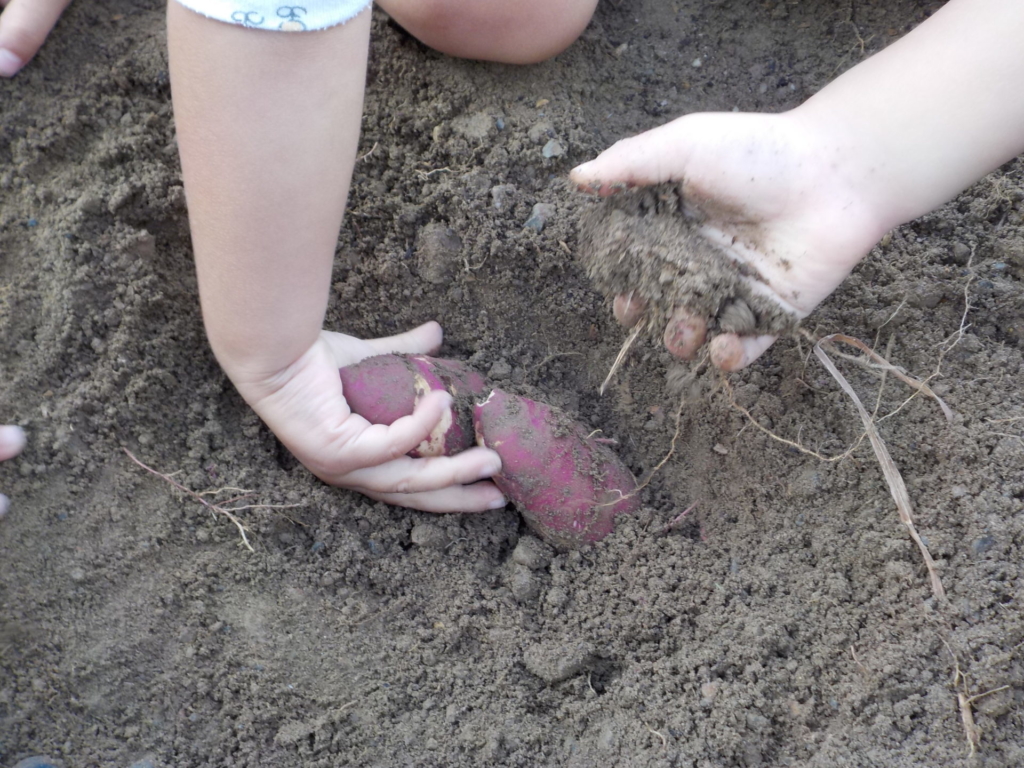 秋のはじめに、さつまいも掘りをしました。さつまいもの葉や茎を見つけると、みんなで「うんとこしょ!どっこいしょ!」とかけ声を合わせながら引っ張る子どもたち。でもなかなかうまく抜けず、気づくとみんなショベルカーになりきって手を使いながら夢中... -