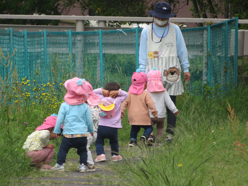 5月20日、園外保育に出掛けてきました。芝生の広い公園の中を探検したり、芝生の坂をころころ転がってみたり体いっぱい使って、楽しんできました。昼食後は、黄組全員で「だるまさんがころんだ」をして広場で楽しみました。さあ!出発~☺わくわく♪お約束を... -