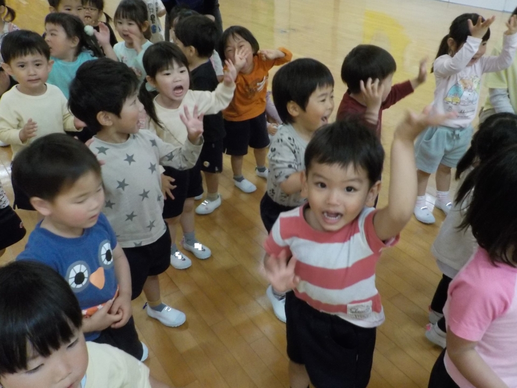 入園、進級して1ヶ月が過ぎ、少しずつ園の生活にも慣れてきた子どもたち。赤組さん全員が集まってリトミックを行いました。初めは「何をするのかな」と少し不安な表情の子もいましたが、こいのぼりの歌を歌ったり、体操をしていく内にどの子も笑顔が見られ...