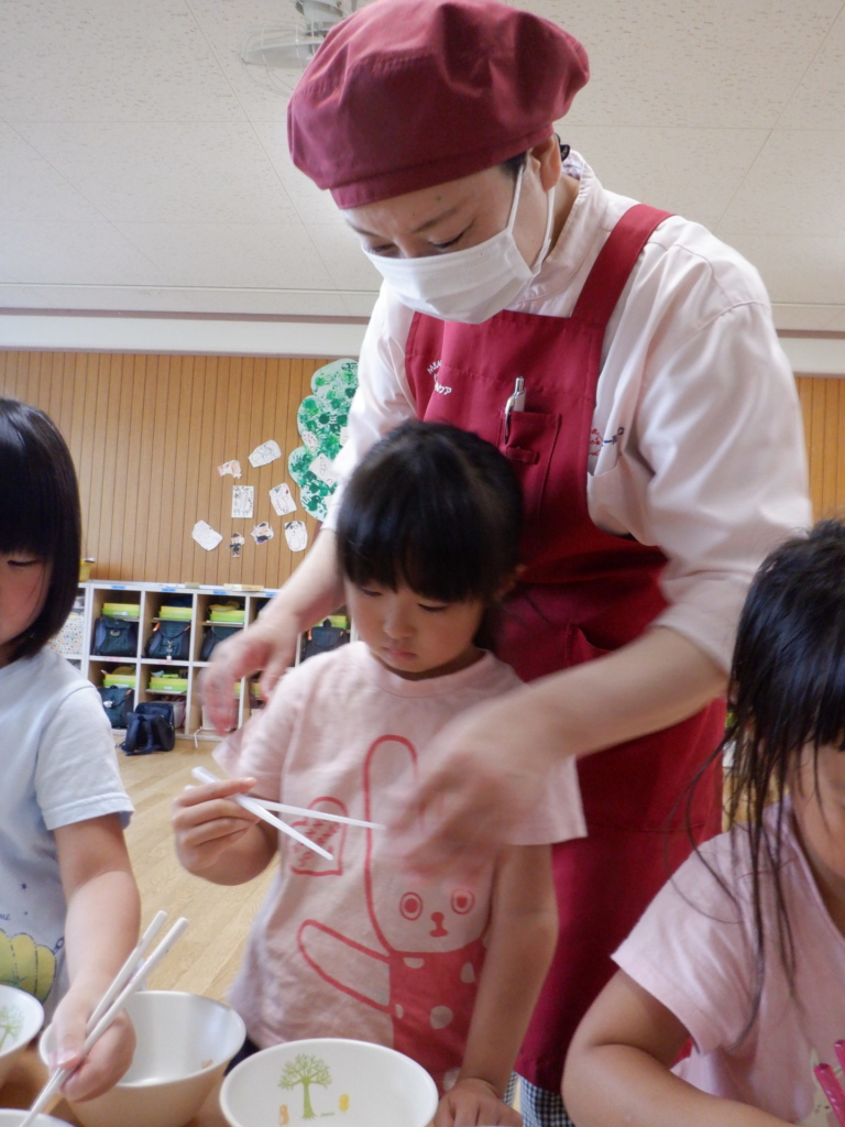 手先が器用になり、給食の時にお箸を使うお友だちが増えてきた青組さん。そこで今回は、いつも給食を作ってくださる、ミールケアさんにお箸の先生として来ていただき、お箸教室を行いました!正しいお箸の使い方を、良い目と耳で聞きます。その後は、スポ...