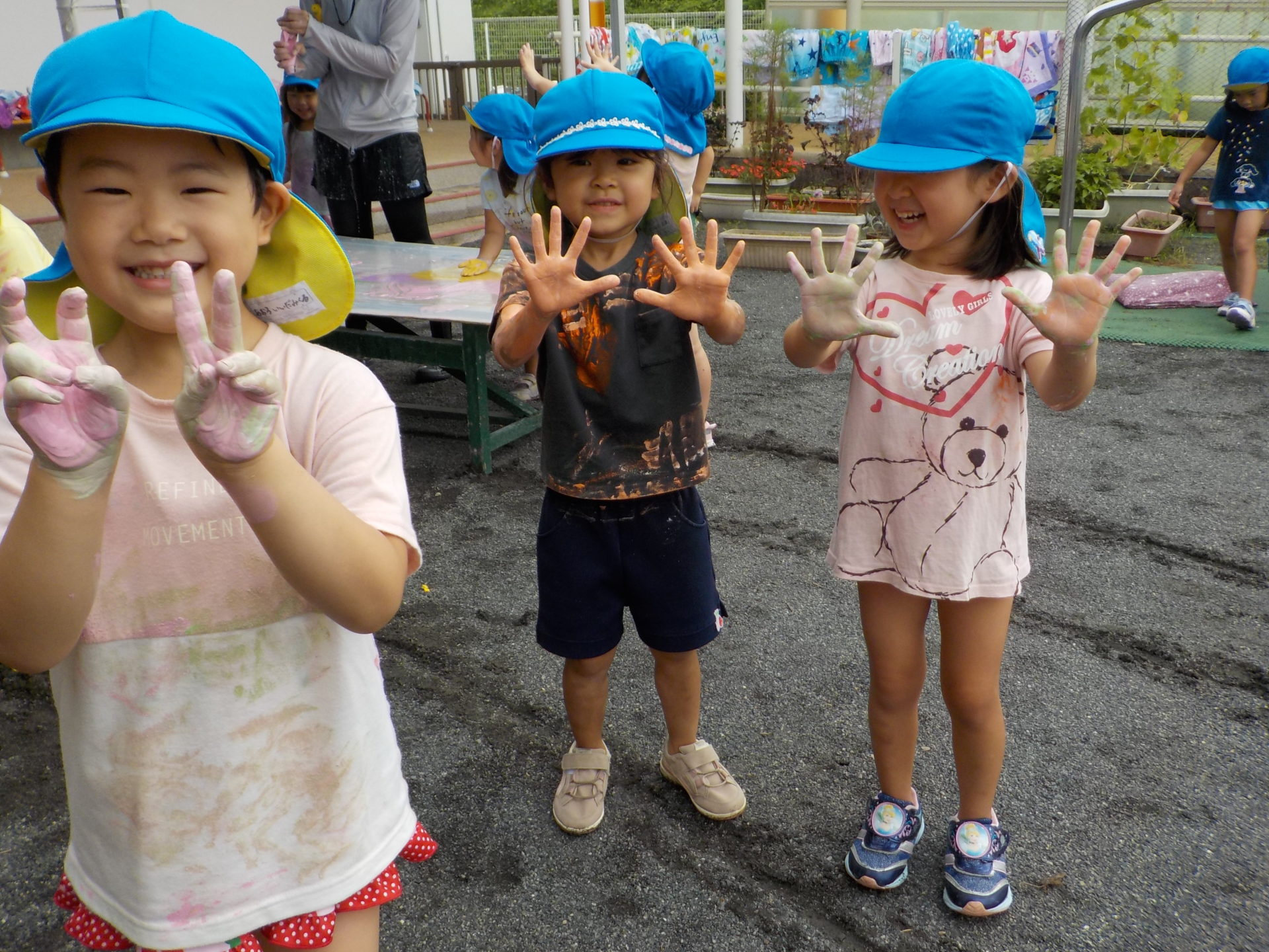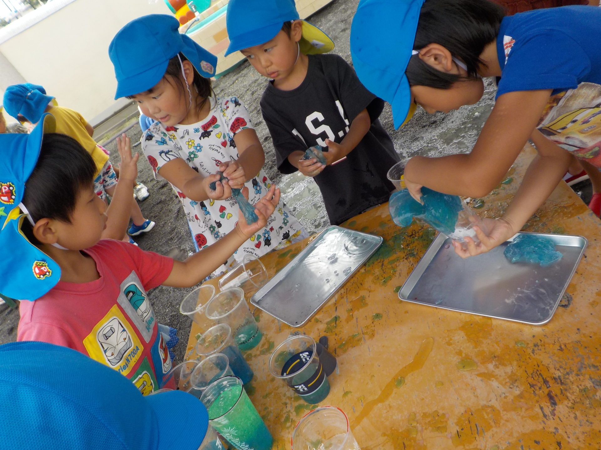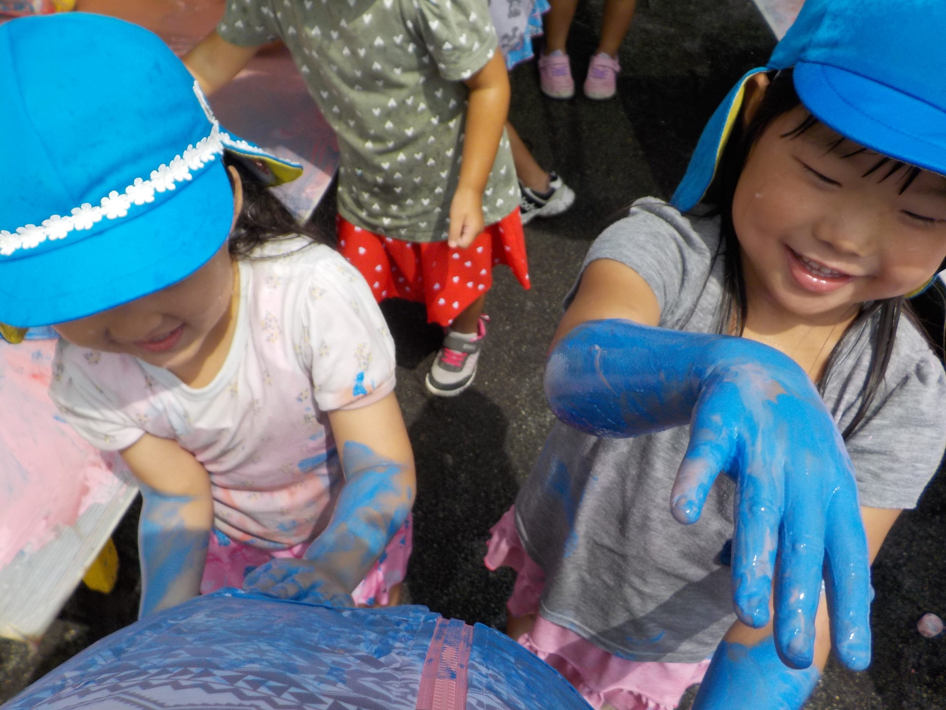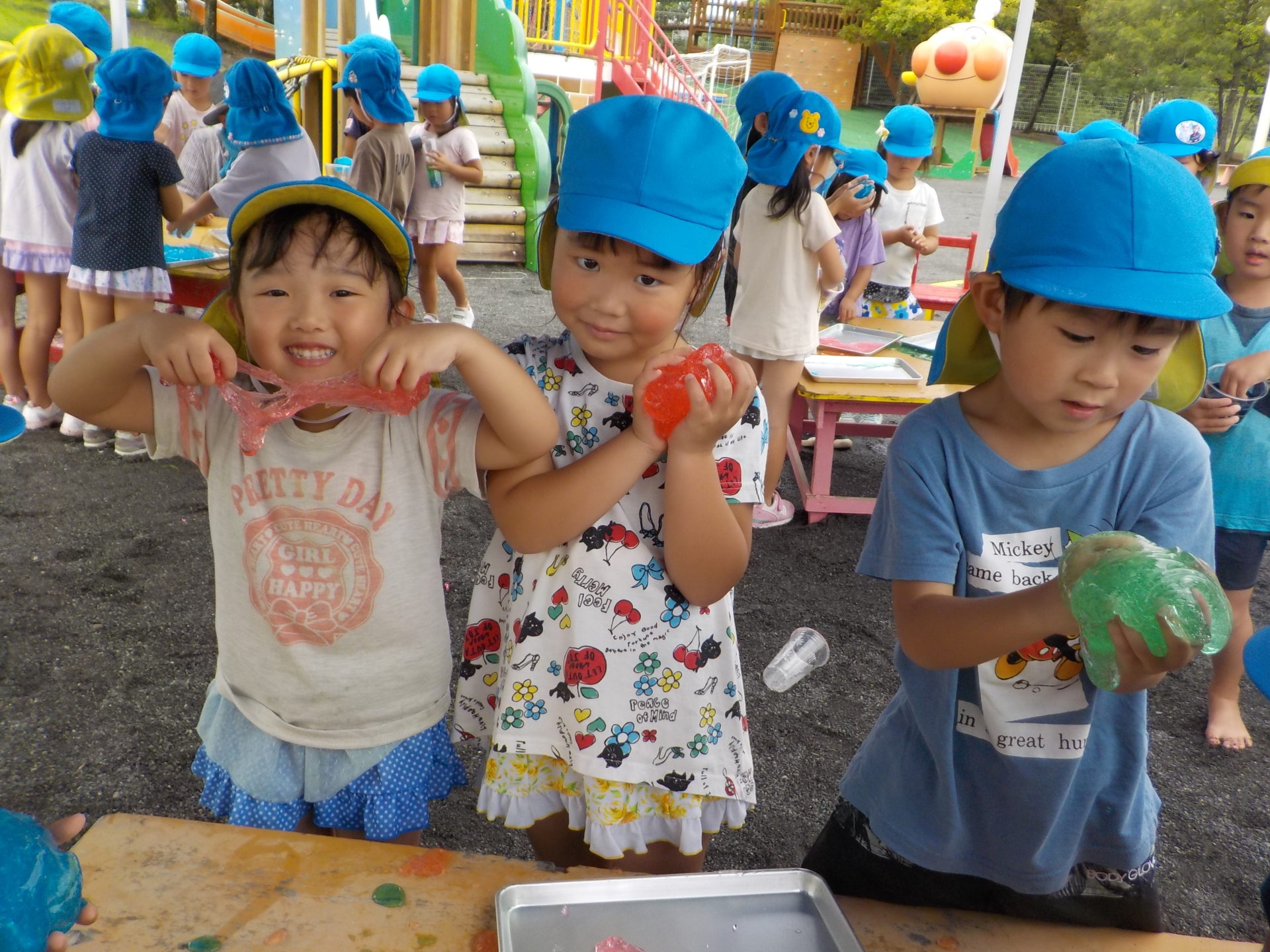 夏季保育中の8月26日(金)にわくわく水遊びを行いました。7月にも行っていたので、今回のわくわく水遊びはどんなものがあるの!?と朝から楽しみにしていたこどもたち。今回は前回よりさらにパワーアップし、ボディーペインティングやスライム、バシャバシャ池もあり子どもたちは大興奮!!中でも人気だったのは色とりどりのスライムです。びよーん!と思いきり伸ばしてみたり、違う色を混ぜて、ジュースを作ったりと、思い思いの遊びを楽しんでいました☆