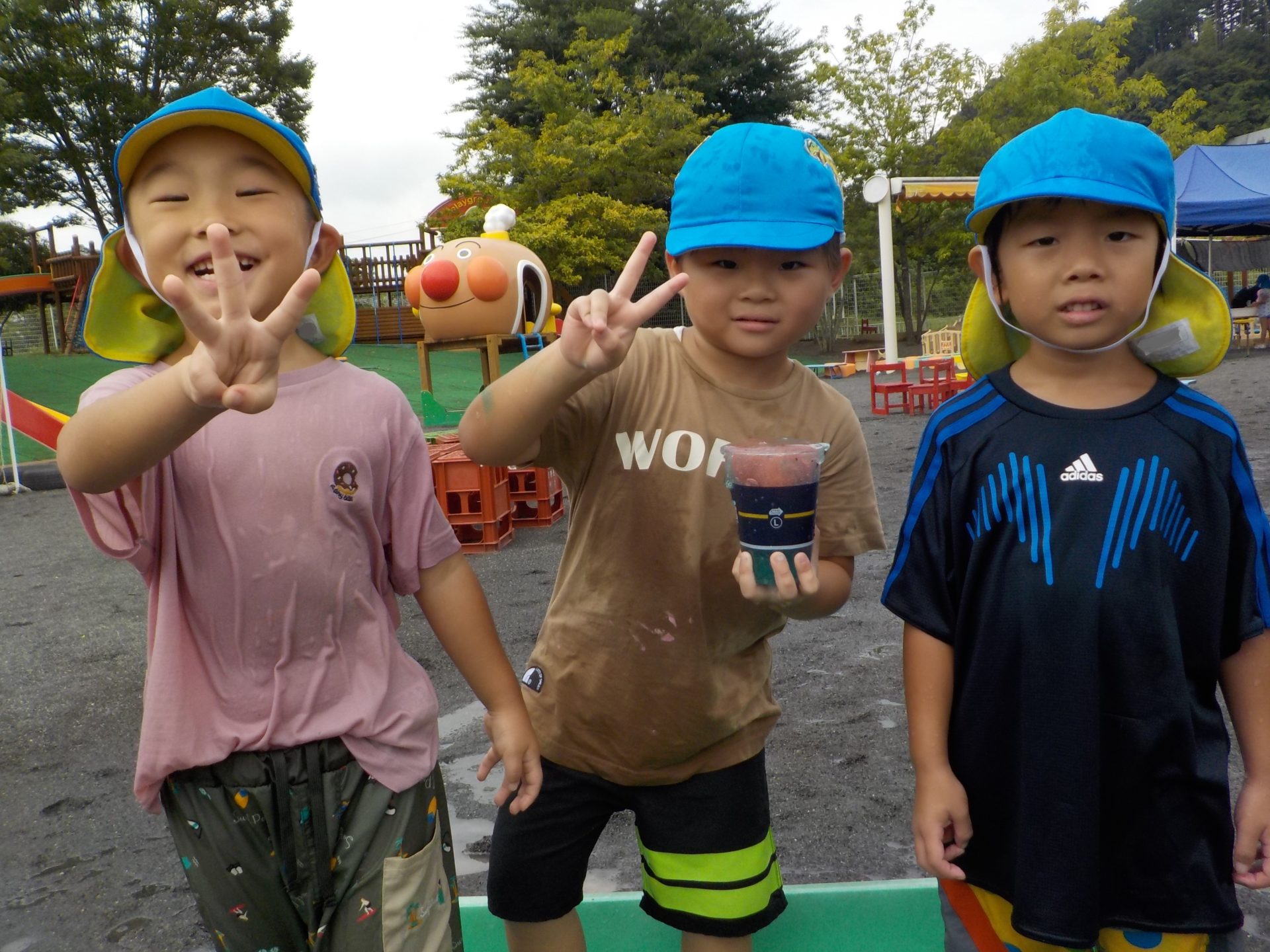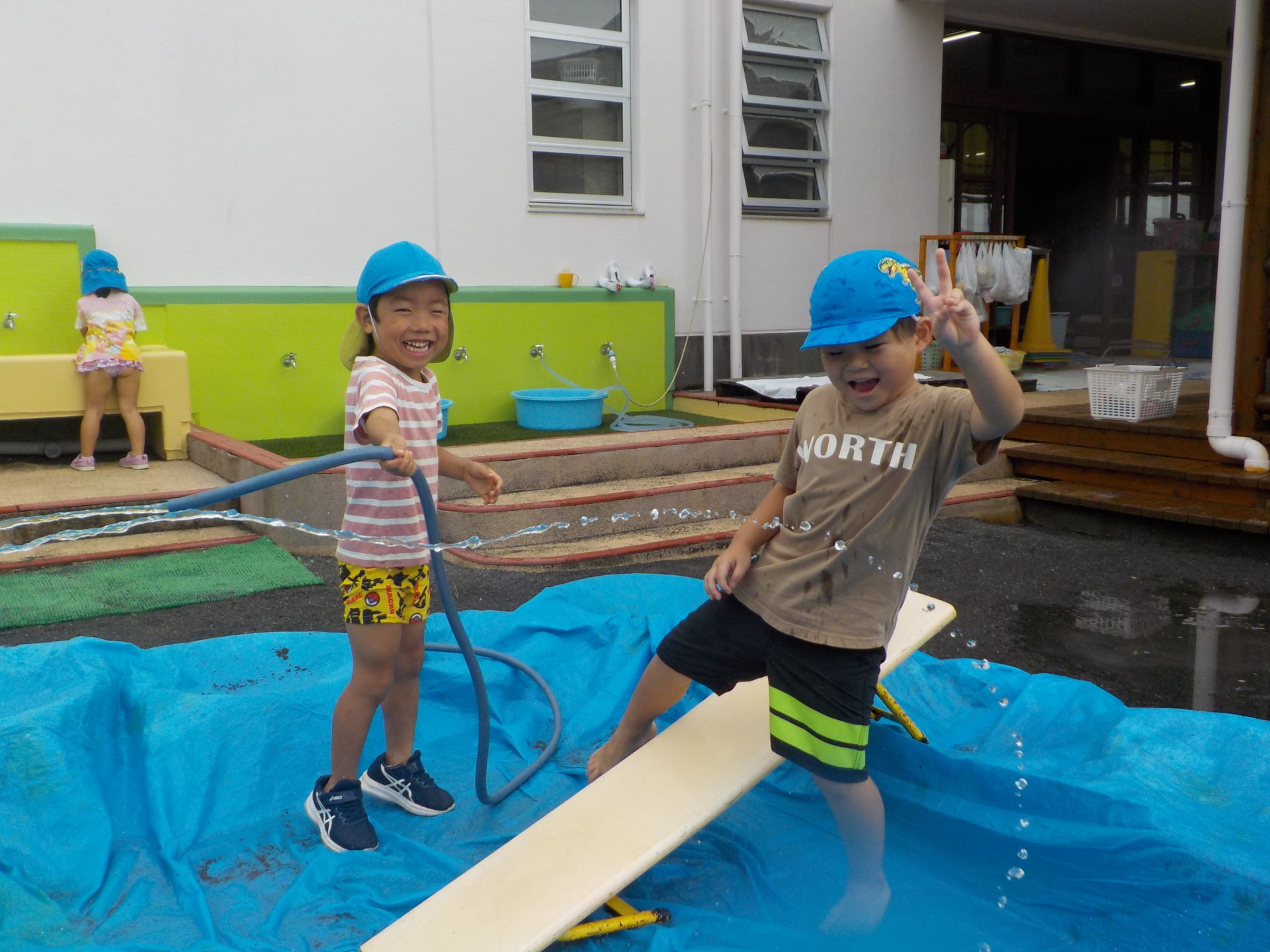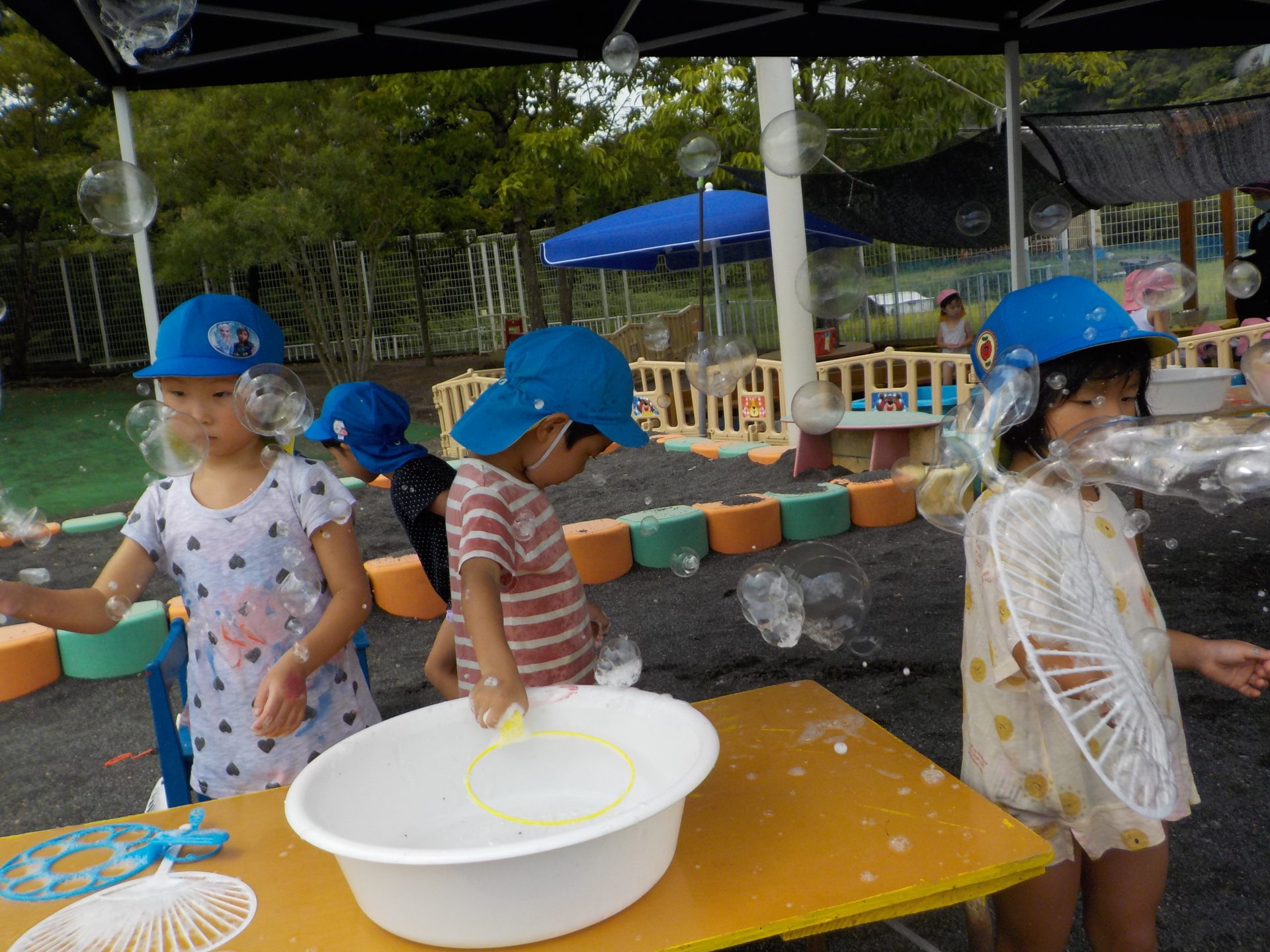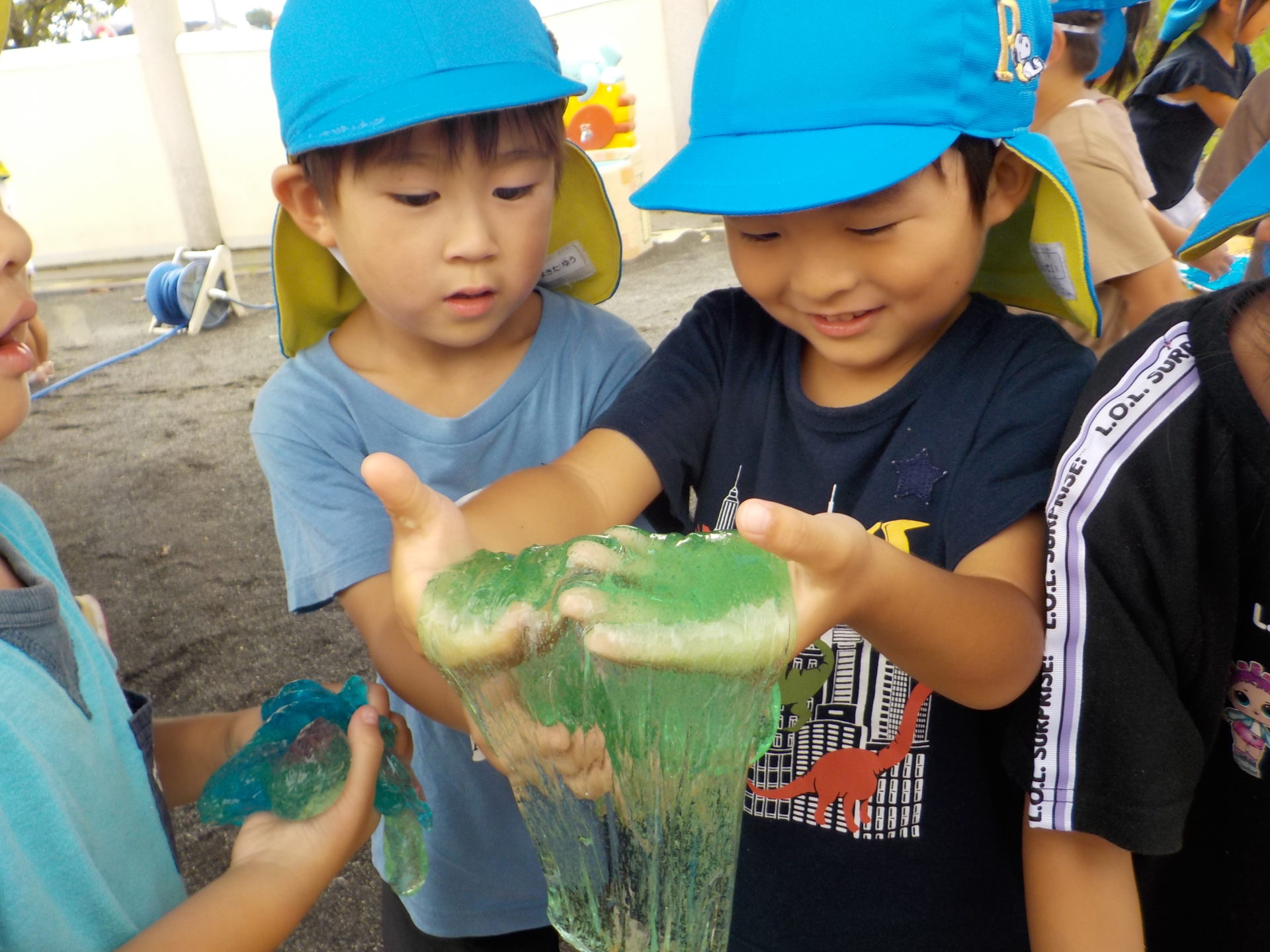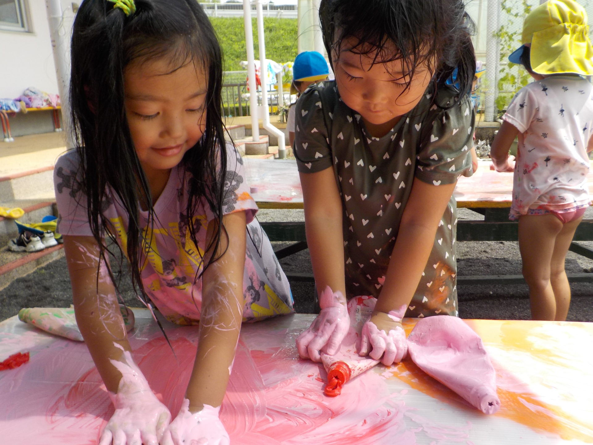 夏季保育中の8月26日(金)にわくわく水遊びを行いました。7月にも行っていたので、今回のわくわく水遊びはどんなものがあるの!?と朝から楽しみにしていたこどもたち。今回は前回よりさらにパワーアップし、ボディーペインティングやスライム、バシャバシャ池もあり子どもたちは大興奮!!中でも人気だったのは色とりどりのスライムです。びよーん!と思いきり伸ばしてみたり、違う色を混ぜて、ジュースを作ったりと、思い思いの遊びを楽しんでいました☆