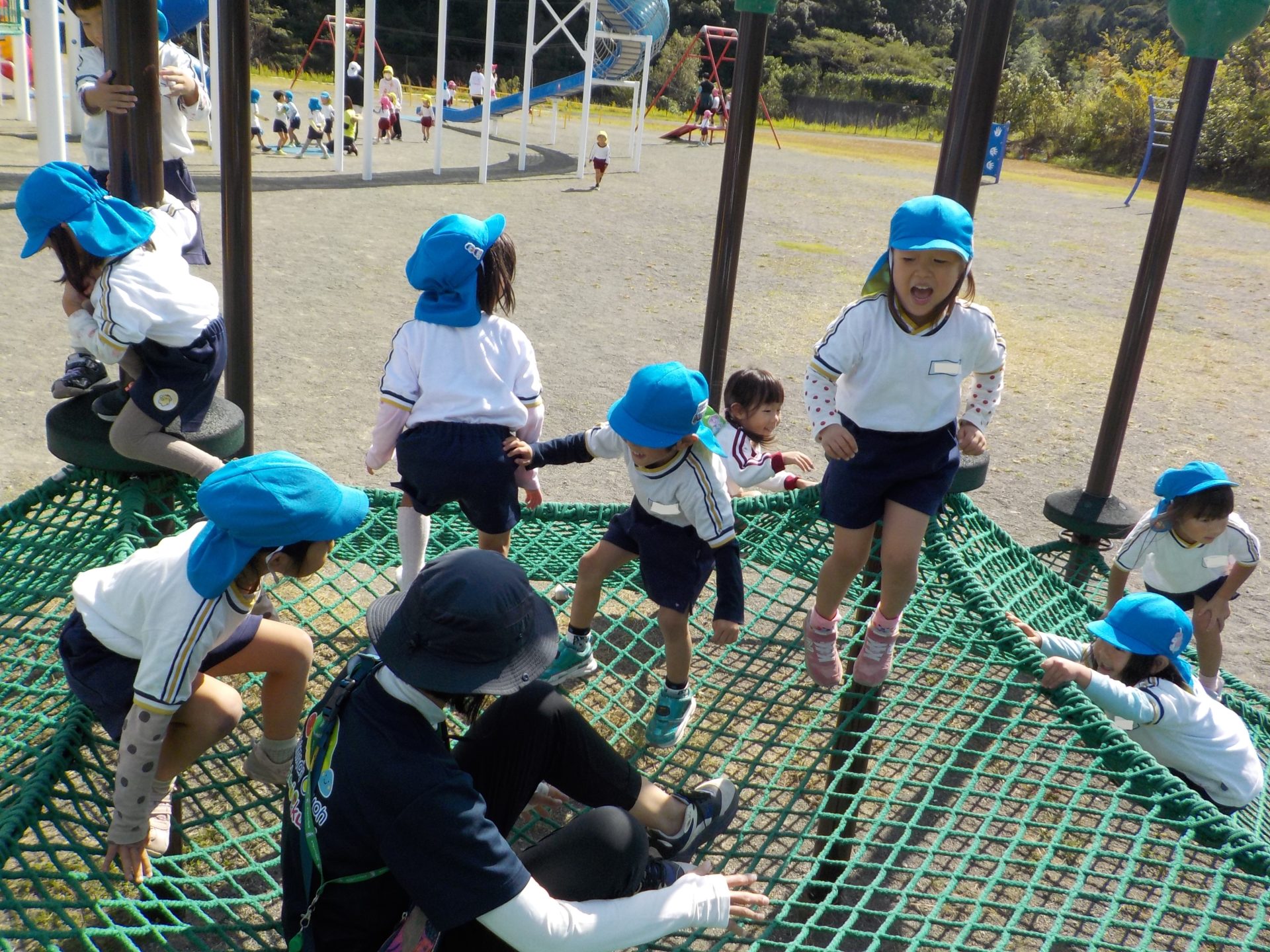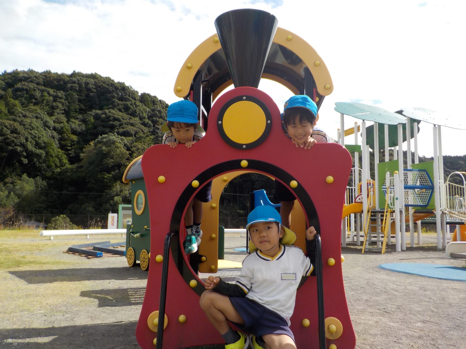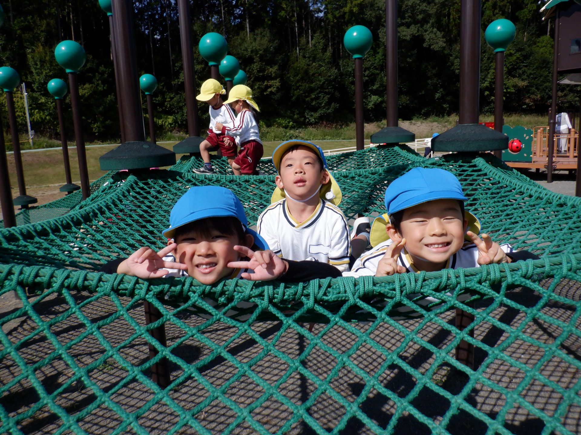 風がだんだん秋の涼しさに変わり、遠足日和の10月18日(火)にゆめみらいパークへ行ってきました!「お家の人と行ったことあるよ!」「この道、通ったね!」「この前も行ったね!」とバスの中では道案内をしてくれた子どもたち。公園に着くと、まずはお約束を聞き、好きな遊具へ一目散!!ガラガラすべり台や、くるくる回るすべり台、園とは違う遊具で沢山身体を動かしました☆