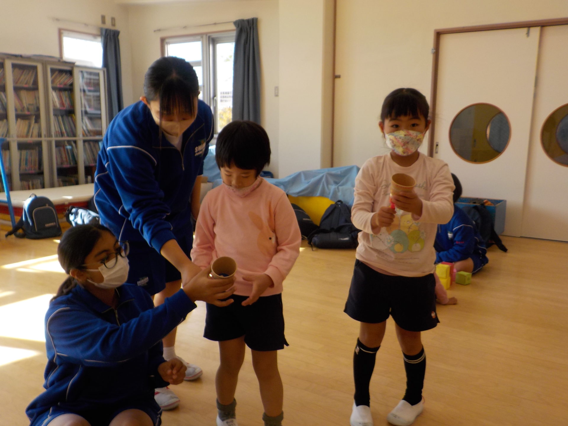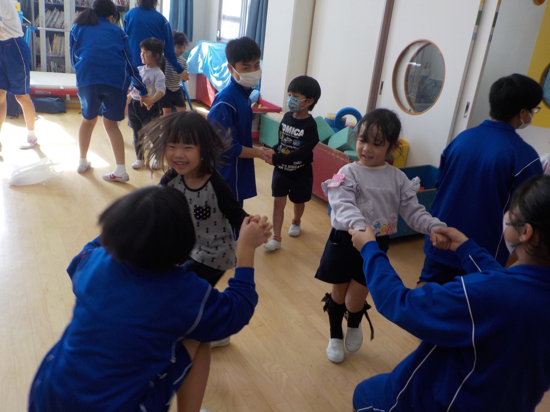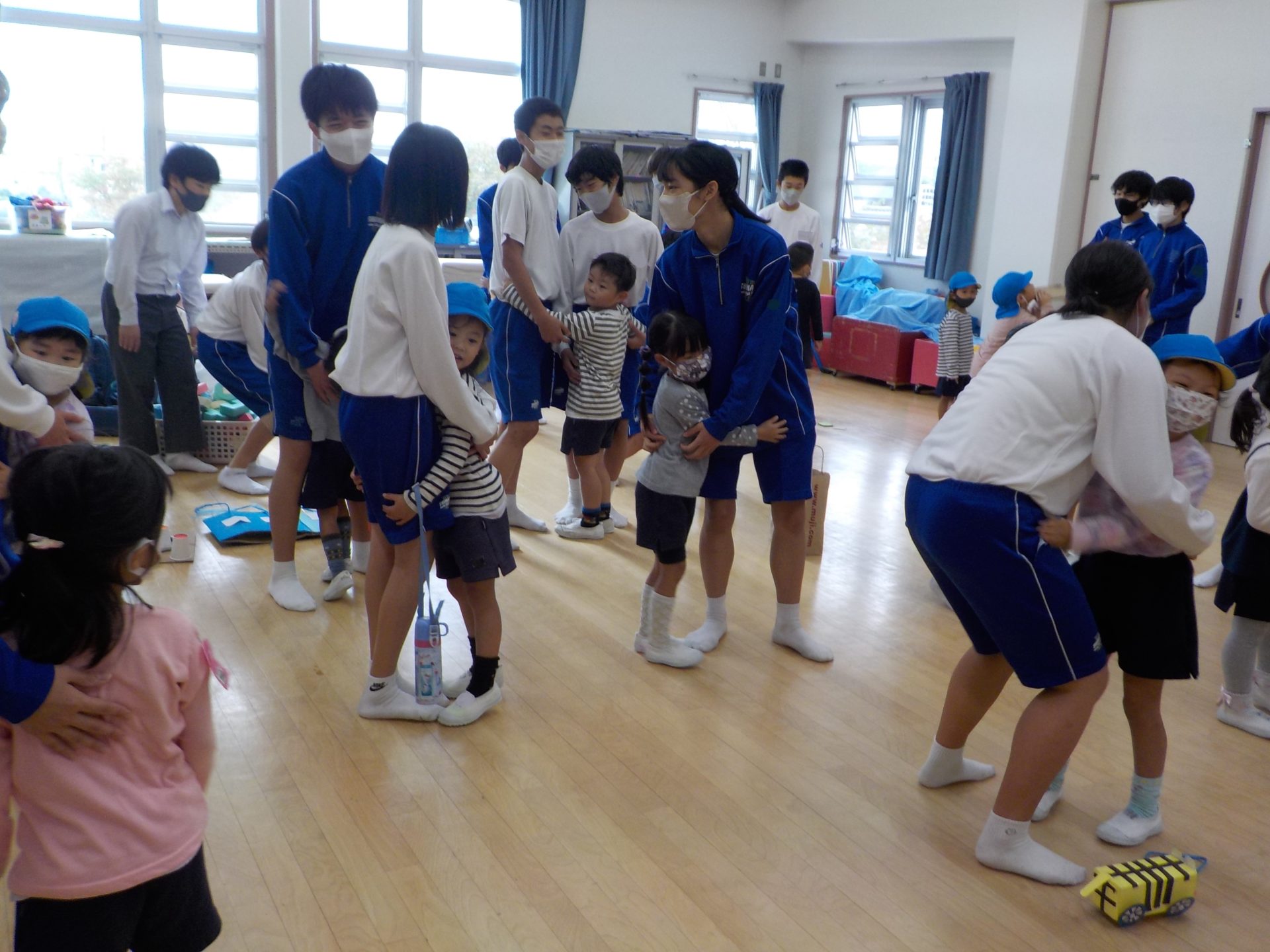 島田第二中学校のお兄さんお姉さんが、ふれあい学習として、こども園に遊びに来てくれました!普段の園生活では関わることのないお兄さんお姉さんに、大興奮の子どもたち!クラスごと活動の日が違っていたこともあり、「僕たちのお部屋にはいつくるの?」「今日は来ないの?」とその日を楽しみに待っていました。いざ交流がスタートすると、始めましてのお兄さんお姉さん、に少し緊張した表情を見せる子もいれば、この遊びしよう!と積極的に遊びを広げていく子もいました。1時間という限られた時間でしたが、遊具で遊んだり、お部屋で絵本を読んでもらったりとても楽しい時間になりました☆