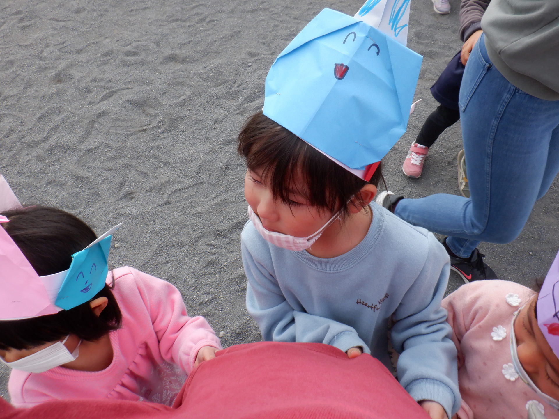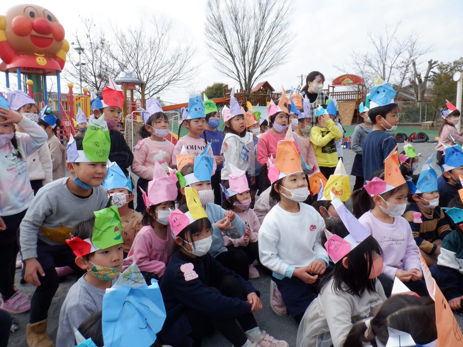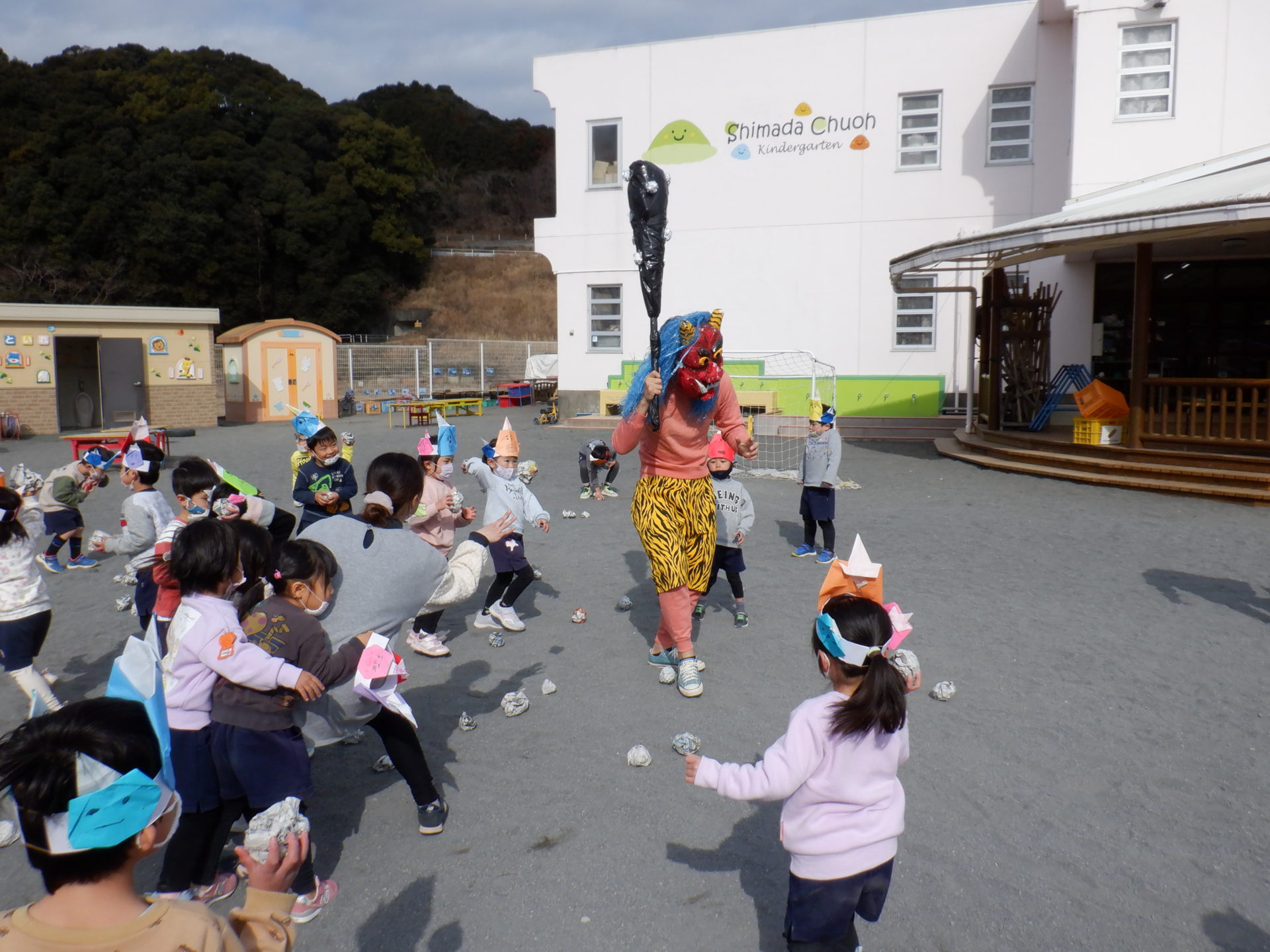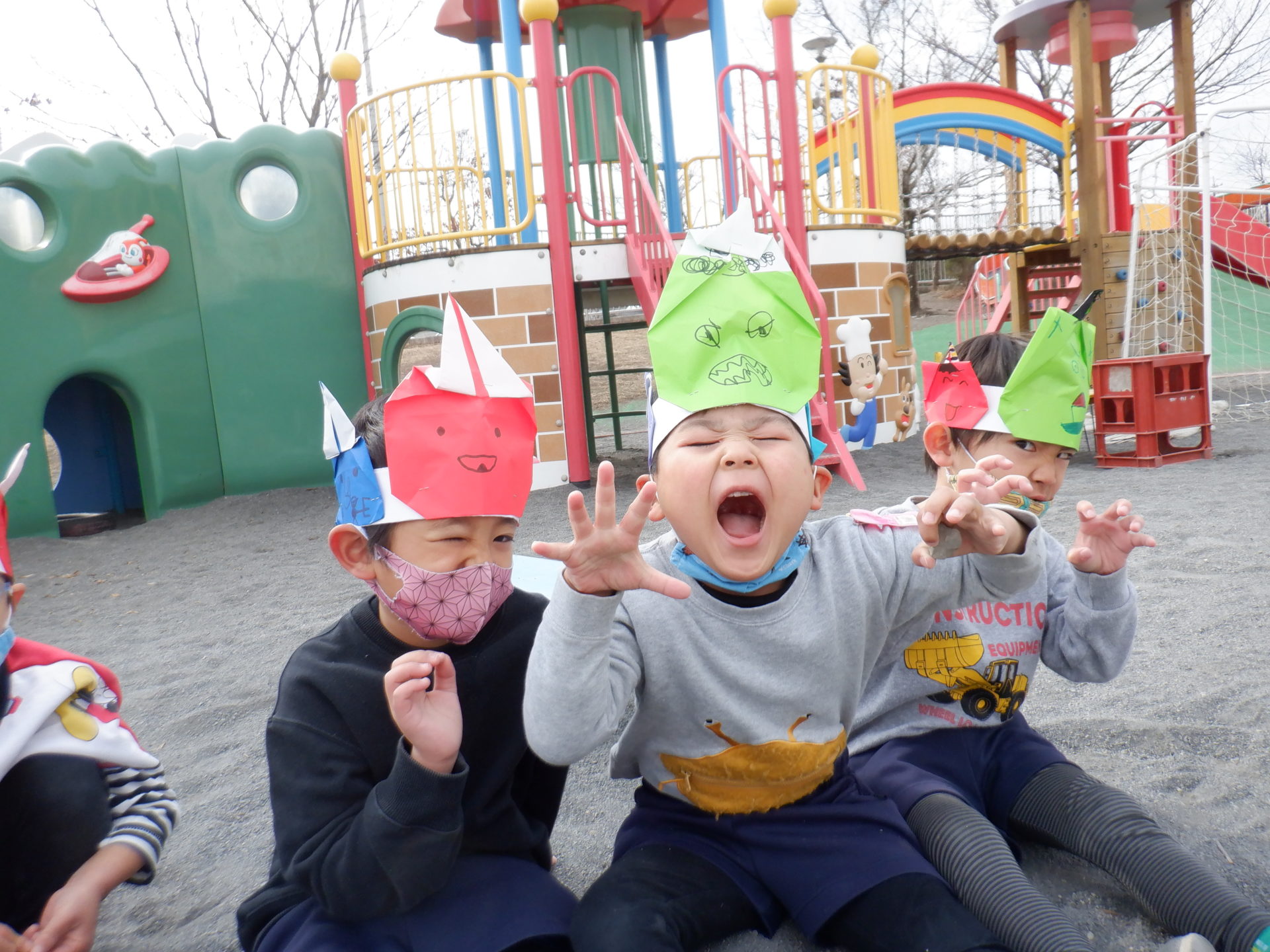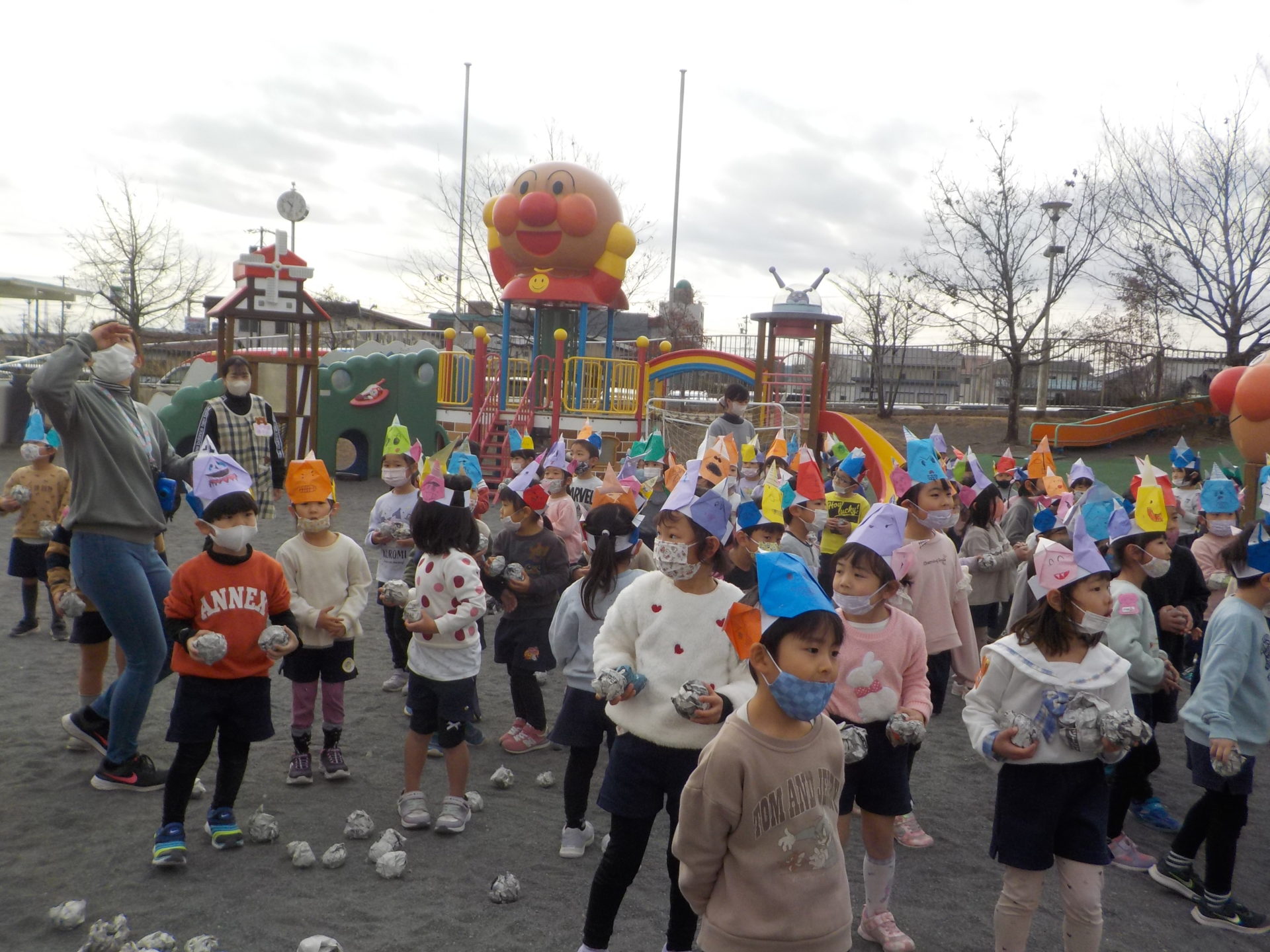 2月3日金曜日園庭で「鬼さんパラ」を踊り終わると・・・太鼓の音が鳴り響き、山から悪さをする鬼が降りてきました!!ちょっぴり怖かったけど、勇気を出して「鬼は~そと!」「福は~うち!」と、どんどん立ち向かっていく子もいれば、先生にしがみつきながら新聞紙豆を握りしめる子もいました。大きな声を出し、力いっぱい新聞紙豆を投げつけ、頑張って鬼退治しました。鬼が帰ると、福の神が現れ幸せをたくさん分けてくれましたよ♡