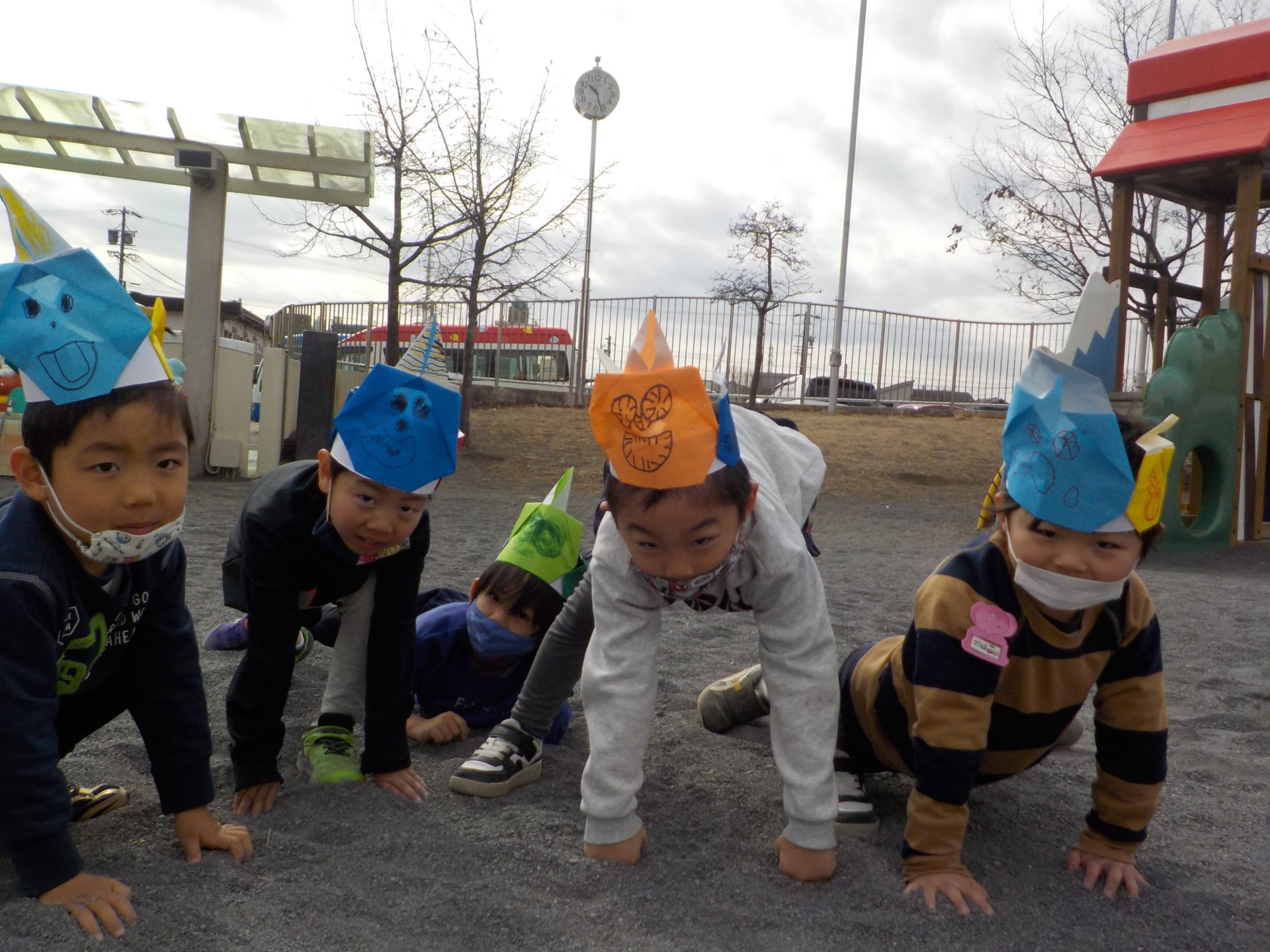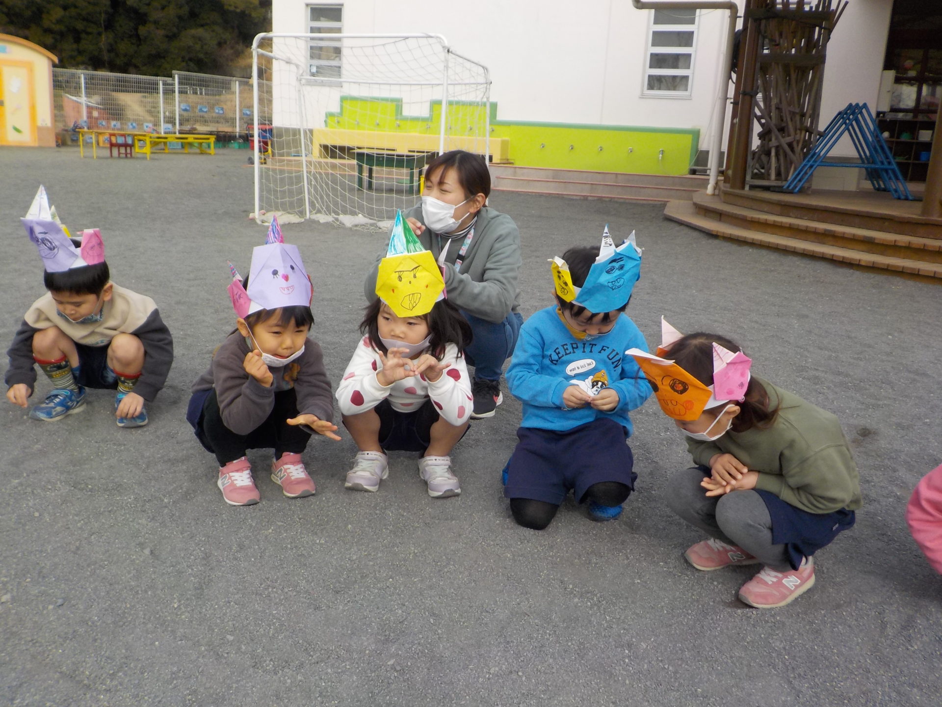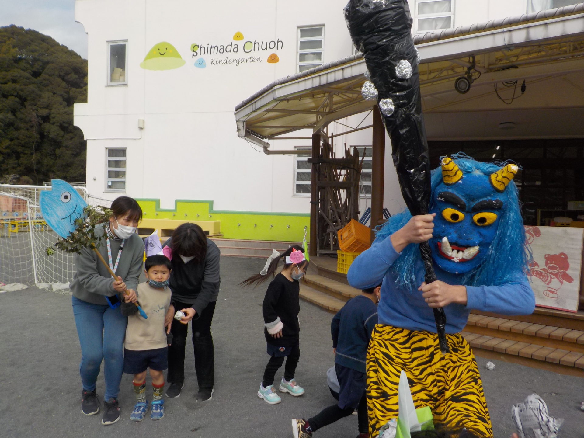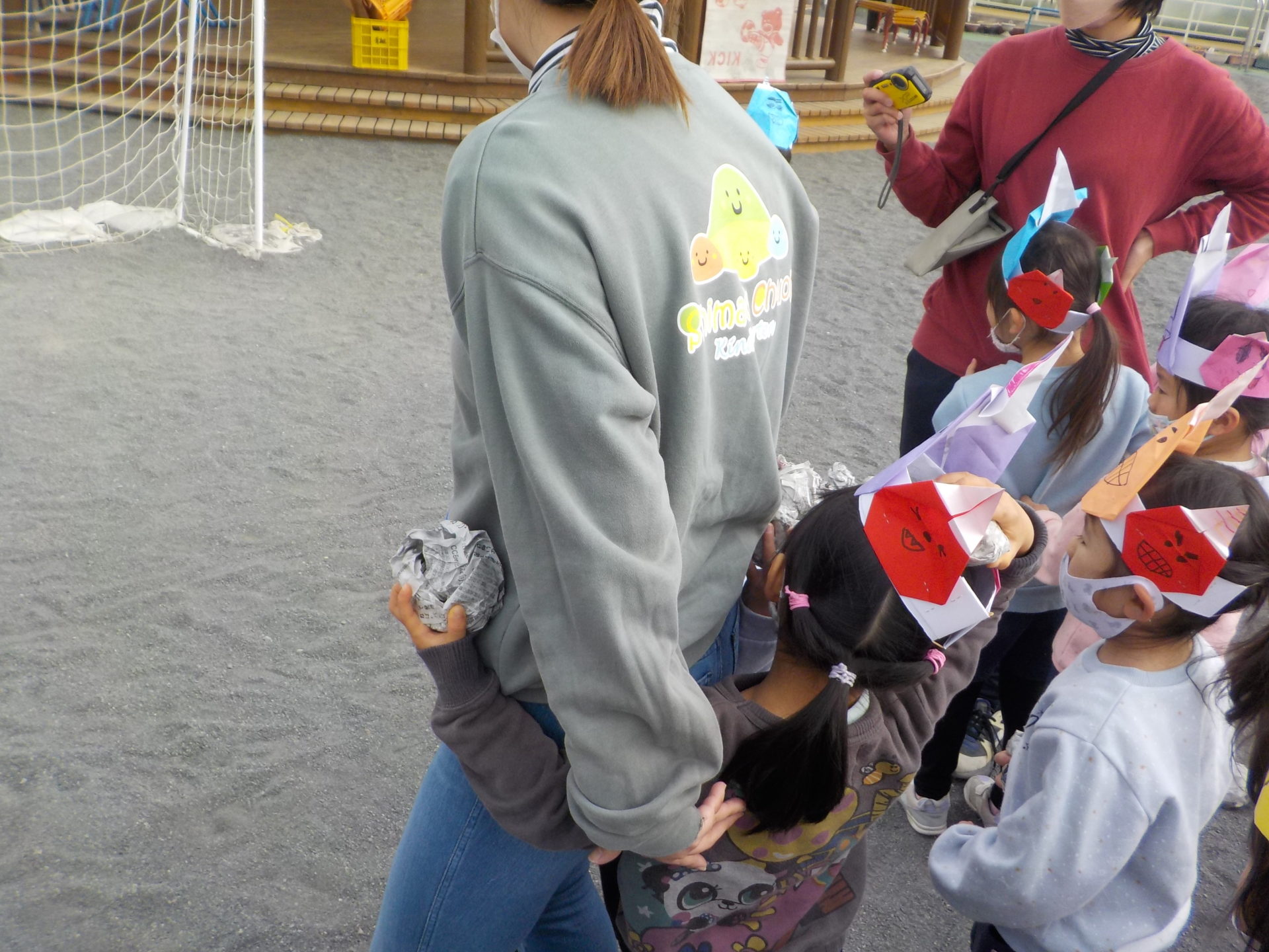 2月3日金曜日園庭で「鬼さんパラ」を踊り終わると・・・太鼓の音が鳴り響き、山から悪さをする鬼が降りてきました!!ちょっぴり怖かったけど、勇気を出して「鬼は~そと!」「福は~うち!」と、どんどん立ち向かっていく子もいれば、先生にしがみつきながら新聞紙豆を握りしめる子もいました。大きな声を出し、力いっぱい新聞紙豆を投げつけ、頑張って鬼退治しました。鬼が帰ると、福の神が現れ幸せをたくさん分けてくれましたよ♡