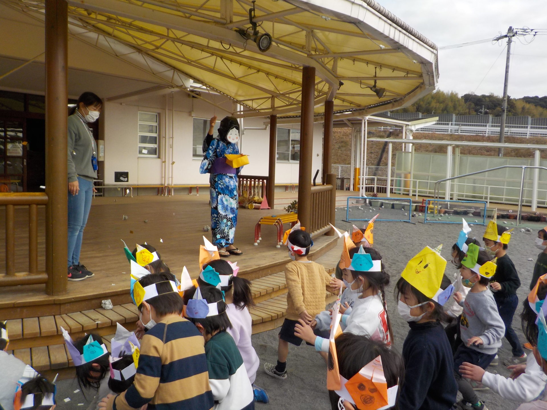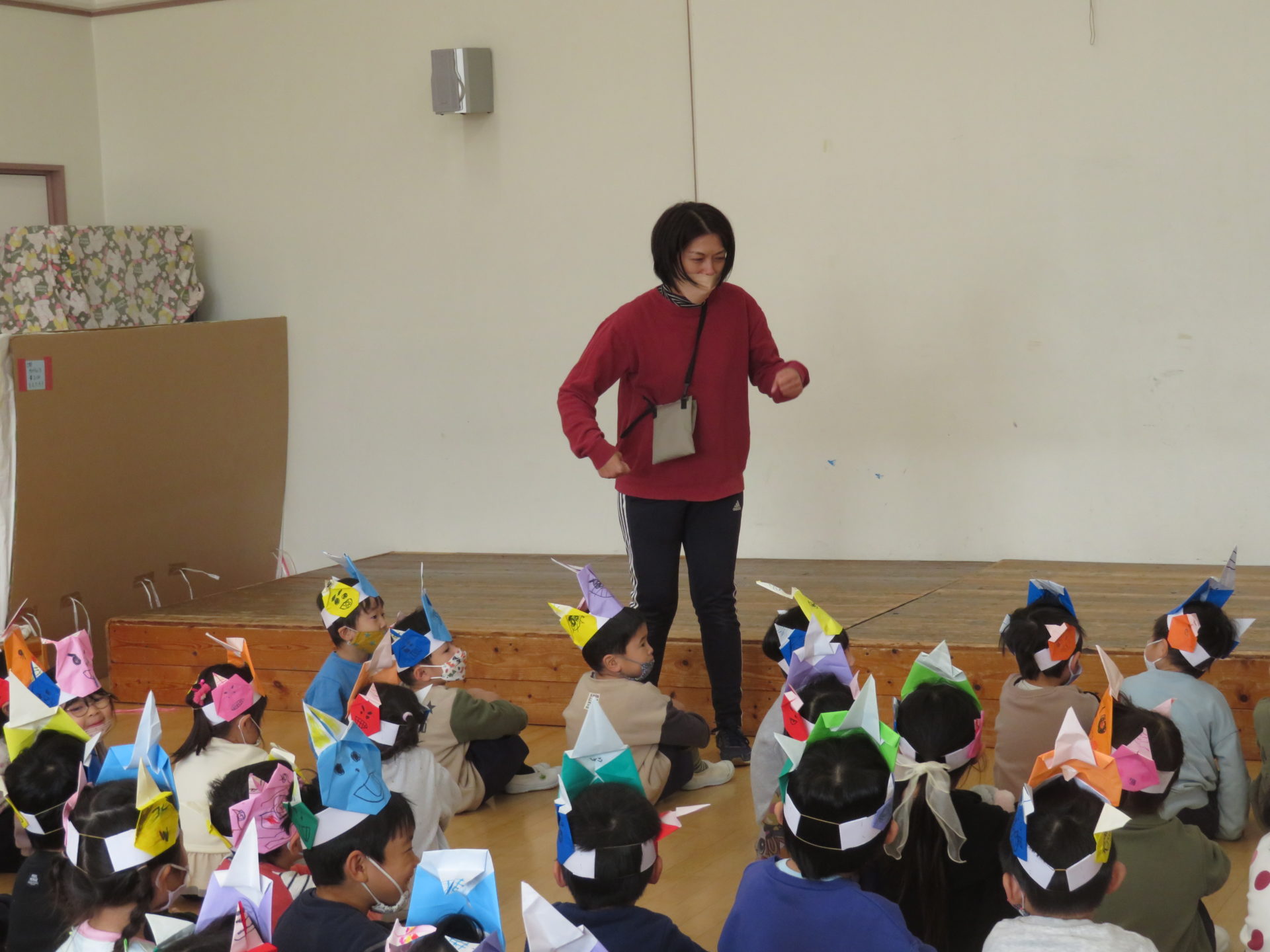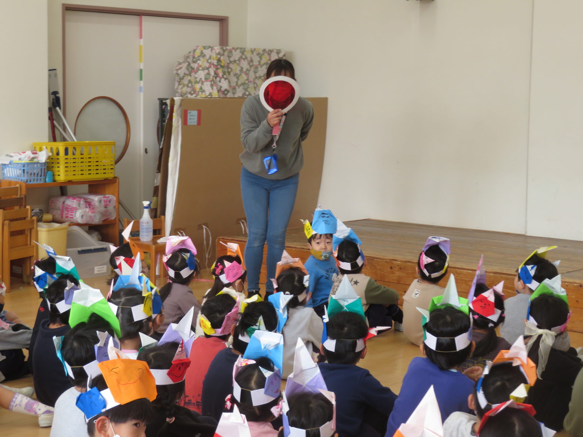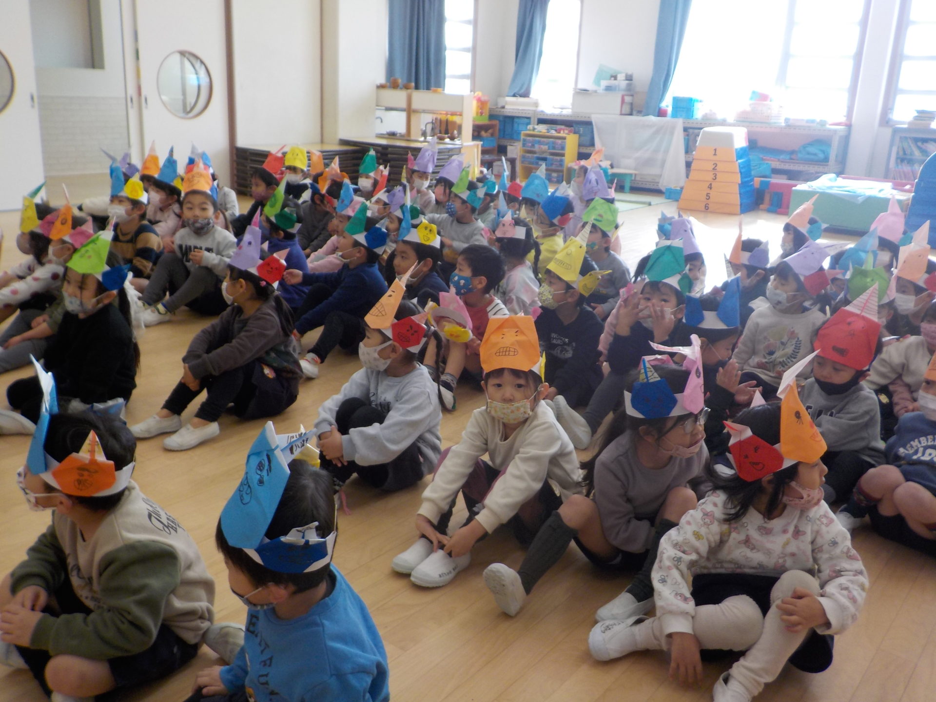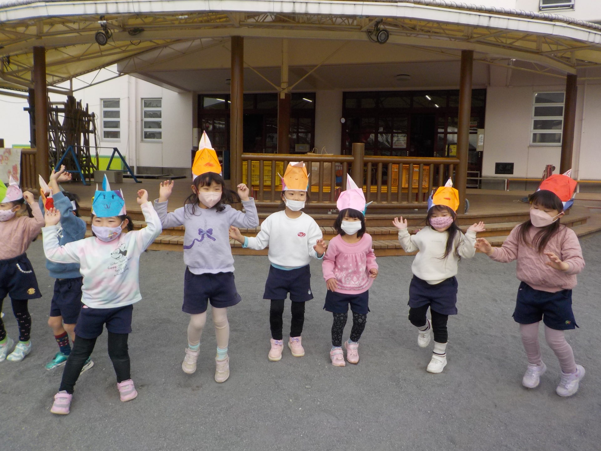 2月3日金曜日園庭で「鬼さんパラ」を踊り終わると・・・太鼓の音が鳴り響き、山から悪さをする鬼が降りてきました!!ちょっぴり怖かったけど、勇気を出して「鬼は~そと!」「福は~うち!」と、どんどん立ち向かっていく子もいれば、先生にしがみつきながら新聞紙豆を握りしめる子もいました。大きな声を出し、力いっぱい新聞紙豆を投げつけ、頑張って鬼退治しました。鬼が帰ると、福の神が現れ幸せをたくさん分けてくれましたよ♡