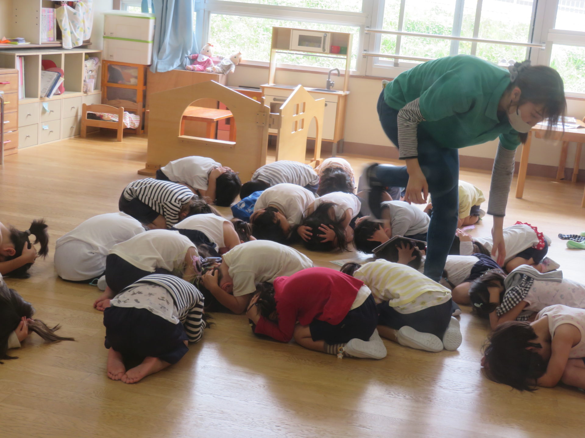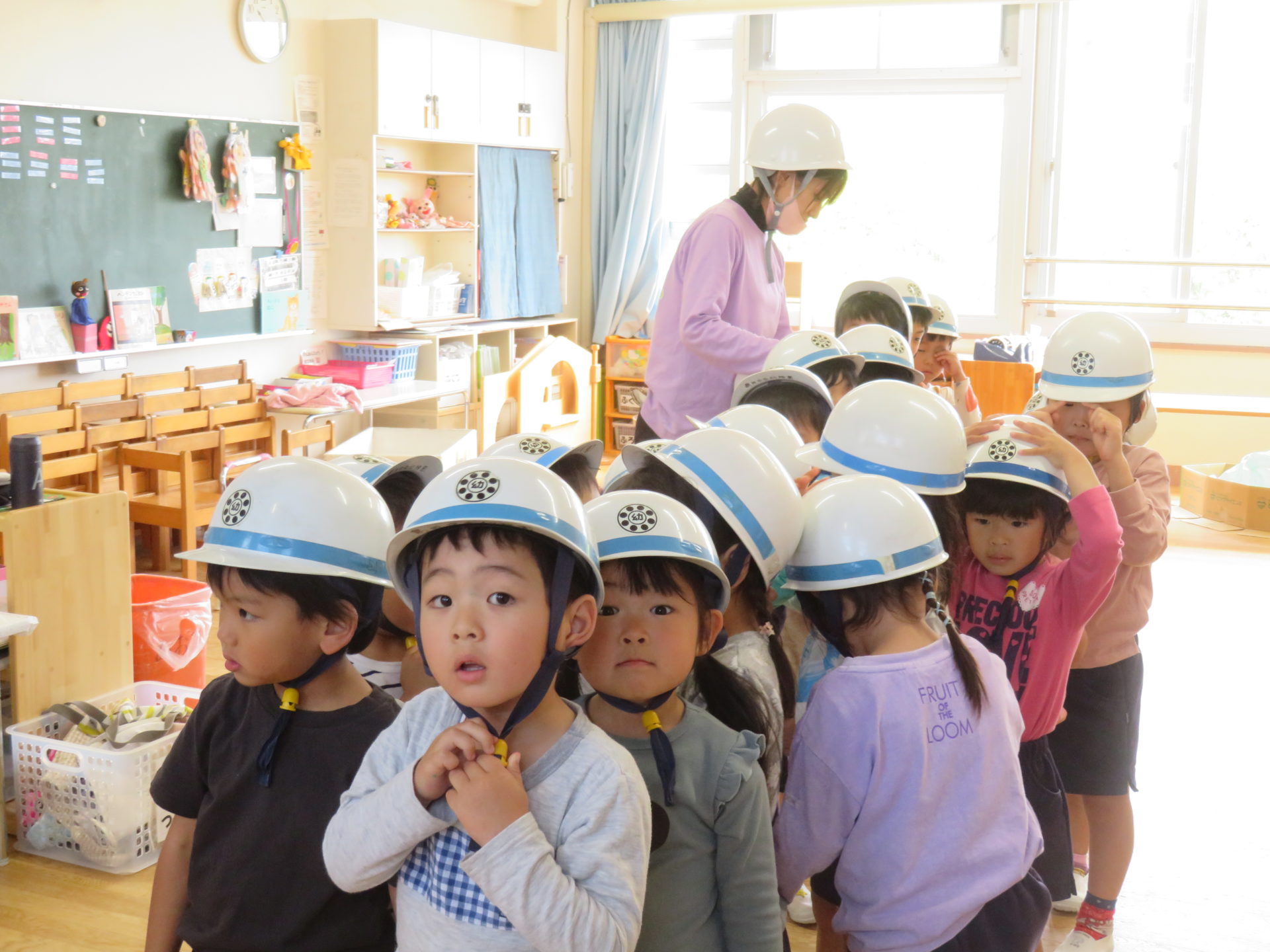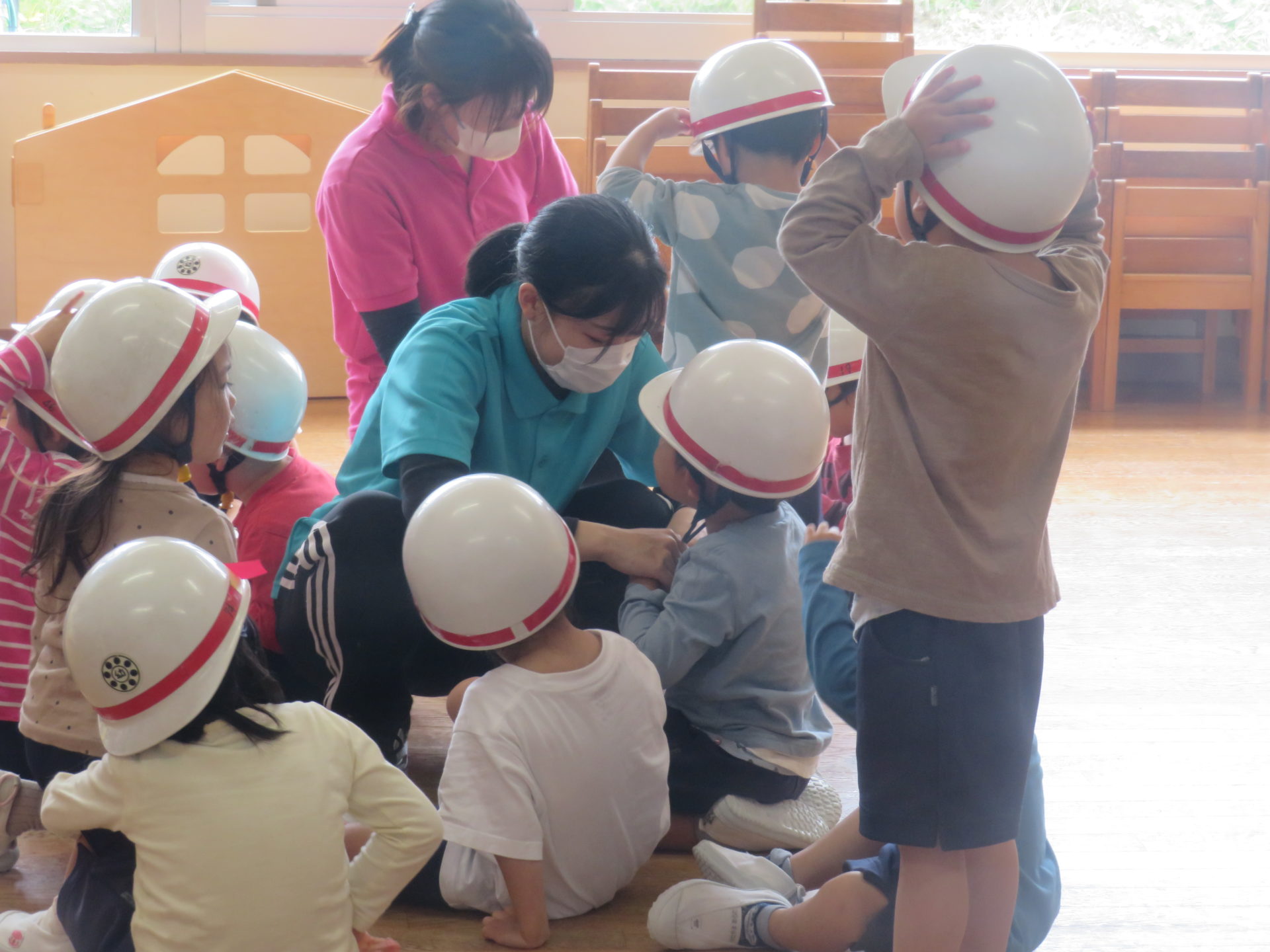 5月15日に保育室での活動中に地震が発生したと想定した訓練を行いました。今回のねらいは、①訓練の合図を知る②一次避難の仕方を知る(ヘルメットの着用の仕方を覚える)でした。告知を受け、机の下に隠れる事やダンゴムシのように丸まり、身を守る動作を学びました。また、『お・は・し』(おさない・はしらない・しゃべらない)についても先生から話を聞き、地震の時の大切なことを確認した一日となりました。