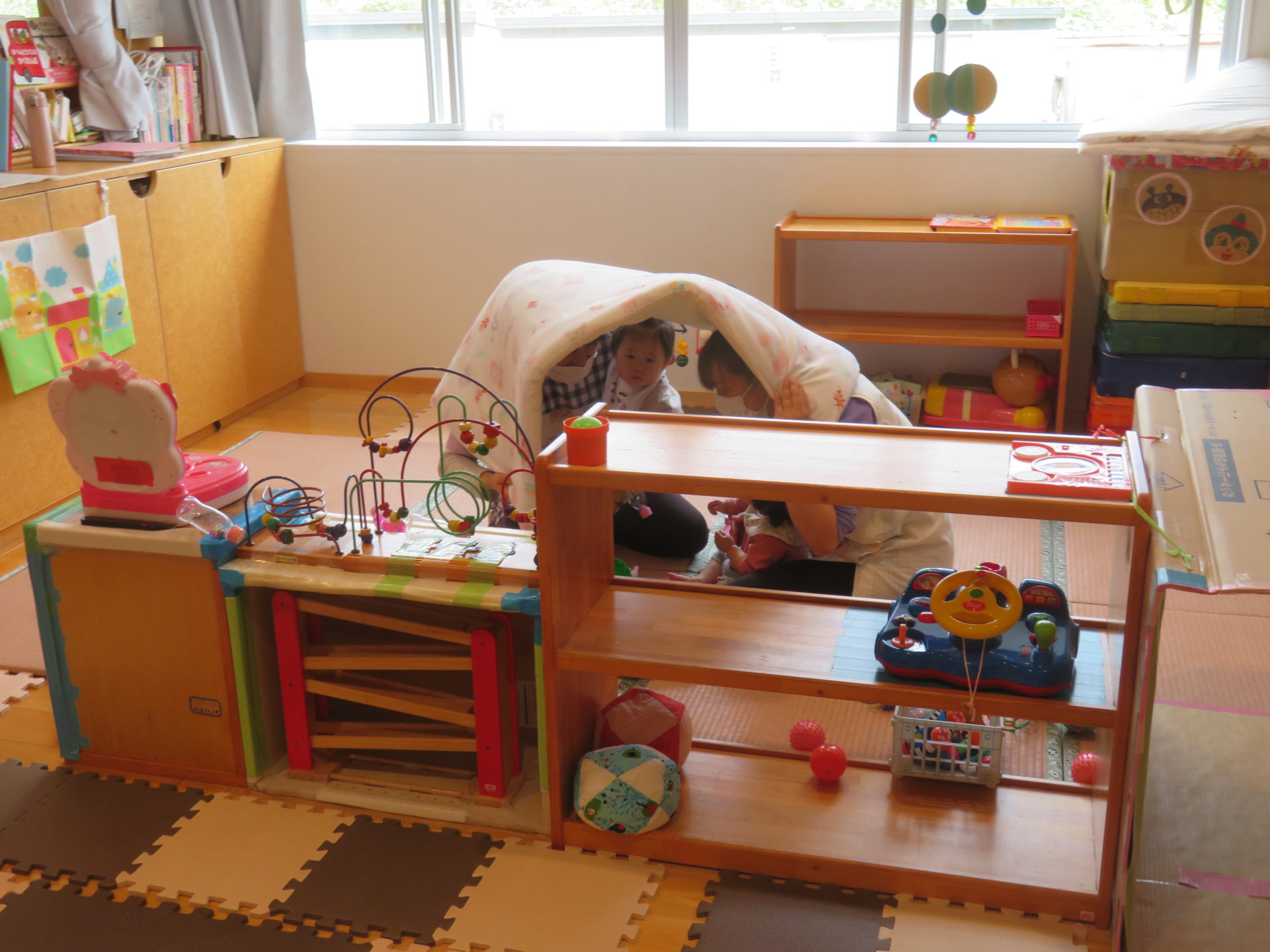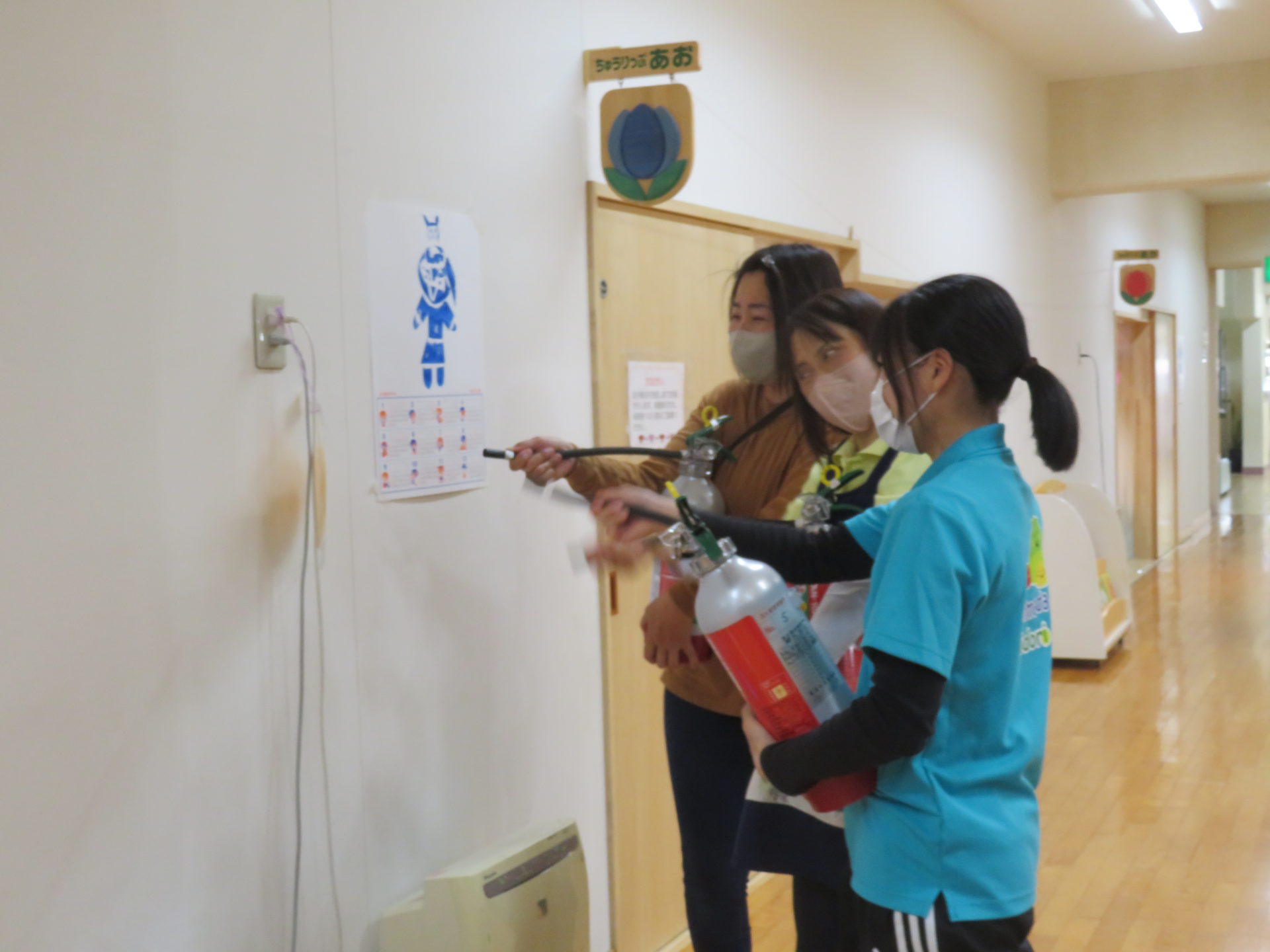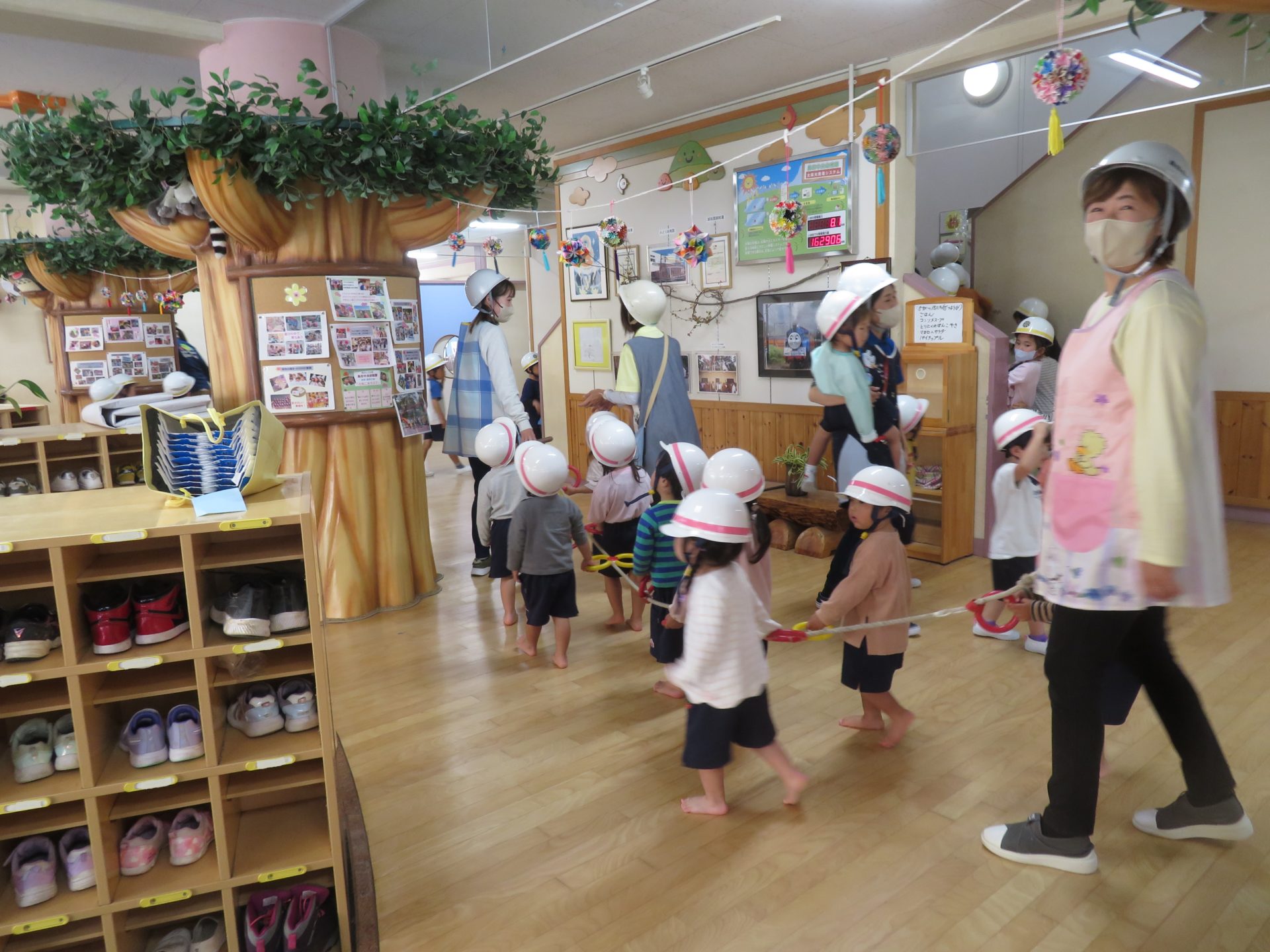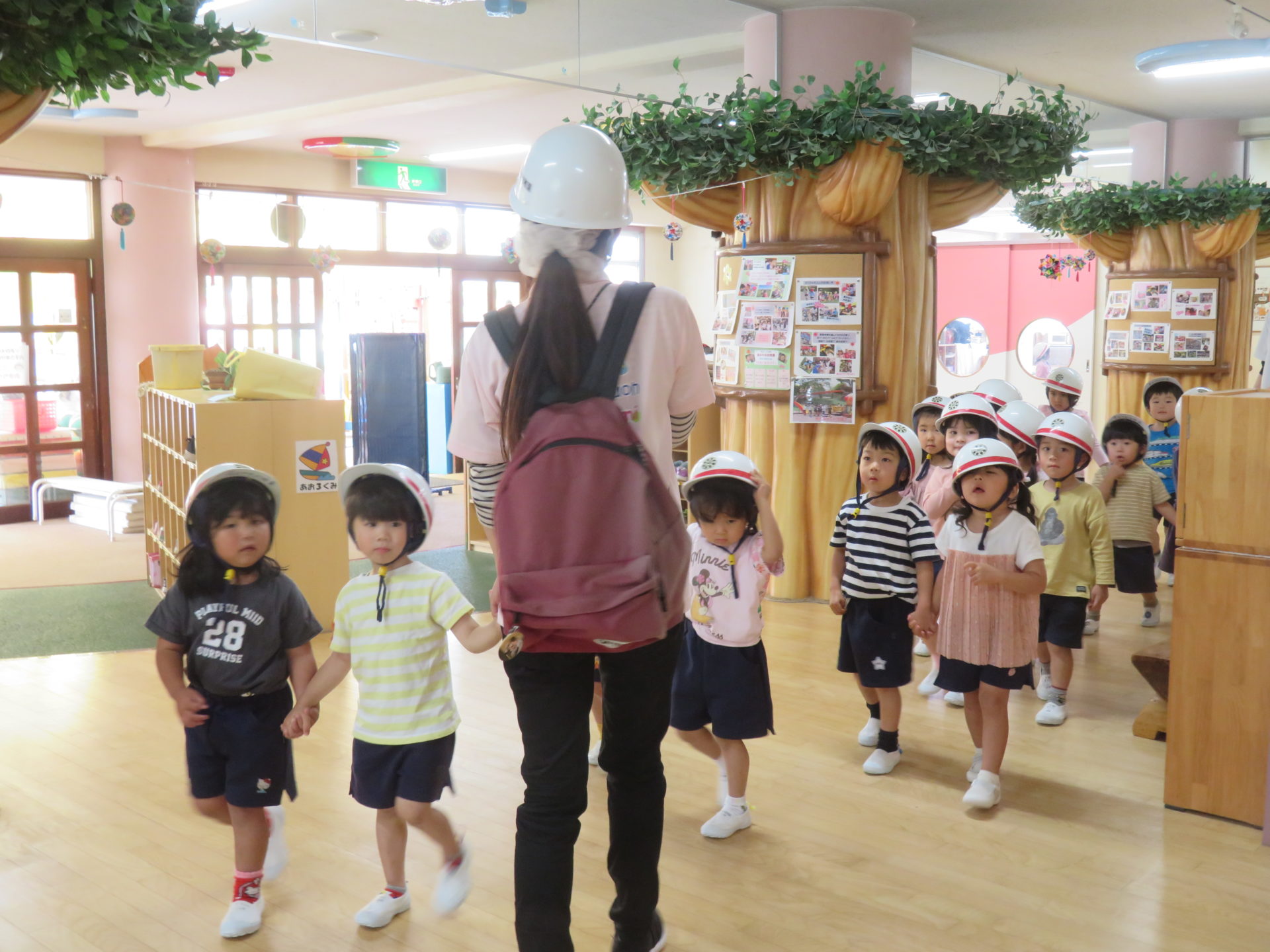 5月15日に保育室での活動中に地震が発生したと想定した訓練を行いました。今回のねらいは、①訓練の合図を知る②一次避難の仕方を知る(ヘルメットの着用の仕方を覚える)でした。告知を受け、机の下に隠れる事やダンゴムシのように丸まり、身を守る動作を学びました。また、『お・は・し』(おさない・はしらない・しゃべらない)についても先生から話を聞き、地震の時の大切なことを確認した一日となりました。