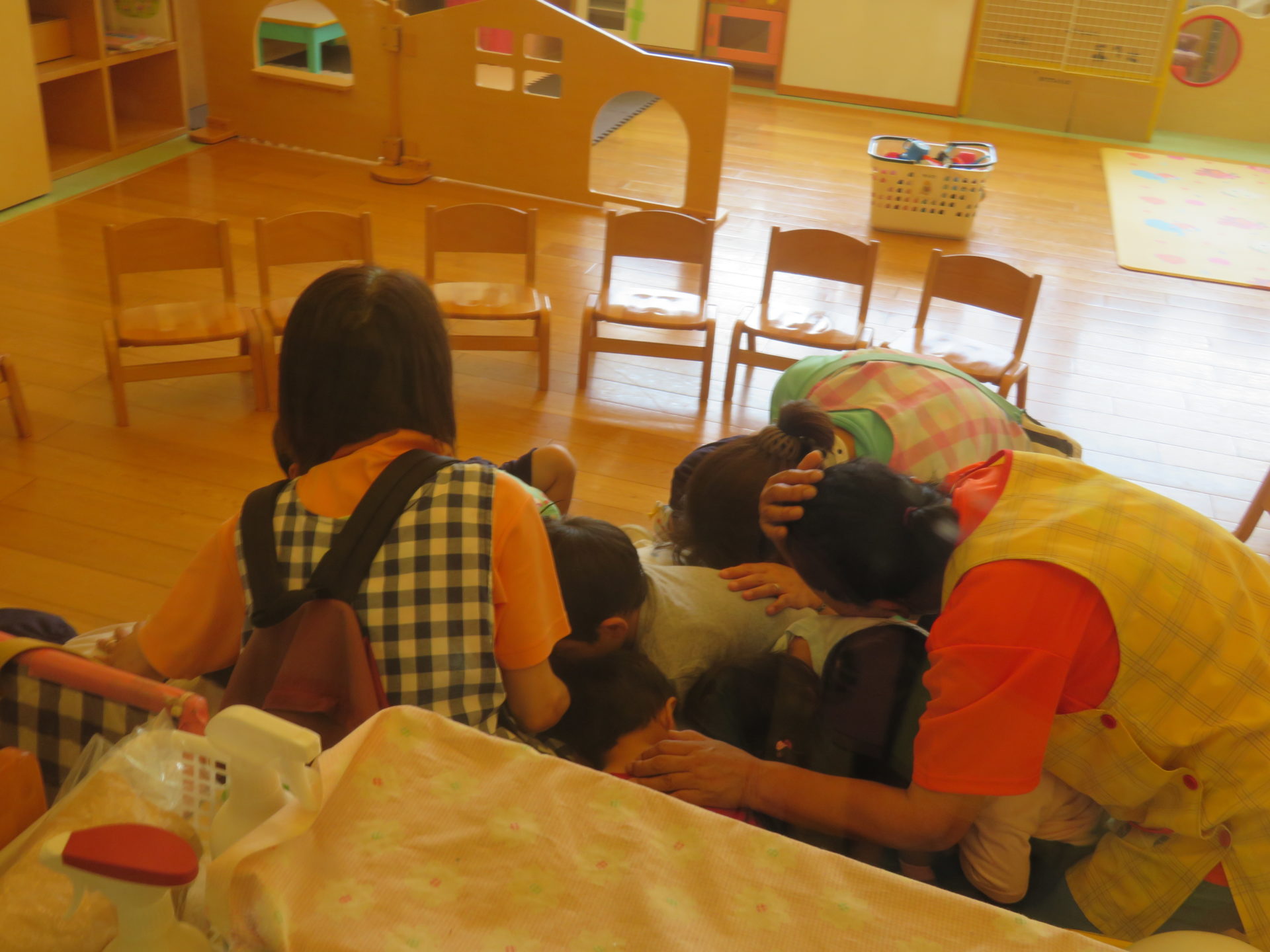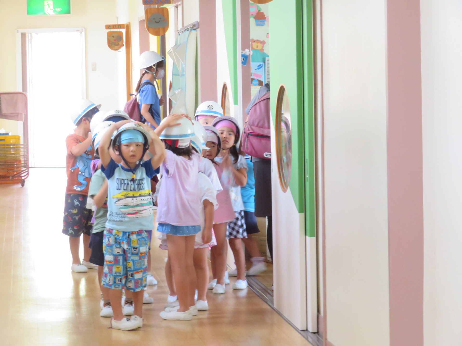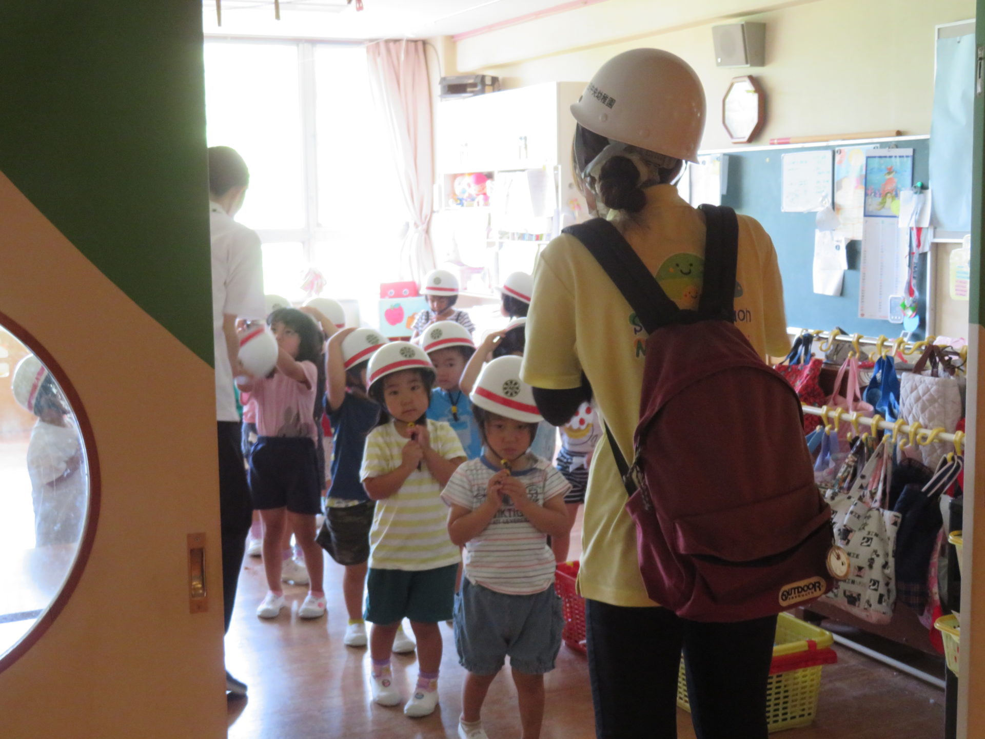 7月3日に避難訓練を行いました。今回は地震発生を想定した訓練(1次避難→園庭へ避難)で、保育室で身を守り、ヘルメットを被り避難をするというものでした。回数を重ねていく中で、子どもたちは避難の時のお約束を守り、上手に避難が出来るようになってきました。