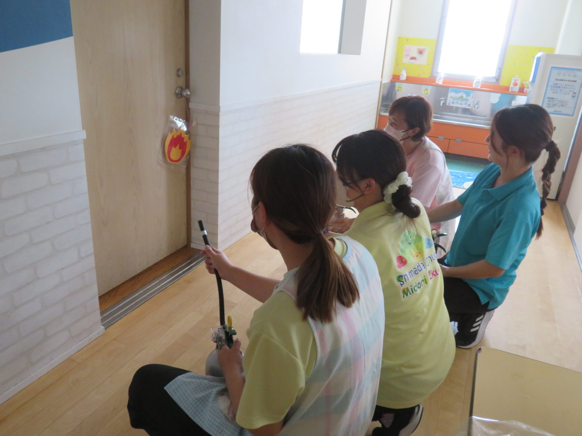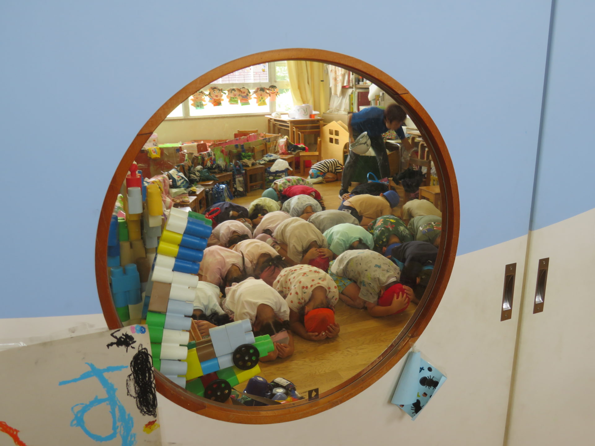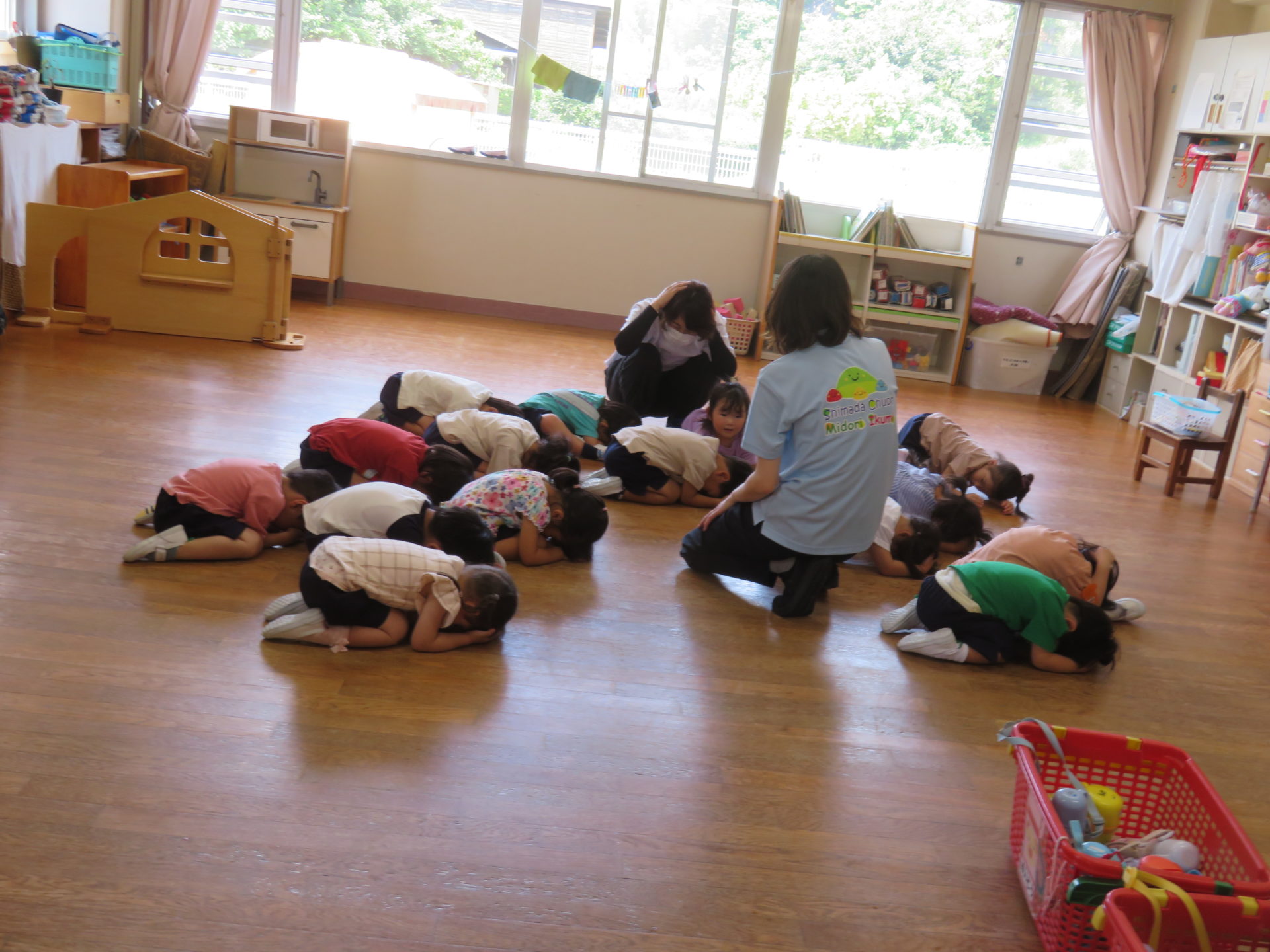 7月3日に避難訓練を行いました。今回は地震発生を想定した訓練(1次避難→園庭へ避難)で、保育室で身を守り、ヘルメットを被り避難をするというものでした。回数を重ねていく中で、子どもたちは避難の時のお約束を守り、上手に避難が出来るようになってきました。