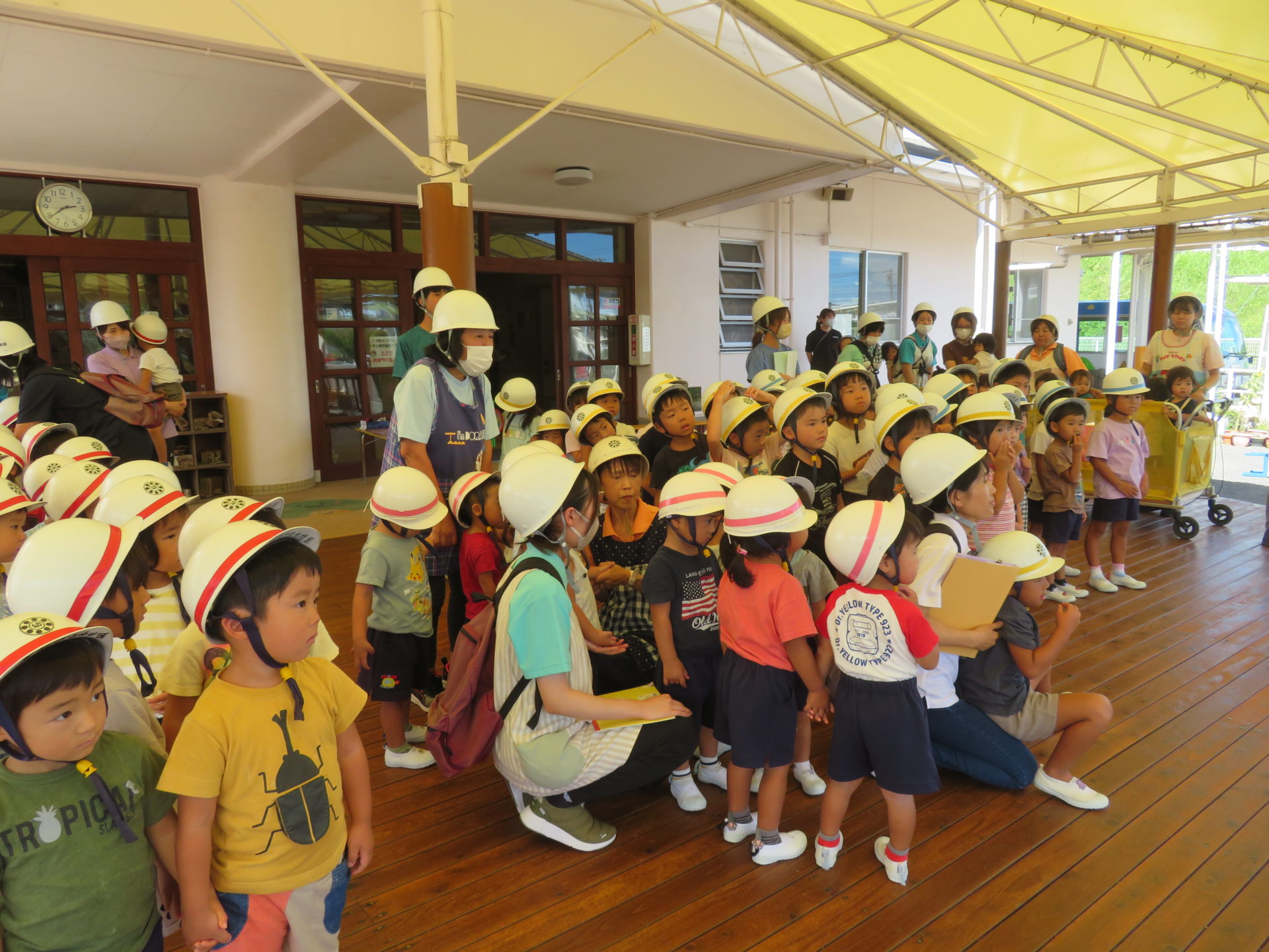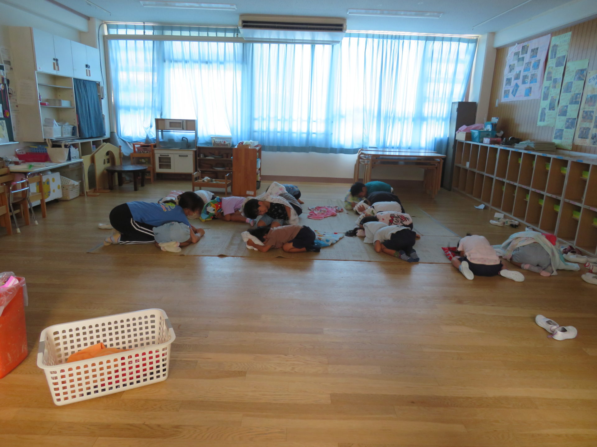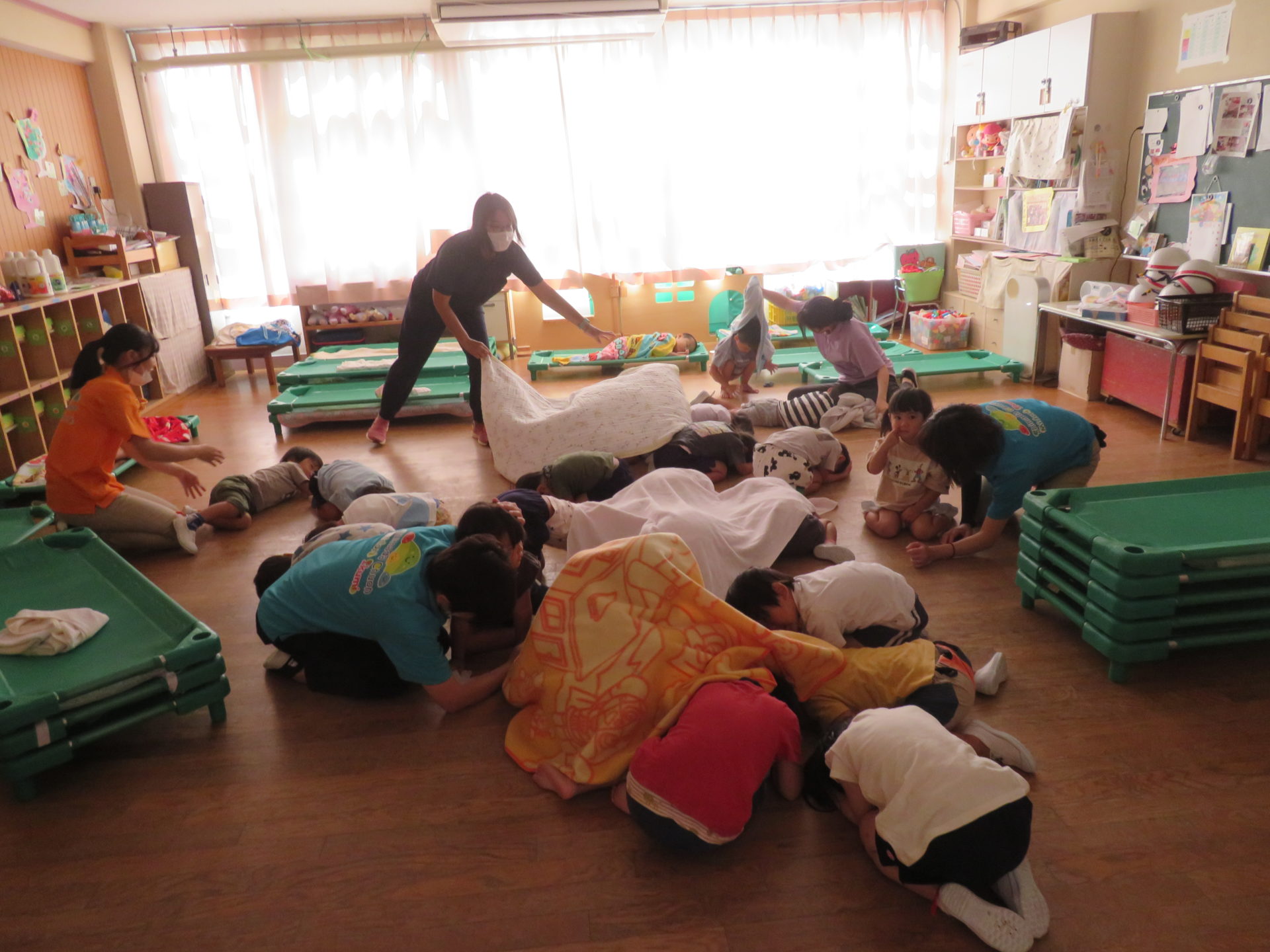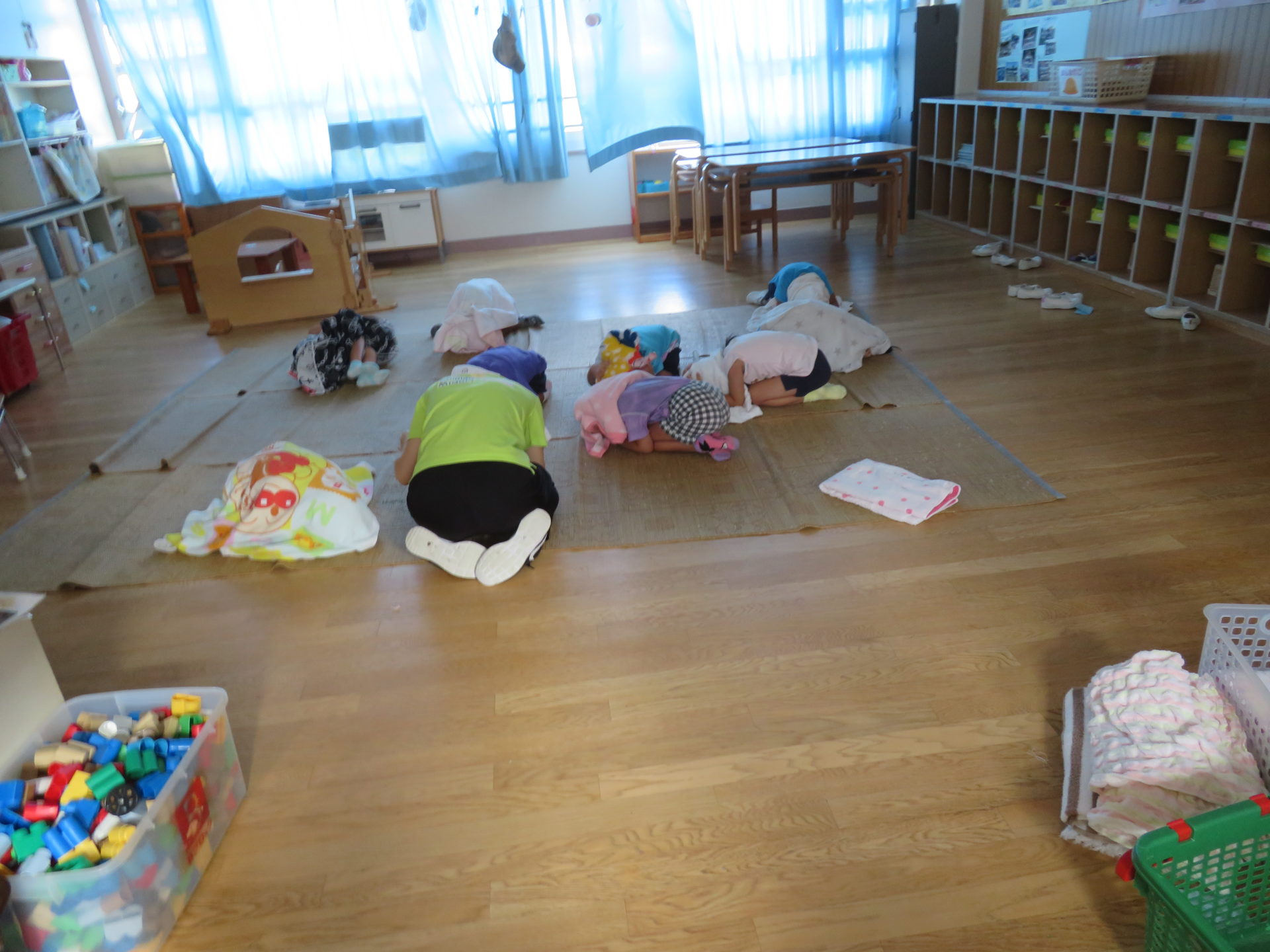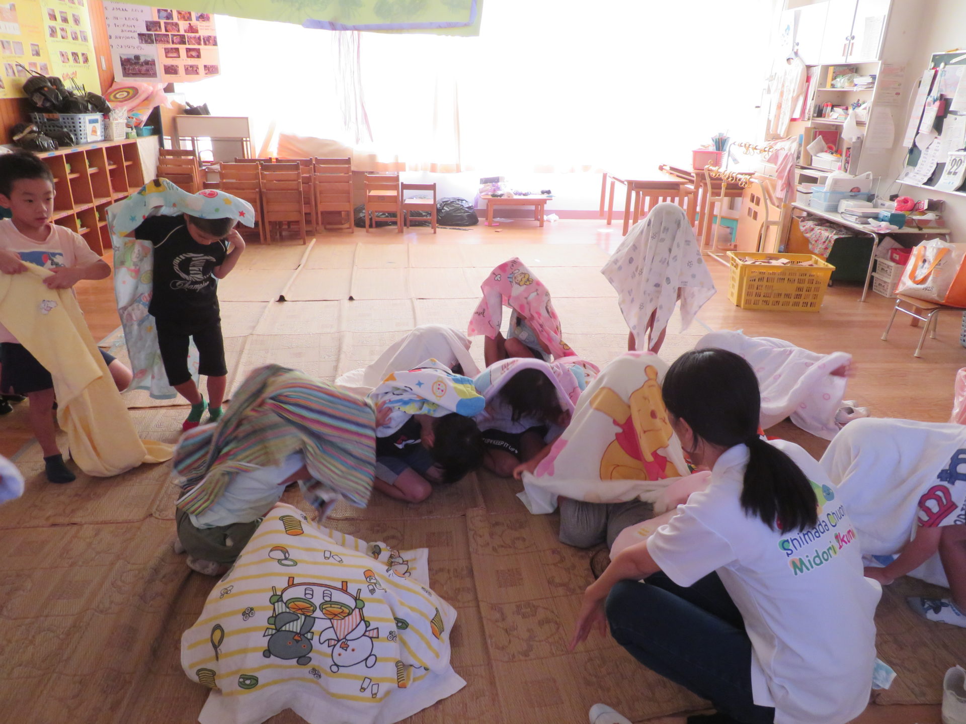 8月22日に避難訓練が行われました。“お昼寝中に地震が起きた場合”を想定して行われました。“タオルで頭を守りダンゴムシのポーズをとる”ということを事前に伝え訓練に取り組みました。暑い中での訓練でしたが、子どもたちは真剣に取り組んでいました。