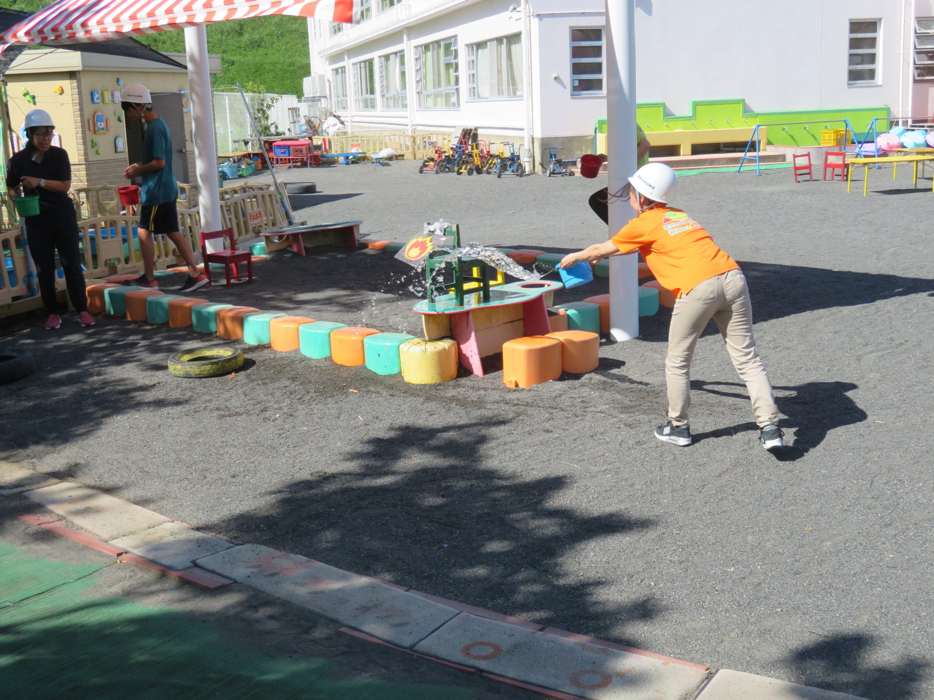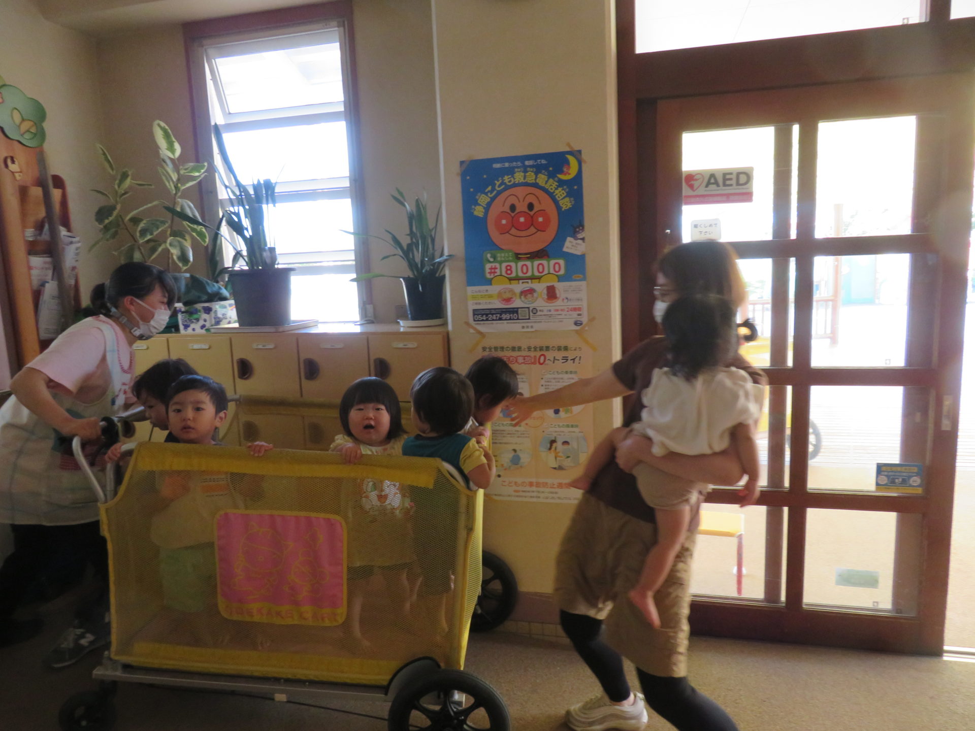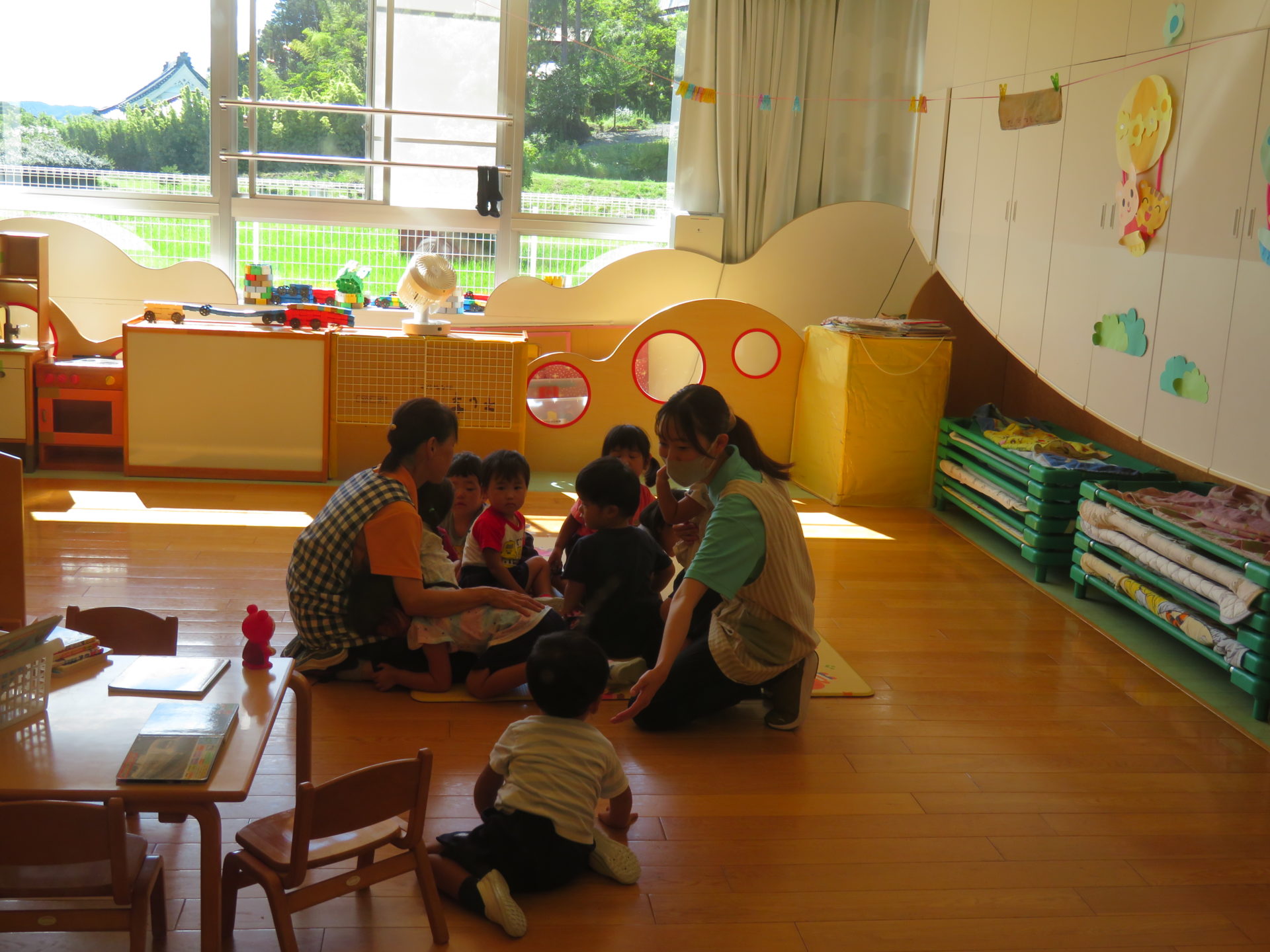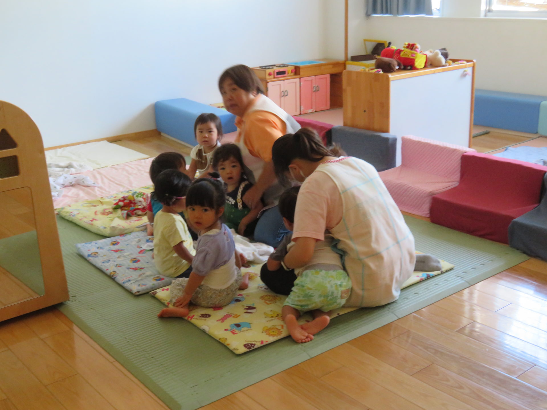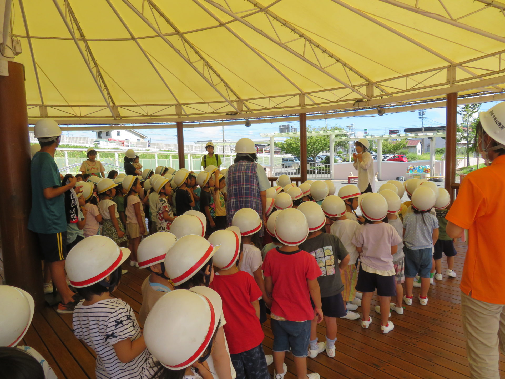 8月22日に避難訓練が行われました。“お昼寝中に地震が起きた場合”を想定して行われました。“タオルで頭を守りダンゴムシのポーズをとる”ということを事前に伝え訓練に取り組みました。暑い中での訓練でしたが、子どもたちは真剣に取り組んでいました。