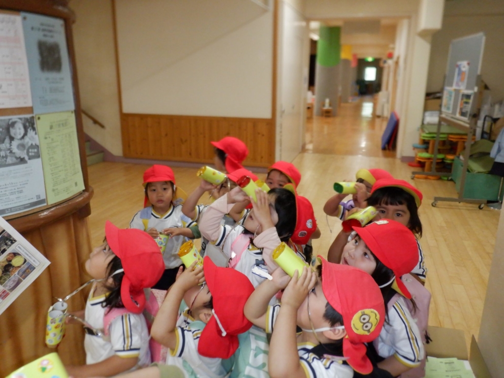 今日は遠足に行く練習の日、遠足ごっこの日です。前日、お弁当を持って、探検に行くことを伝えると、ワクワクしている様子の子どもたち。当日は、いつもと違う体操服での登園にとても嬉しそうです。それぞれのお部屋で始めに望遠鏡を作りました。そしてリ... -