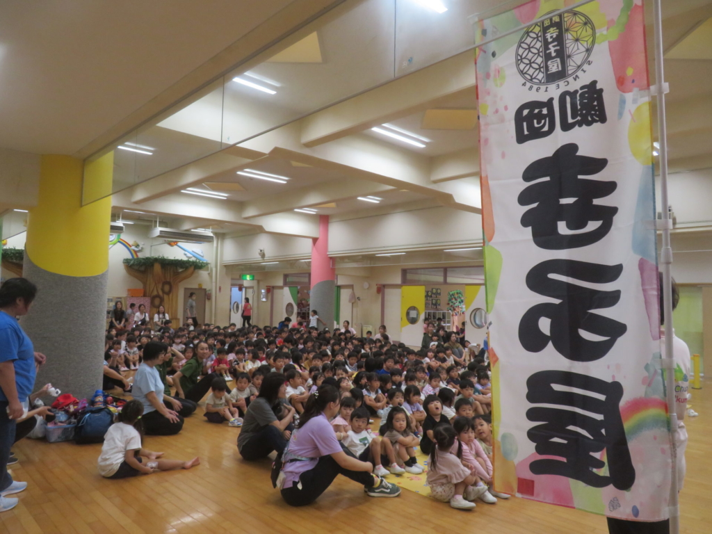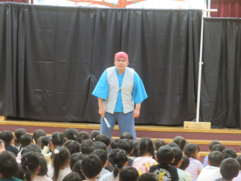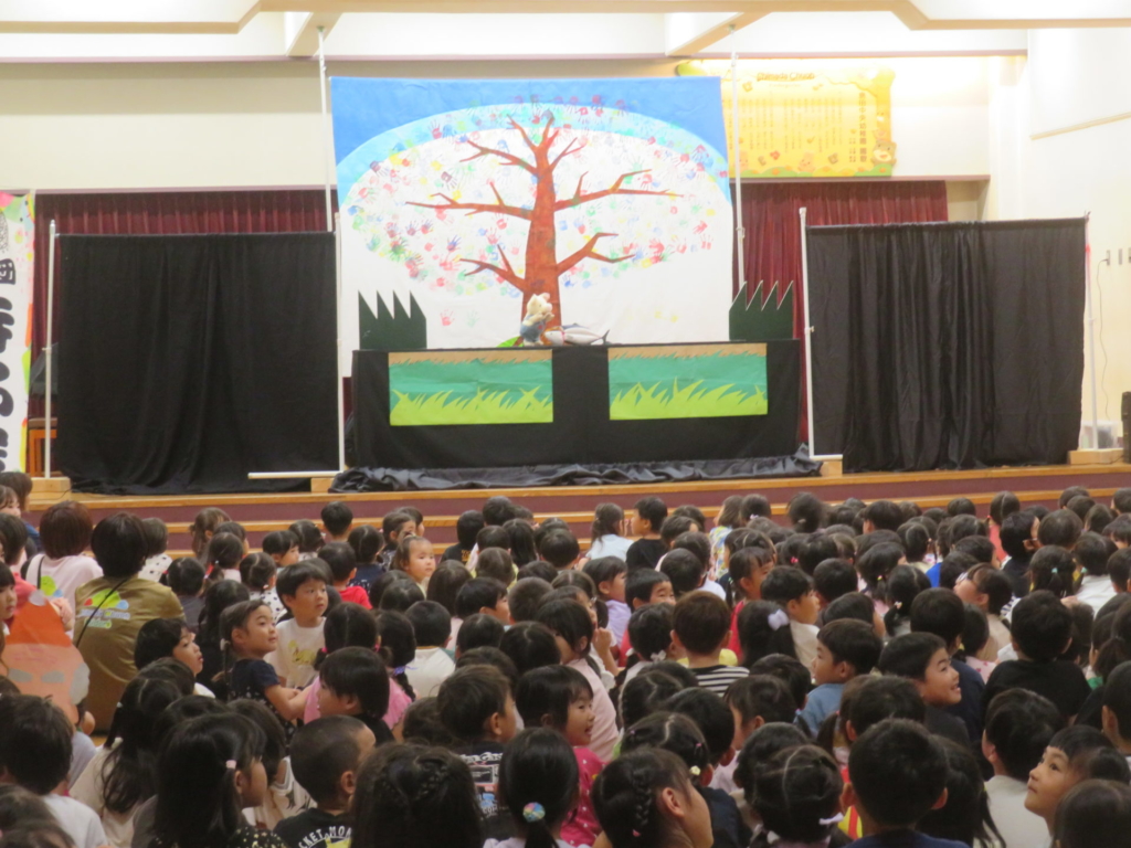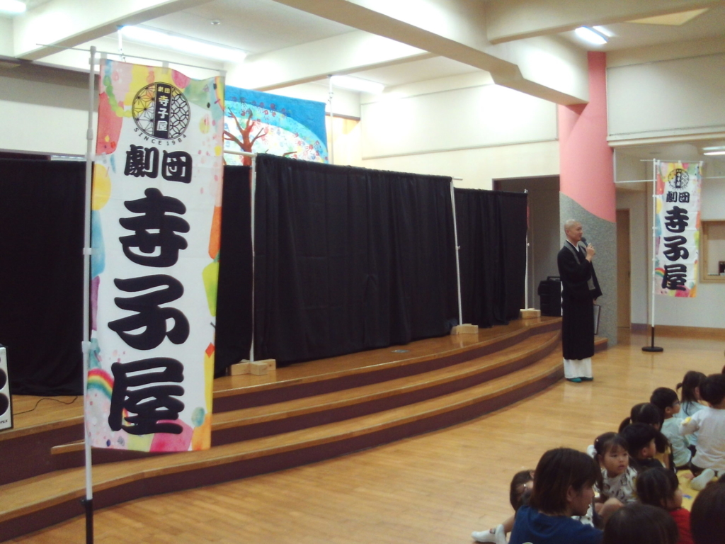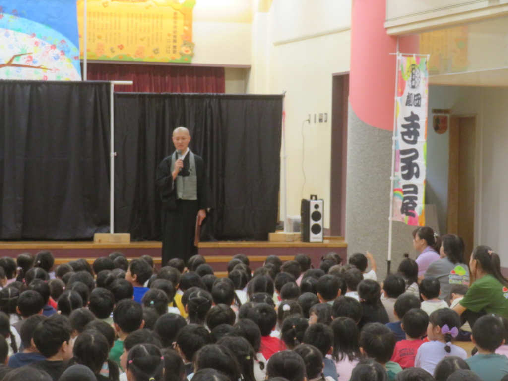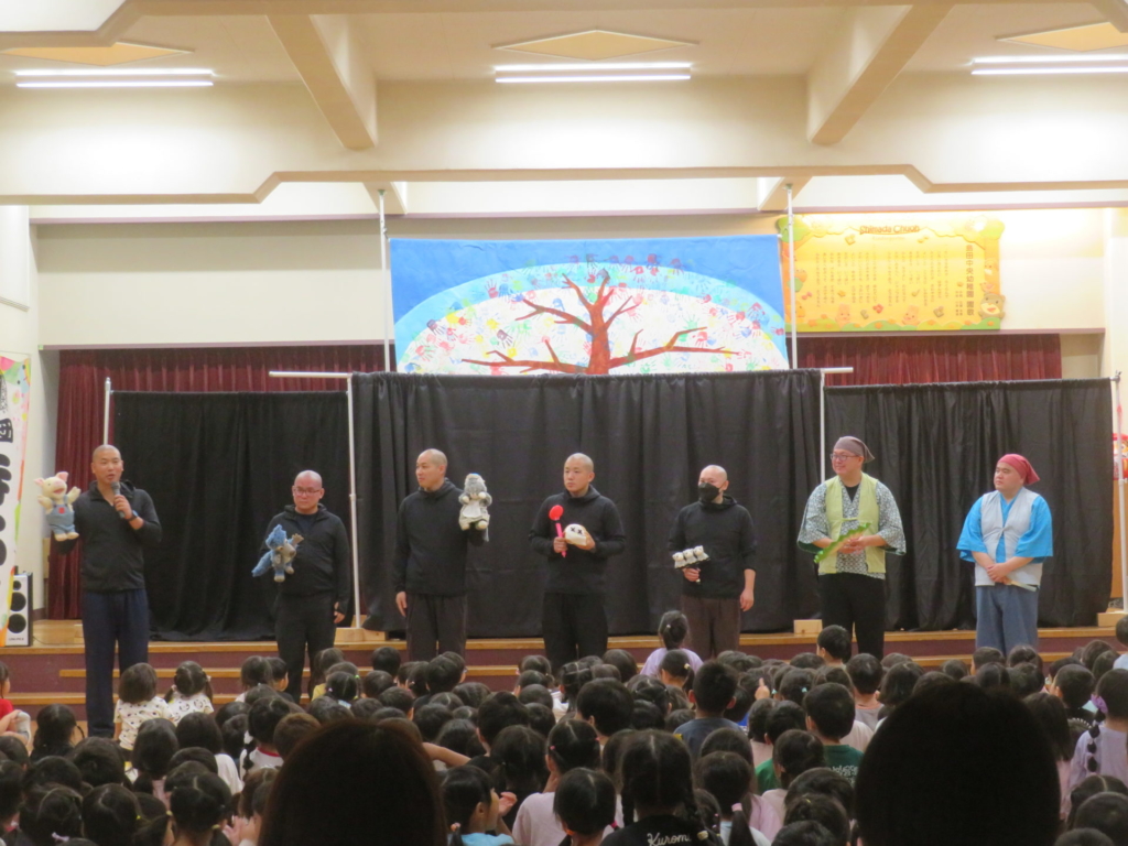 寺子屋さんが来てくれたよ!(全園児) 2025 10/14 ブログ 2025.10.14 10月10日、2園合同の観劇が行われました。今回は、志太仏教会若手のご住職さんで構成された”劇団寺子屋”が来てくれました。人形劇「にこにこパン」と狂言「たぬきたいじ」を観て、子どもたちは大喜び!笑いが溢れた合同観劇となりました。 ブログ 大祭後の遊び・・・