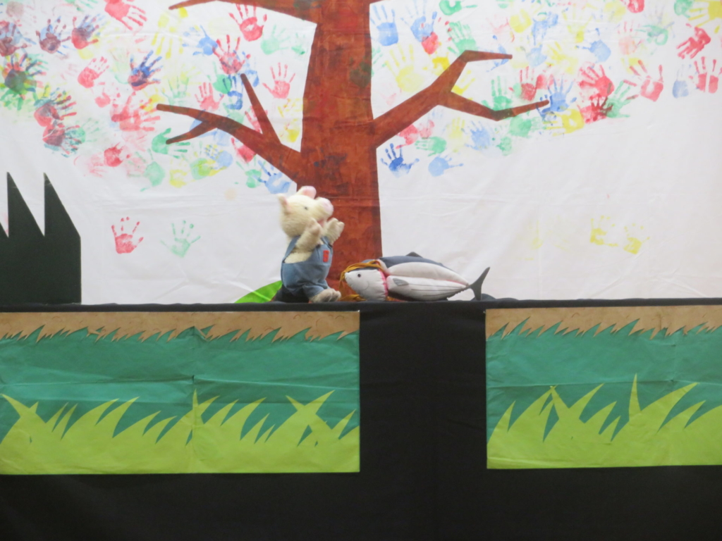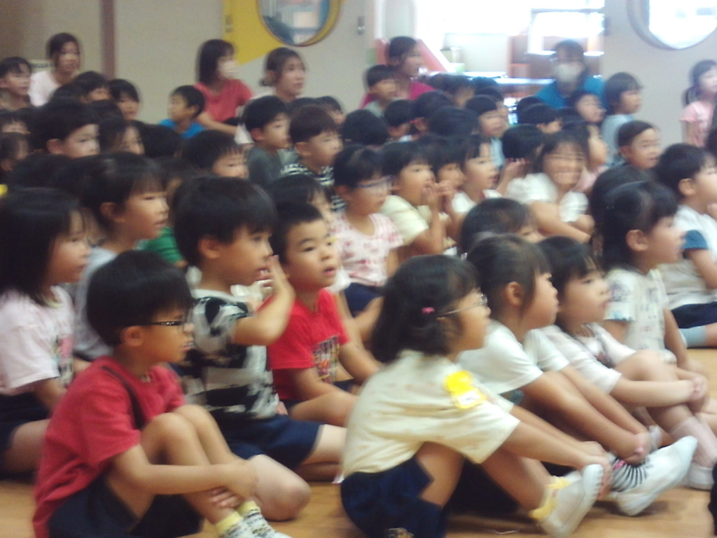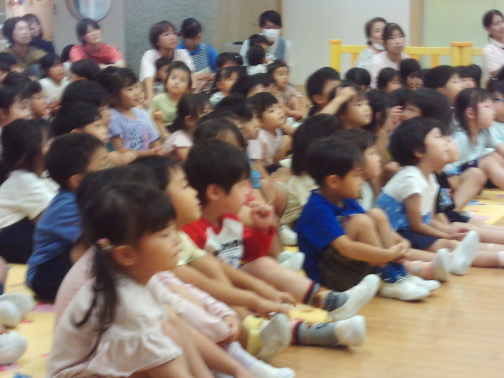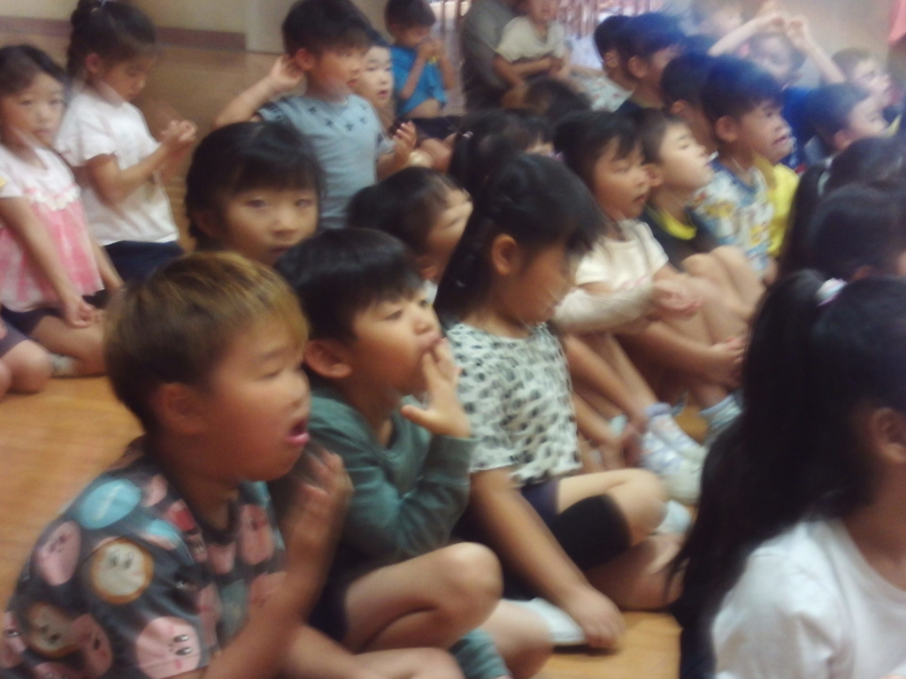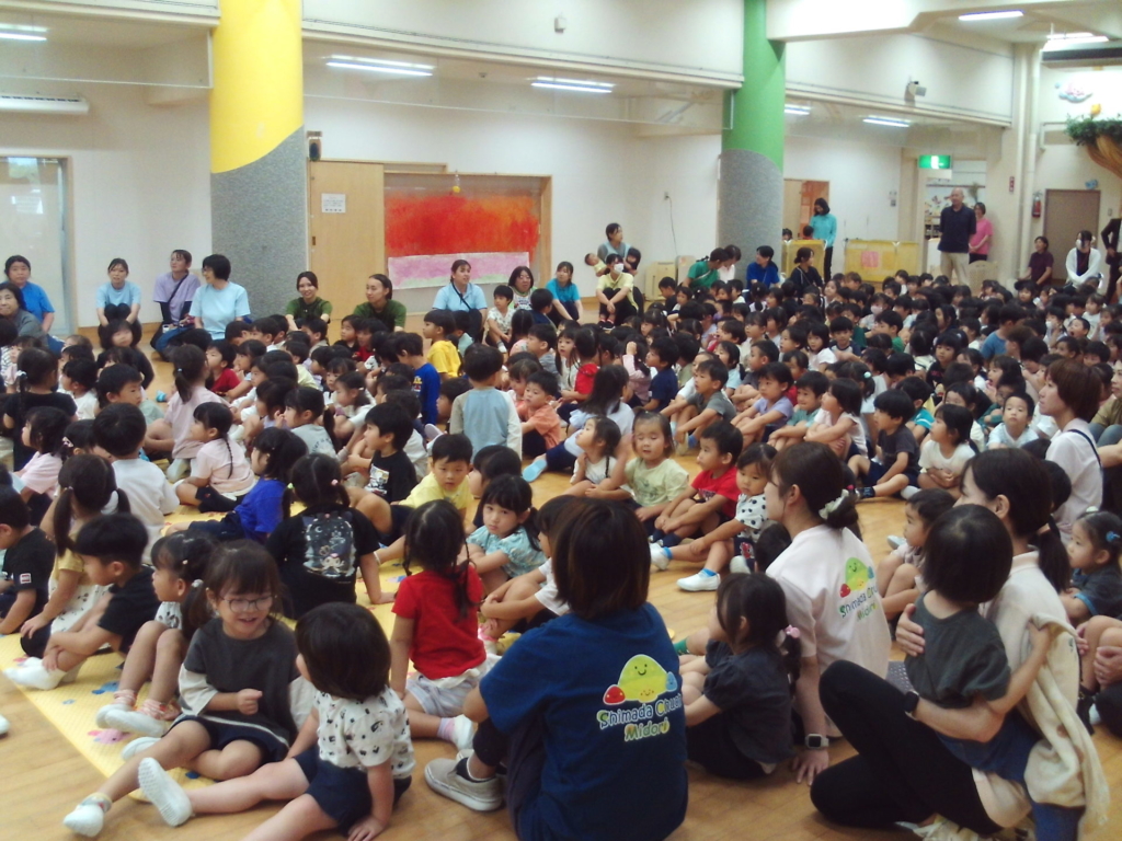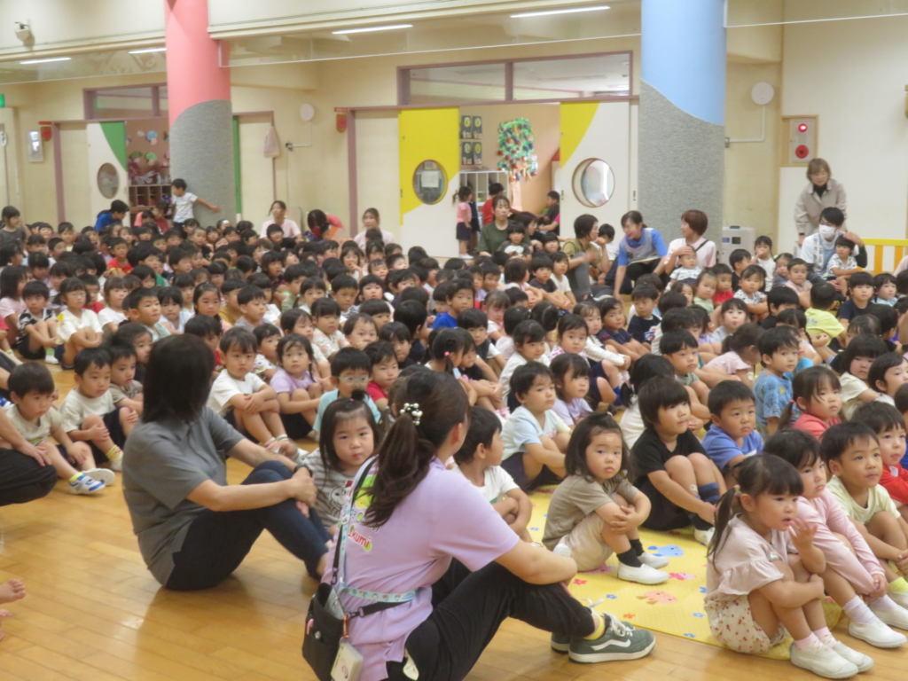 寺子屋さんが来てくれたよ!(全園児) 2025 10/14 ブログ 2025.10.14 10月10日、2園合同の観劇が行われました。今回は、志太仏教会若手のご住職さんで構成された”劇団寺子屋”が来てくれました。人形劇「にこにこパン」と狂言「たぬきたいじ」を観て、子どもたちは大喜び!笑いが溢れた合同観劇となりました。 ブログ 大祭後の遊び・・・