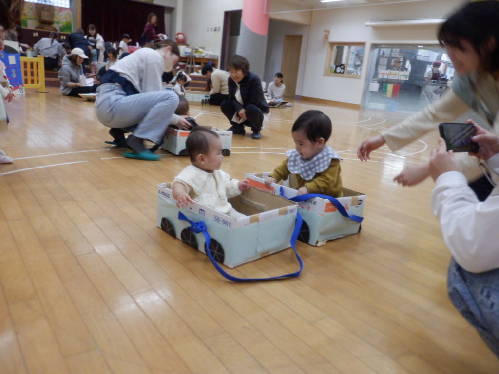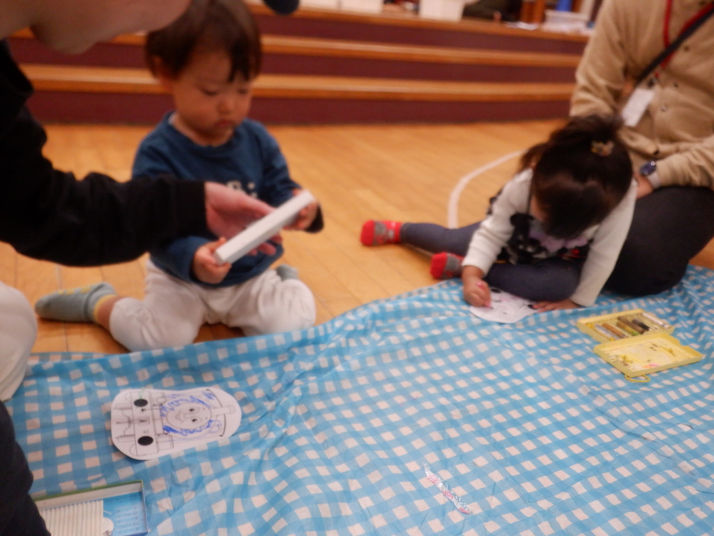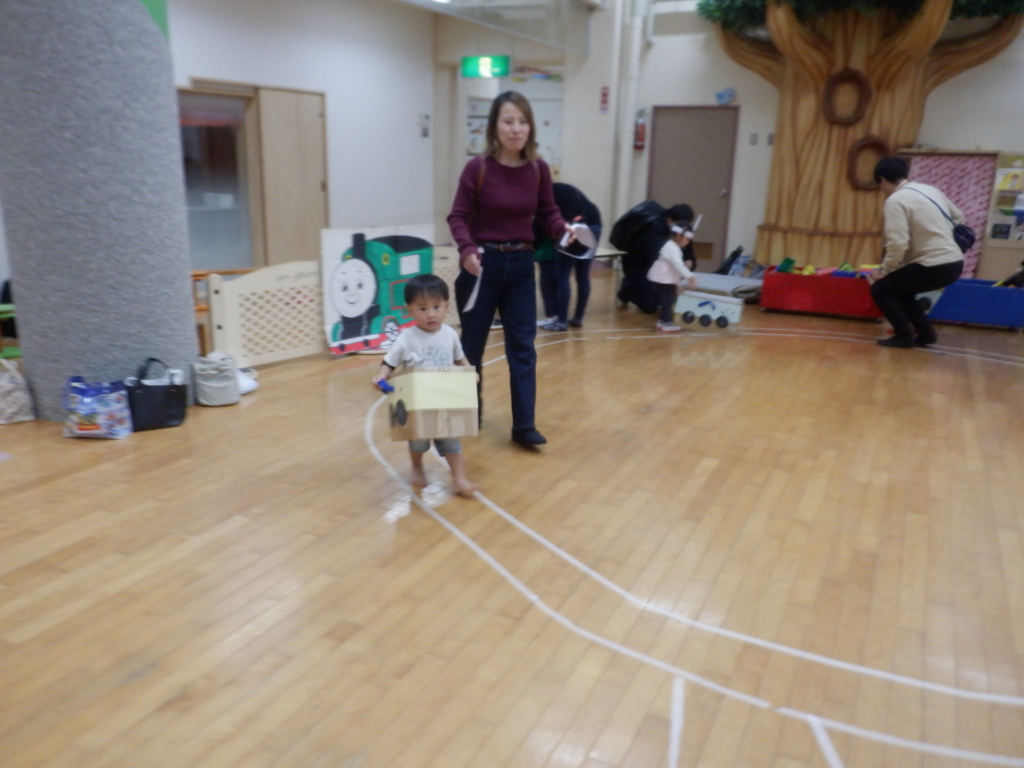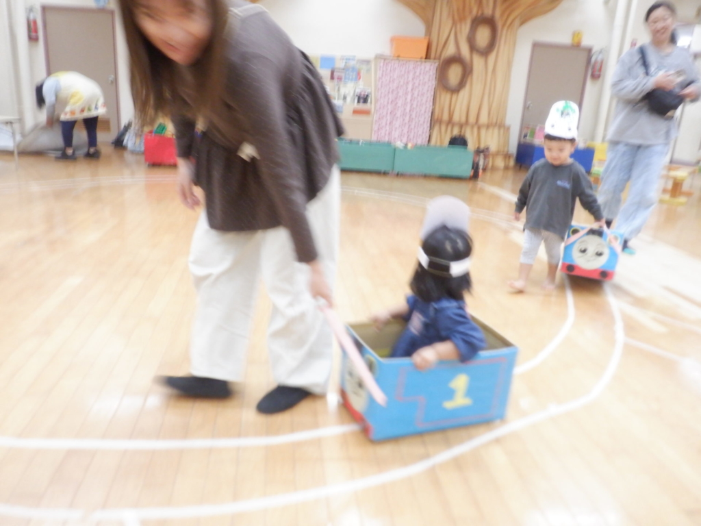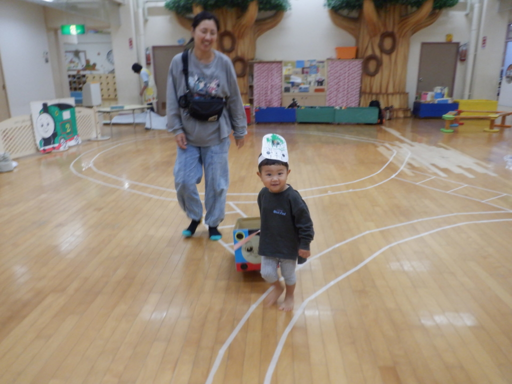 10月22日のてんとうむしクラブは、電車ごっこを楽しみました。電車にシールでデコレーションをして、オリジナルの電車に乗って「しゅっぱつしんこ~う!」。駅に到着したら、スタンプを押し何度も何度も線路を行ったり来たりしました。電車はホールを飛び出し電車は進み、赤組さんのクラスや給食室などを見に出掛けるなど、電車遊びを楽しみました。