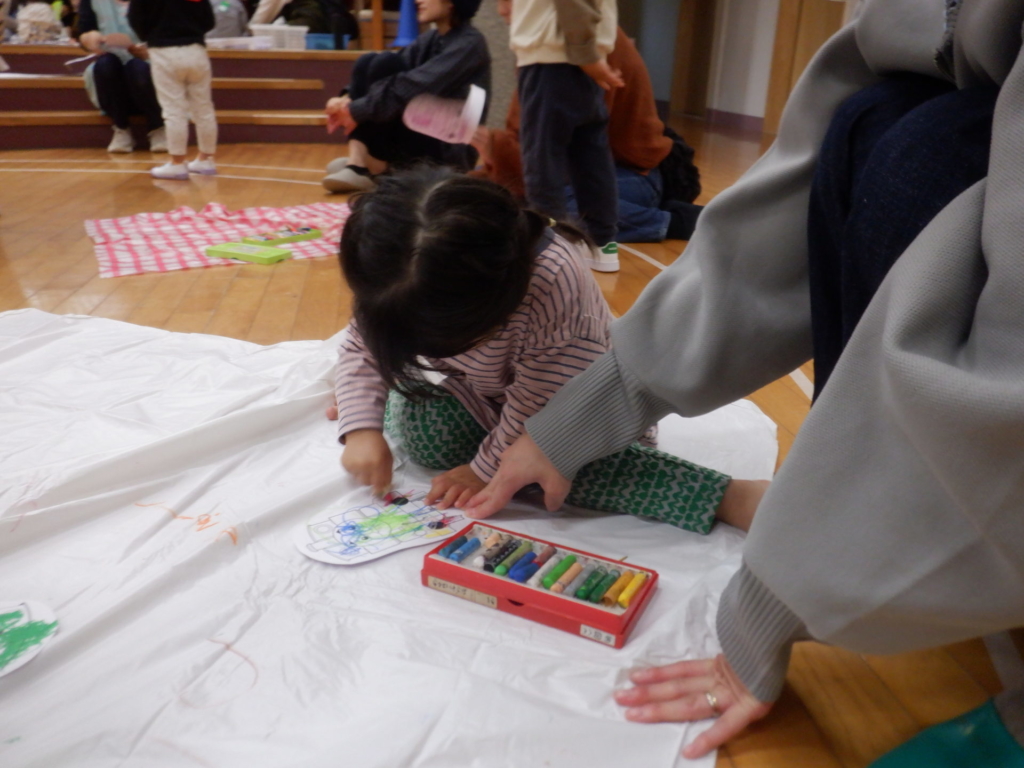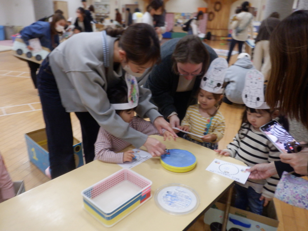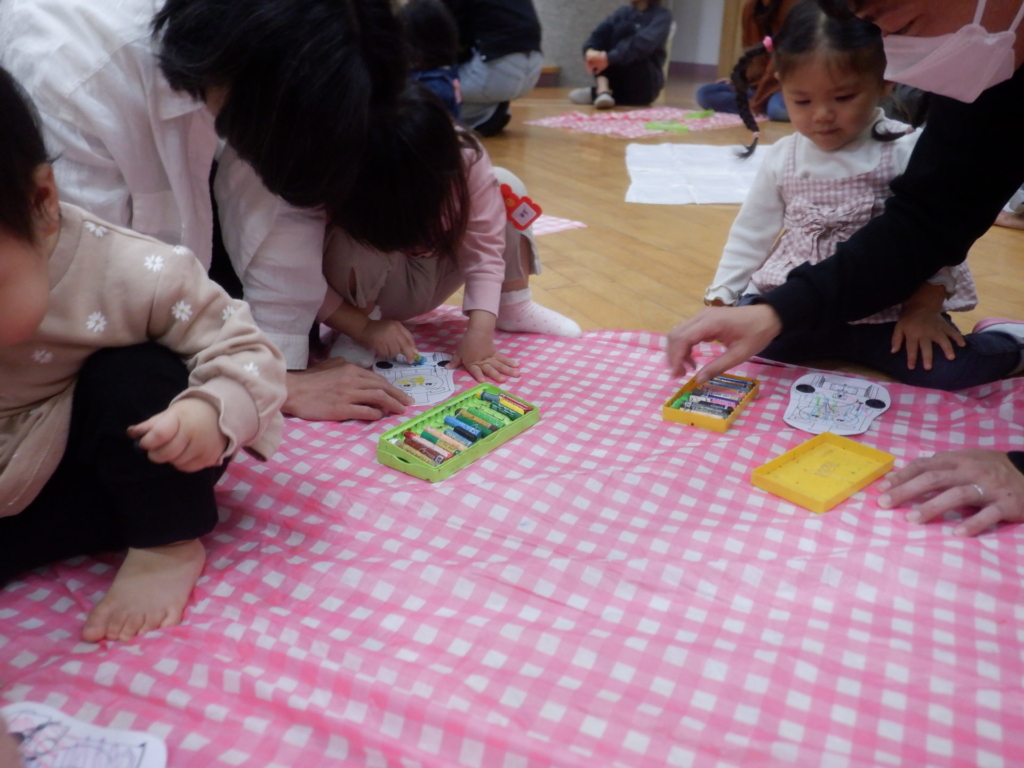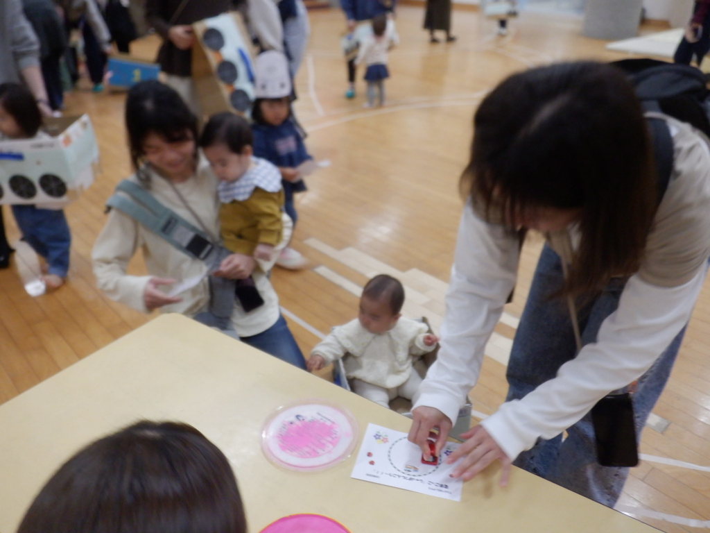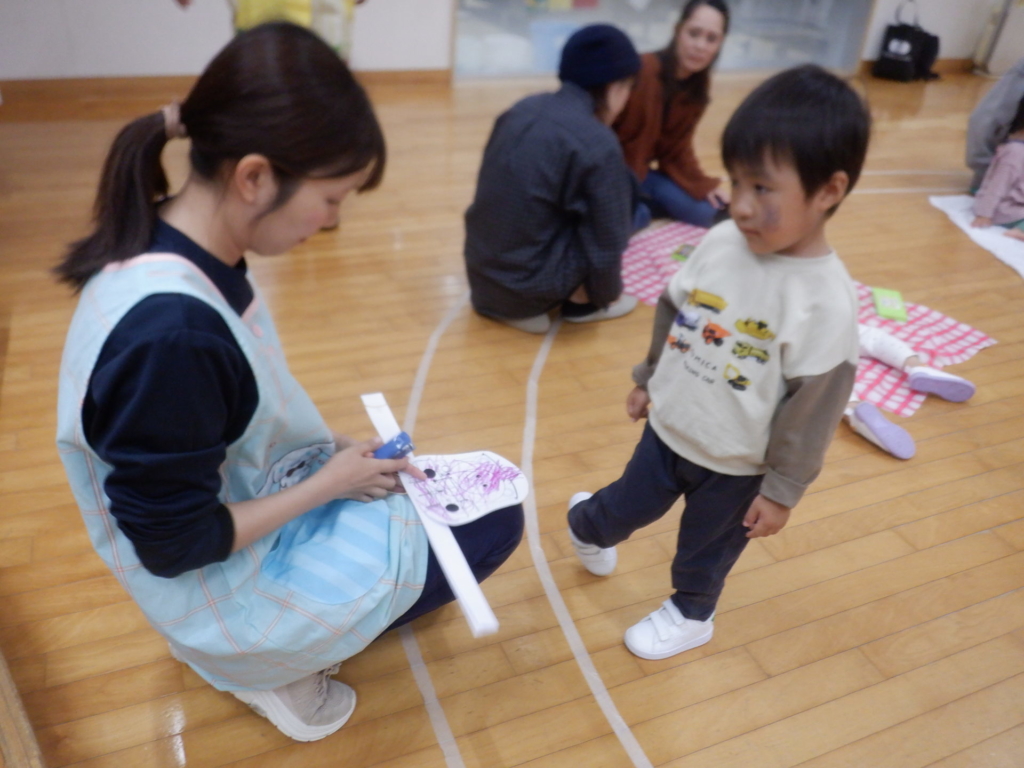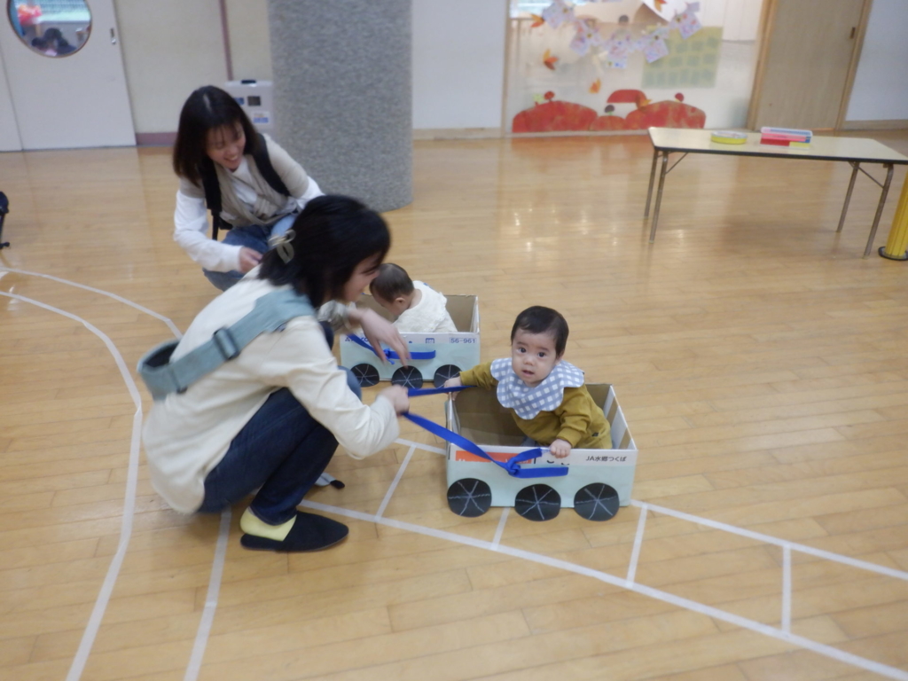 10月22日のてんとうむしクラブは、電車ごっこを楽しみました。電車にシールでデコレーションをして、オリジナルの電車に乗って「しゅっぱつしんこ~う!」。駅に到着したら、スタンプを押し何度も何度も線路を行ったり来たりしました。電車はホールを飛び出し電車は進み、赤組さんのクラスや給食室などを見に出掛けるなど、電車遊びを楽しみました。