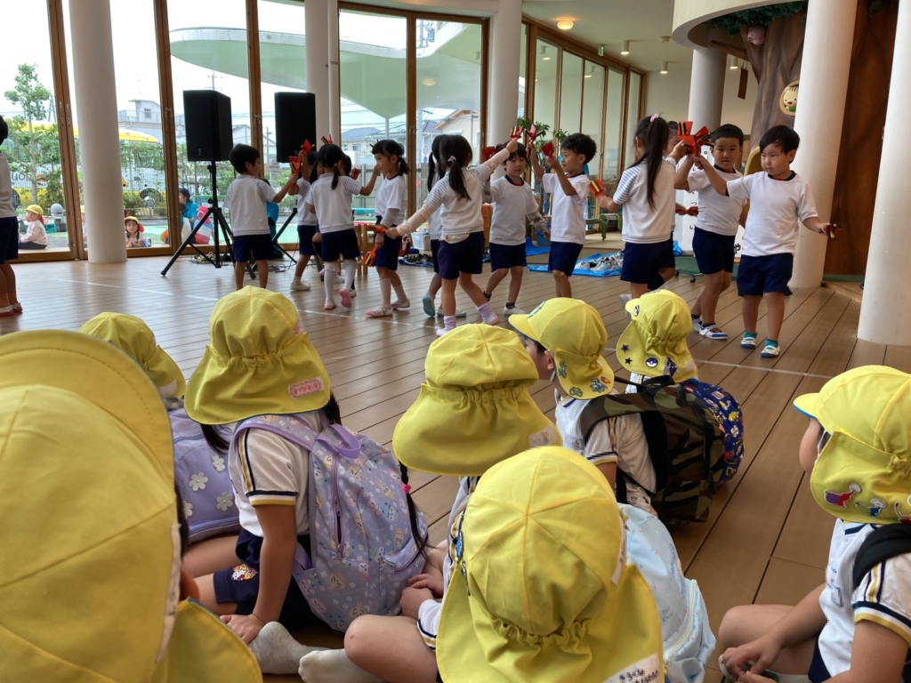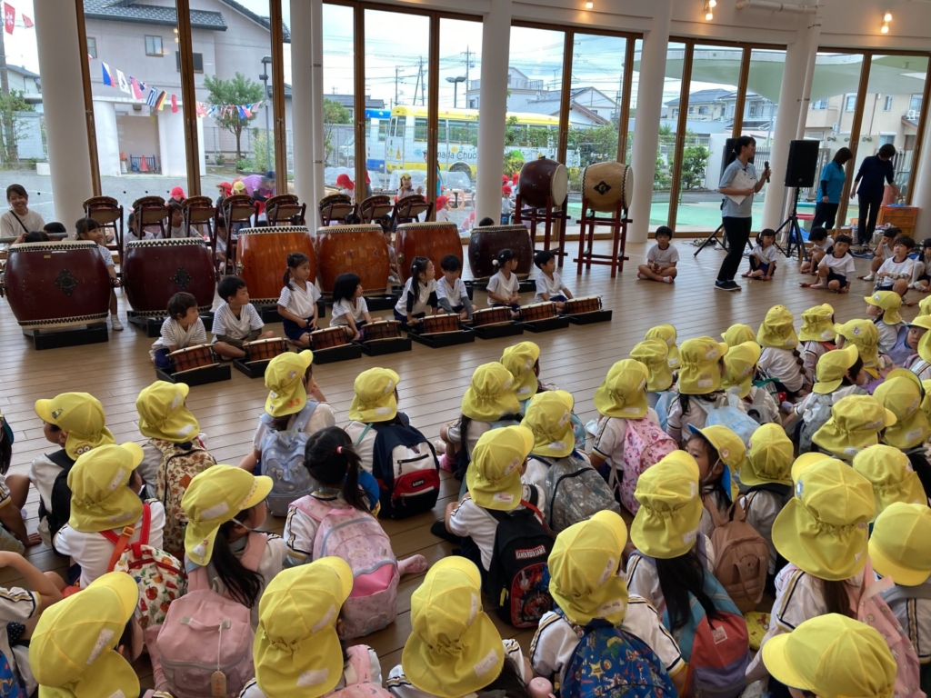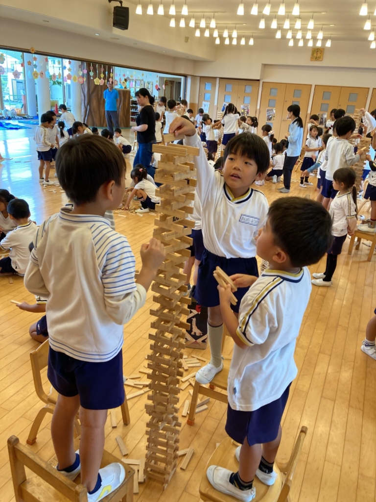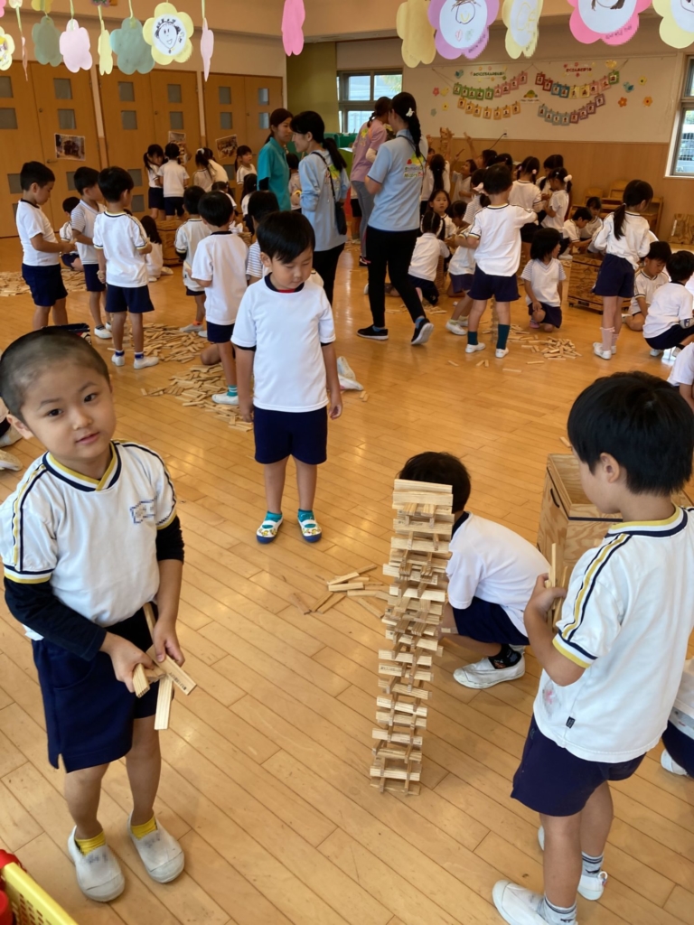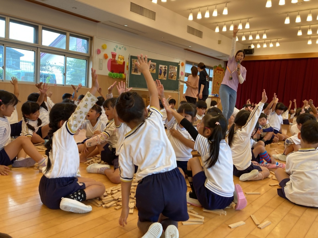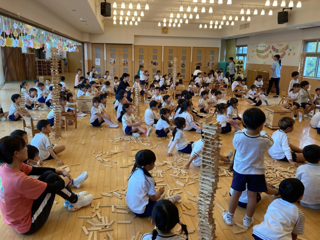 姉妹園のみどり認定こども園の黄組の子どもたちと交流会を行いました。歓迎会では、みどりこども園の子どもたちが和太鼓の演奏を披露してくれました。和太鼓の迫力のある演奏を楽しんだ後は、両園合同でグループを作ってカプラ大会を開催しました。中央の子どもたちはカプラ初体験だったので、みどりの子どもたちに積み方のコツを聞きながら挑戦しました。チームごとにその場で様々な作戦を練りながら次々とカプラのタワーを積み上げていくと「やったね!!」「こんなに高くなったよ!!」とでき上がったタワーを見上げて盛り上がりました。楽しかった交流会の一日ですっかり仲良くなった子どもたちでした。引き続き両園での交流を楽しんでいきたいと思います。