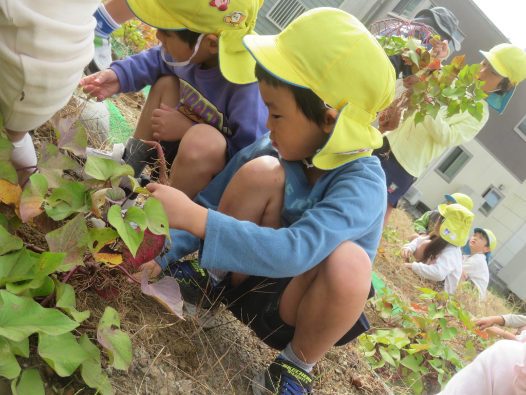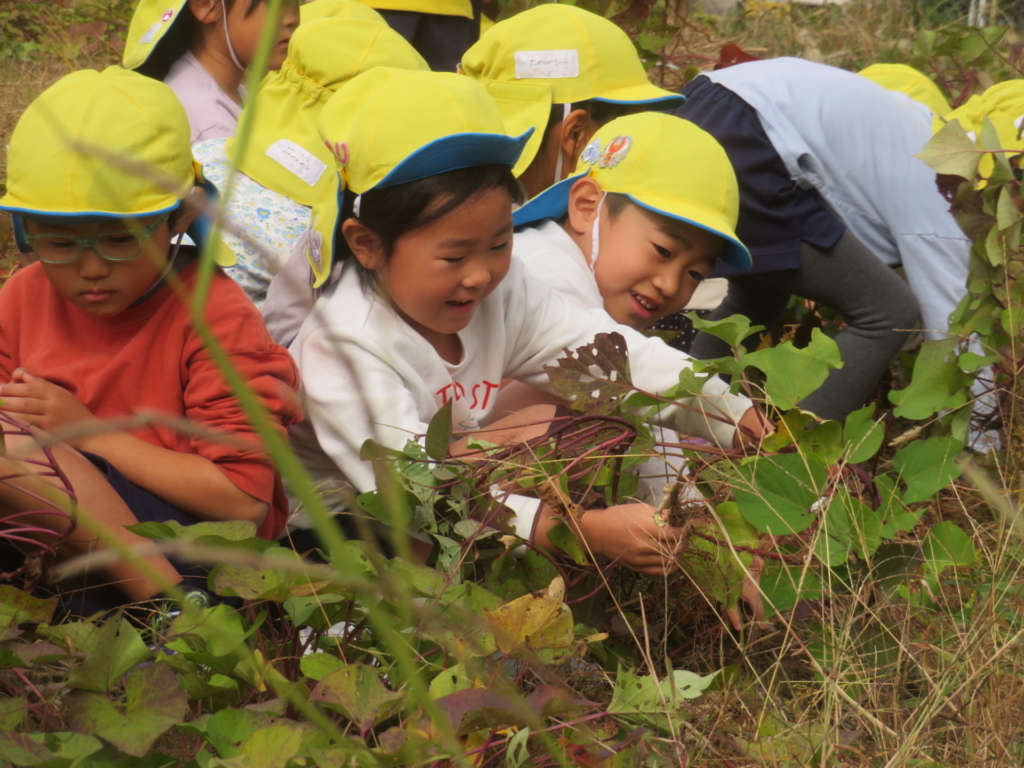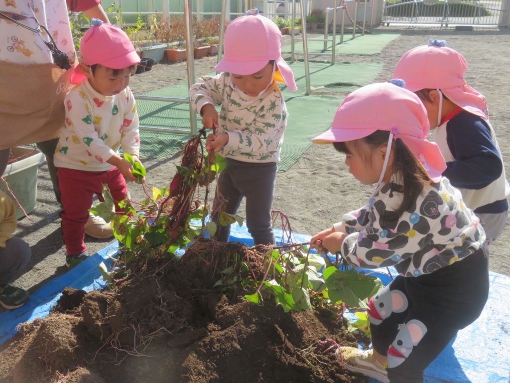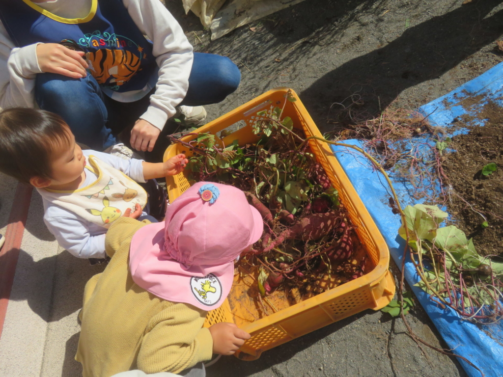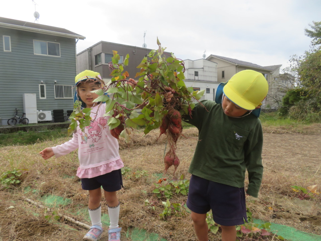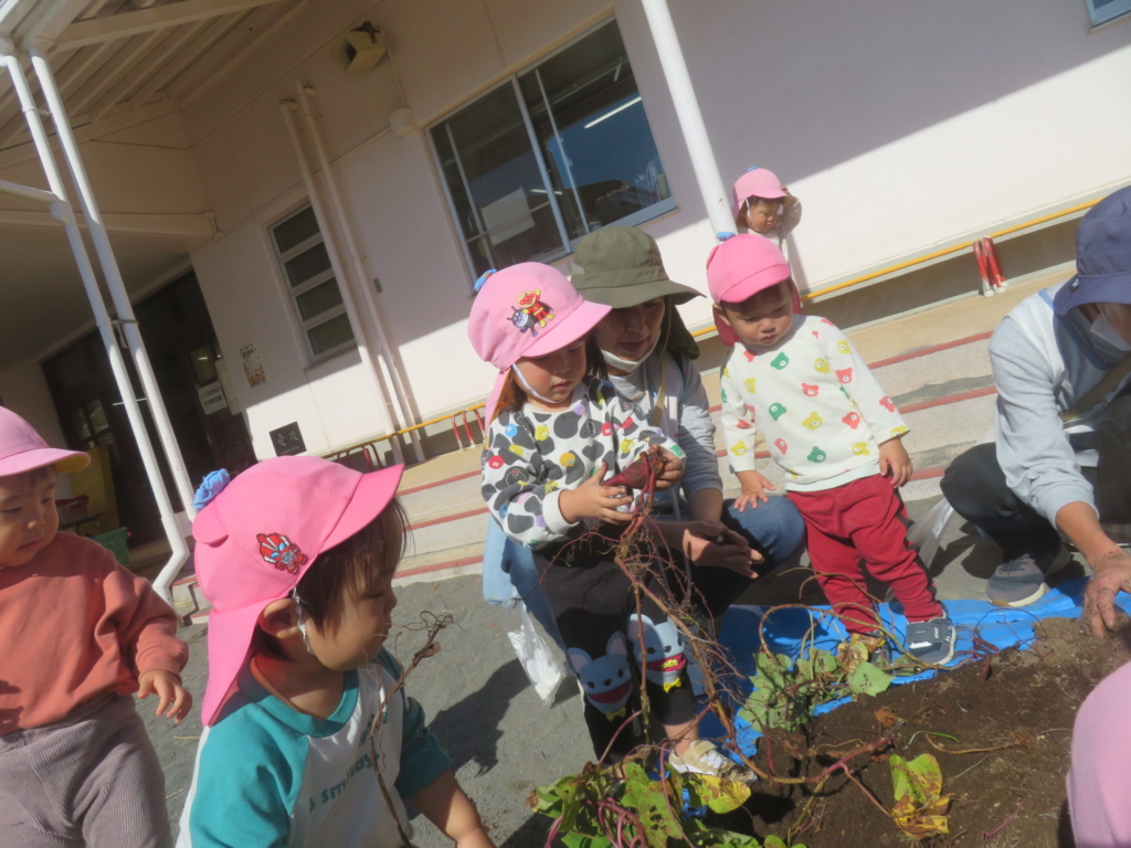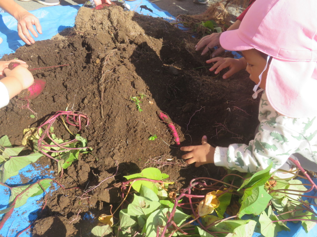気持ちの良い秋空のもとで、おいも掘りをしました。近所の畑をお借りした芋畑と、園で作った肥料袋の中のおいもたち・・・掘ってみないと、どんなおいもが出てくるのか、お楽しみでしたが、かわいいおいもがコロコロ出てきて、子どもたちは大喜びでした。これから、お日様の光を浴び次の活動に向けておいもたちは、少し休憩…一層甘くなりますように。 焼き芋や、ふかし芋などで美味しく頂きたいと思います。