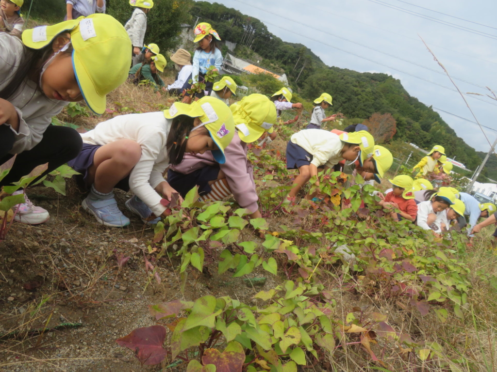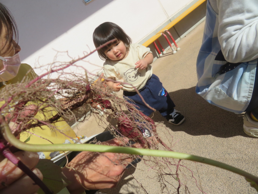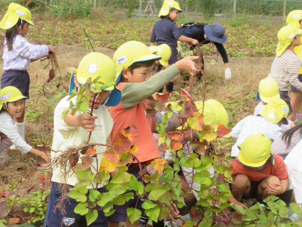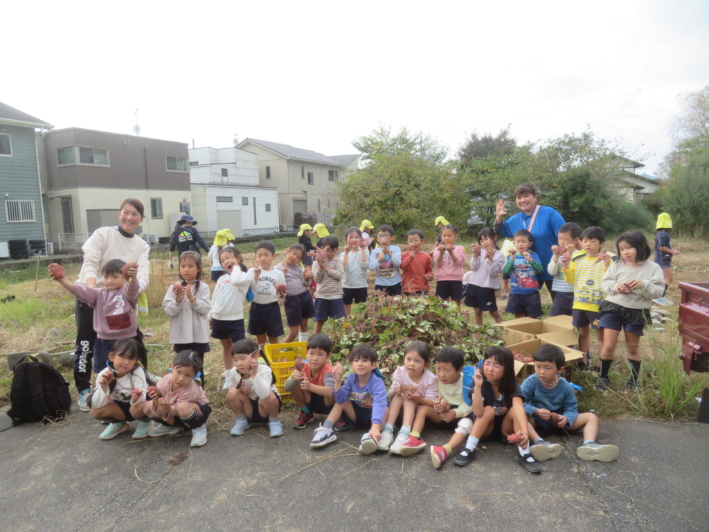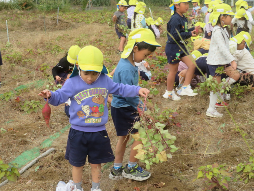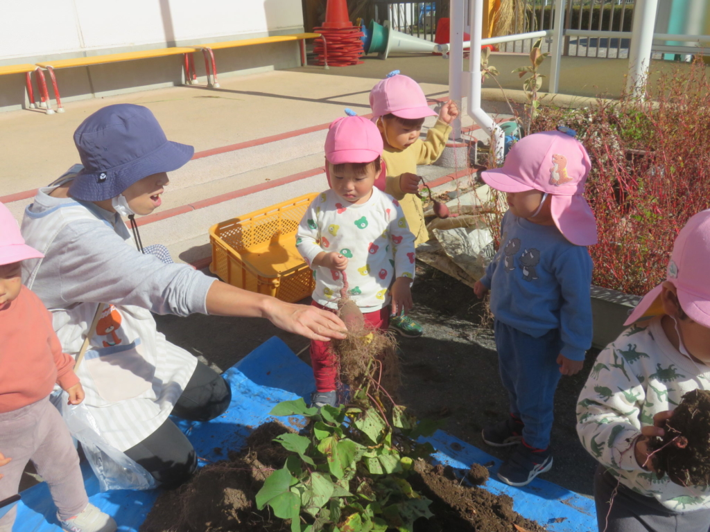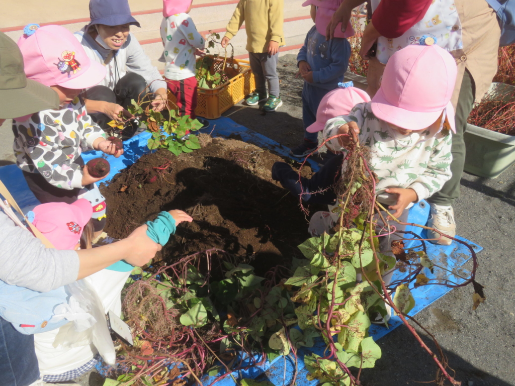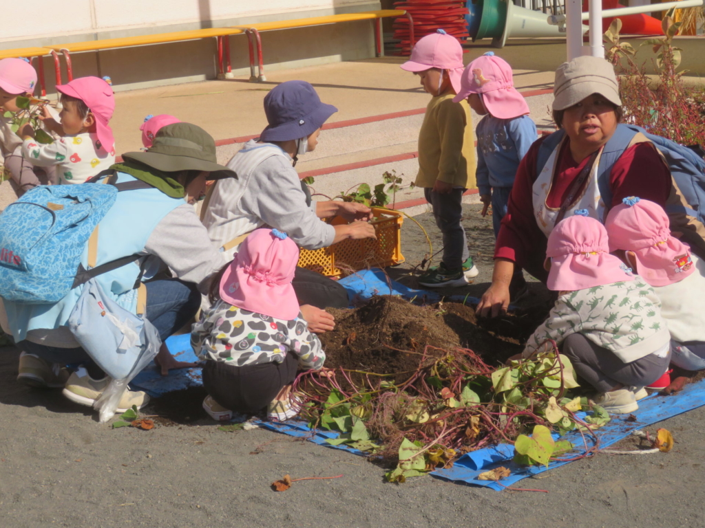 気持ちの良い秋空のもとで、おいも掘りをしました。近所の畑をお借りした芋畑と、園で作った肥料袋の中のおいもたち・・・掘ってみないと、どんなおいもが出てくるのか、お楽しみでしたが、かわいいおいもがコロコロ出てきて、子どもたちは大喜びでした。これから、お日様の光を浴び次の活動に向けておいもたちは、少し休憩…一層甘くなりますように。 焼き芋や、ふかし芋などで美味しく頂きたいと思います。