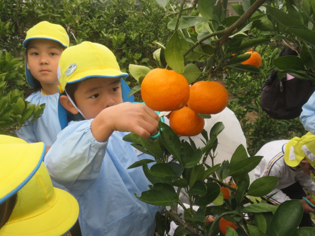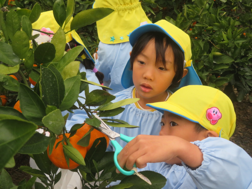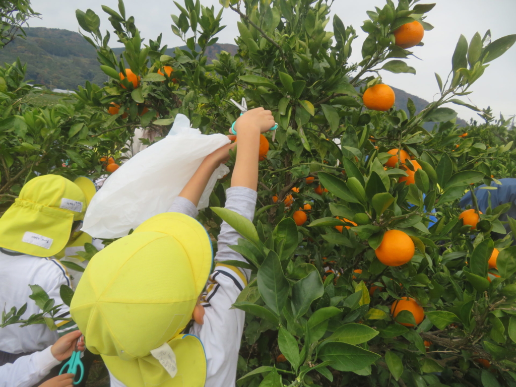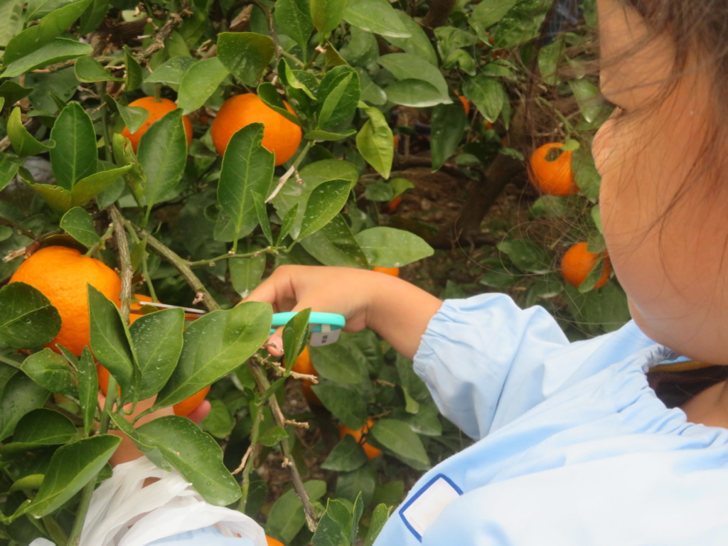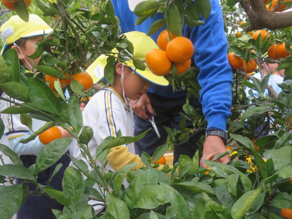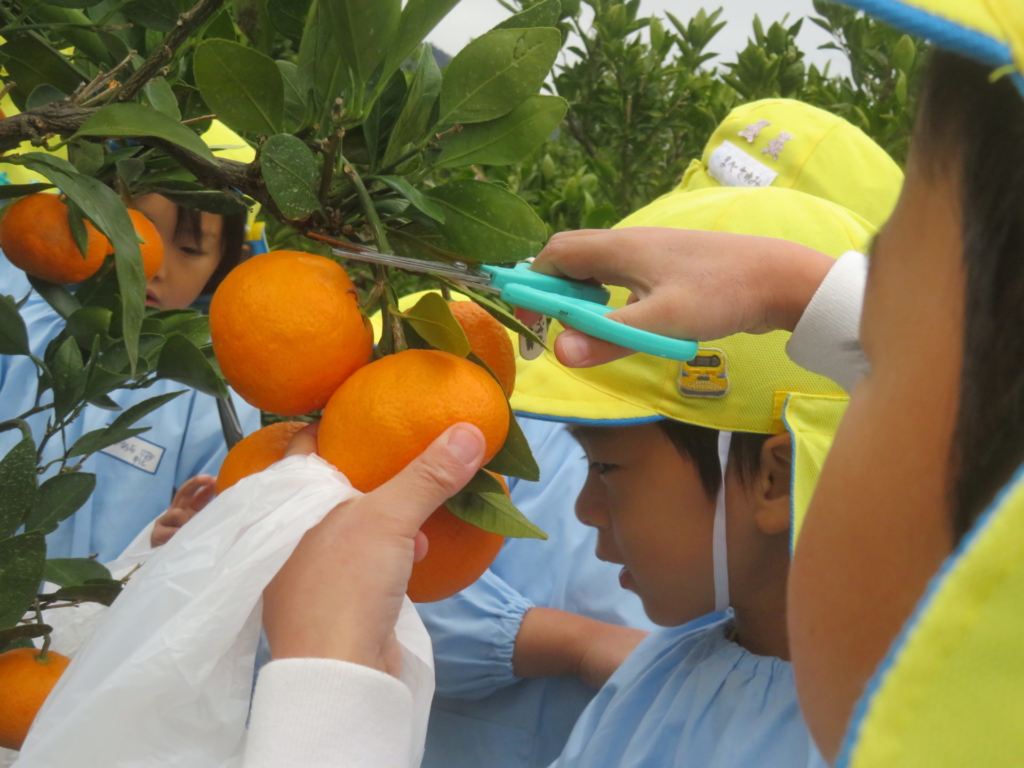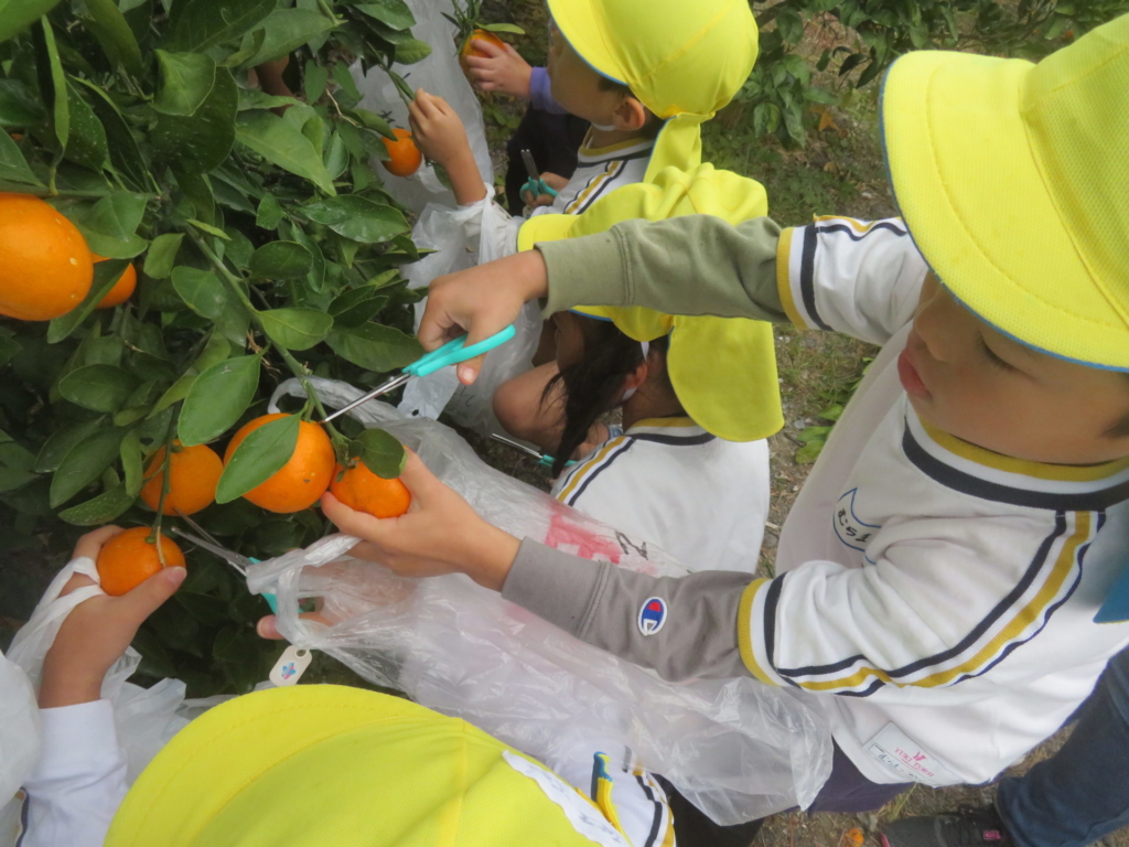 25日(火)に神座のみかん畑で、みかん狩り体験をしてきました。生産者さんから、ハサミでみかんを傷つけずに収穫する方法を聞いた後、早速自分たちで挑戦する事に・・・。「どれが美味しいみかんかなあ?」とみかんを一つ一つ選びながら収穫を楽しんでいた子どもたちでした。園に戻り、自分で収穫したみかんを食べると「おいし~い」「あま~い」と、ぱくぱく食べていました。沢山収穫できたので、お家の人へのお土産と縦割りのクラスや先生たちにもお裾分けをして、園全体で美味しいみかんを味わいました。