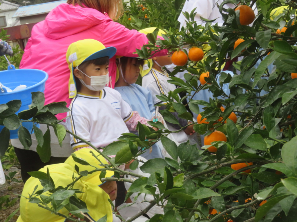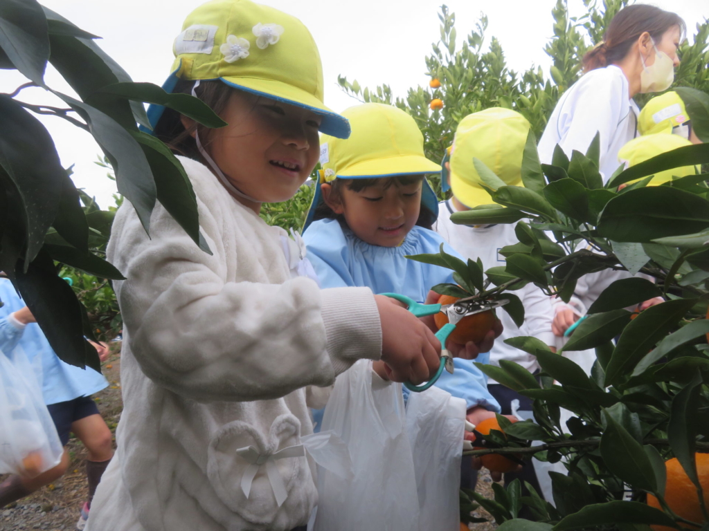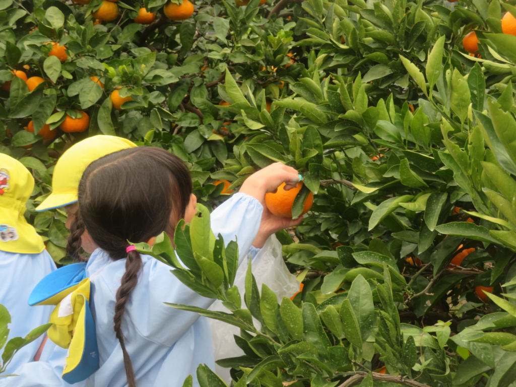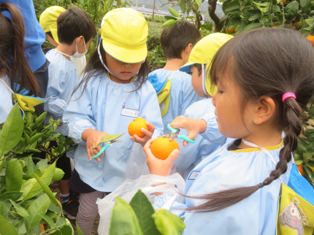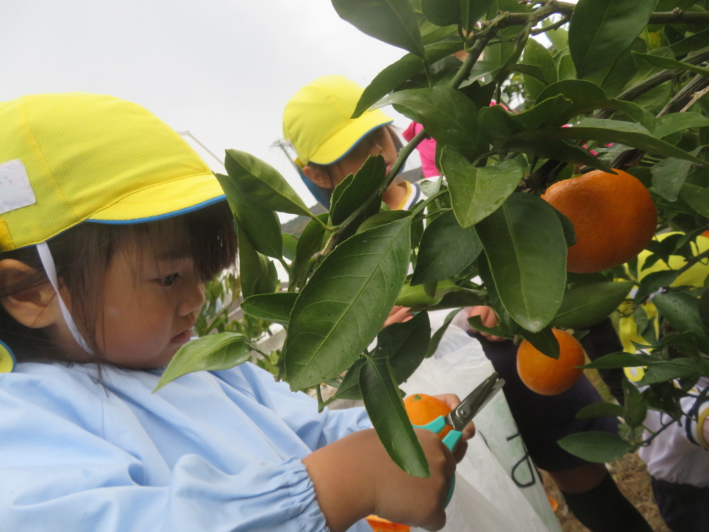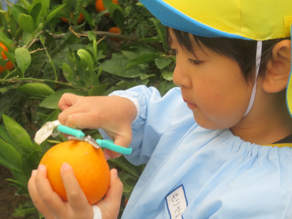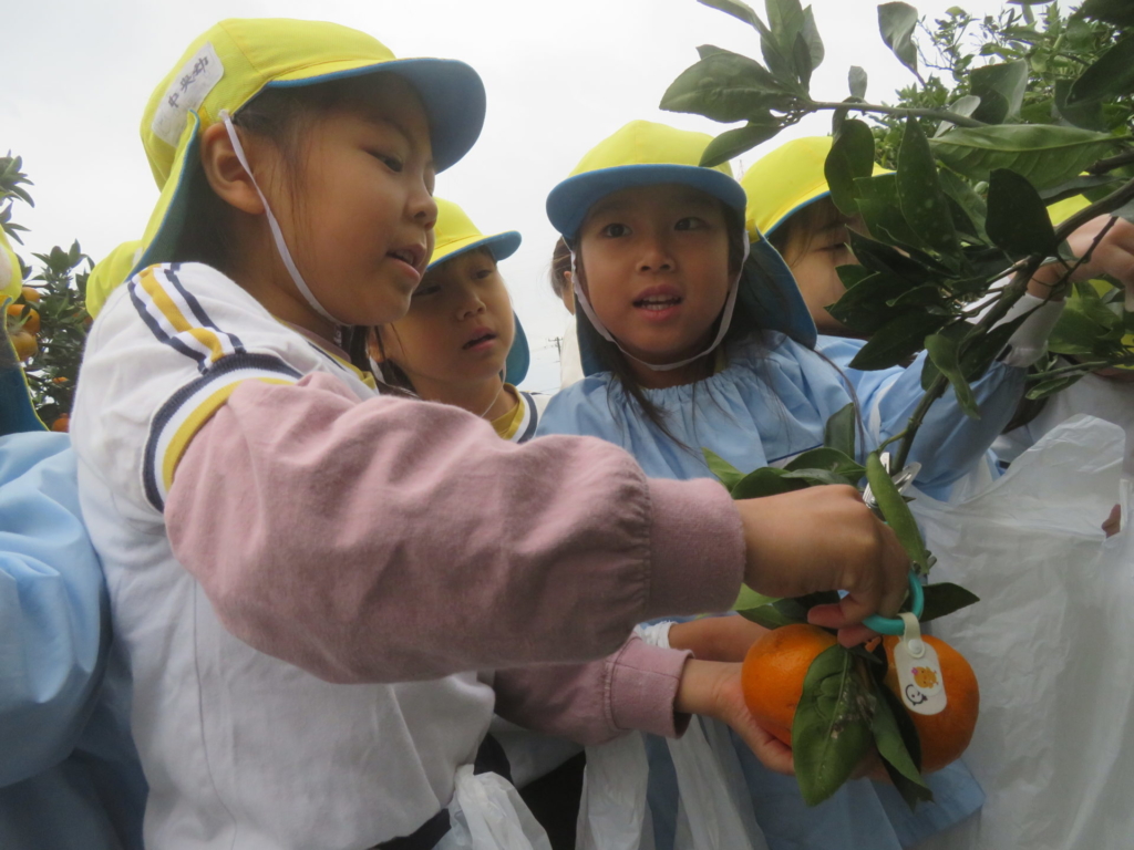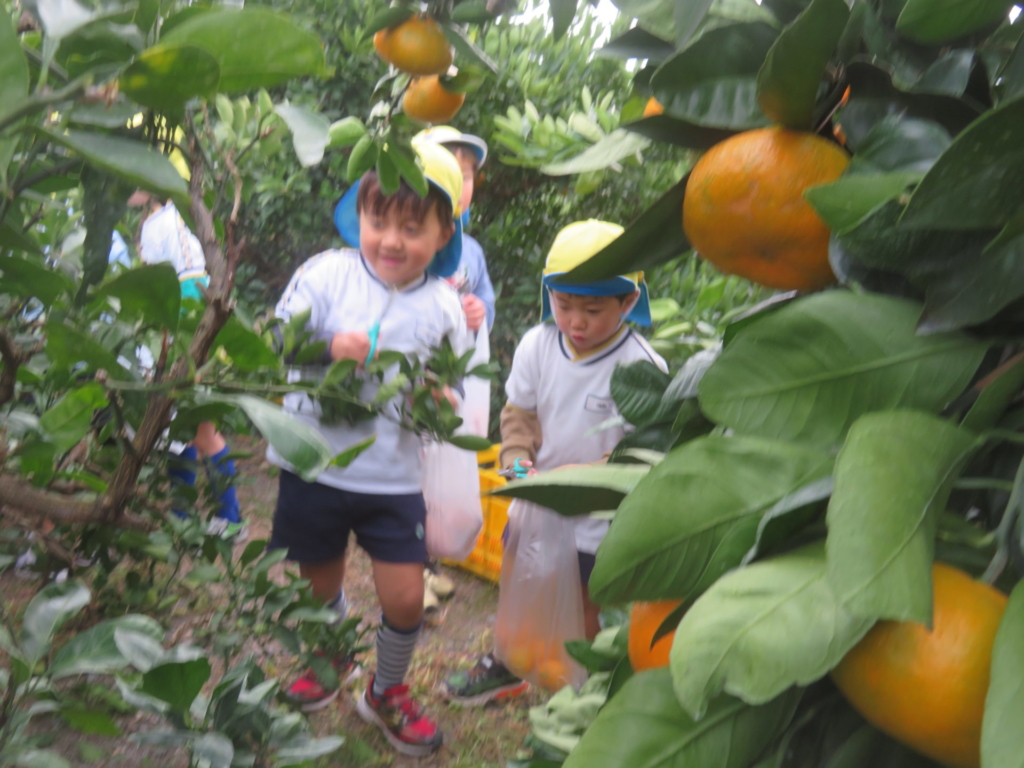 25日(火)に神座のみかん畑で、みかん狩り体験をしてきました。生産者さんから、ハサミでみかんを傷つけずに収穫する方法を聞いた後、早速自分たちで挑戦する事に・・・。「どれが美味しいみかんかなあ?」とみかんを一つ一つ選びながら収穫を楽しんでいた子どもたちでした。園に戻り、自分で収穫したみかんを食べると「おいし~い」「あま~い」と、ぱくぱく食べていました。沢山収穫できたので、お家の人へのお土産と縦割りのクラスや先生たちにもお裾分けをして、園全体で美味しいみかんを味わいました。