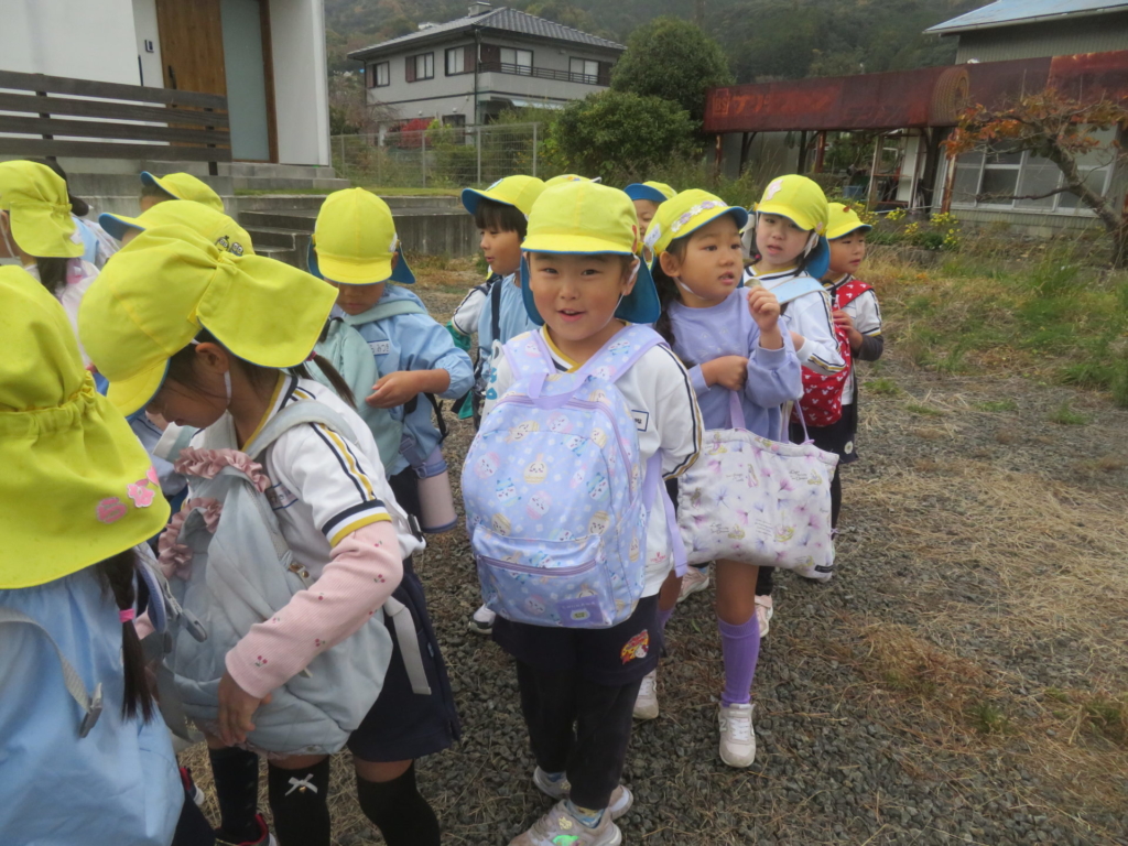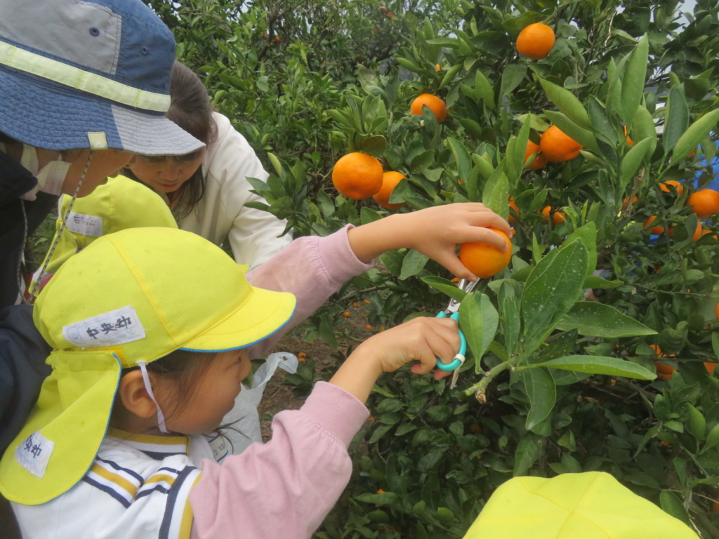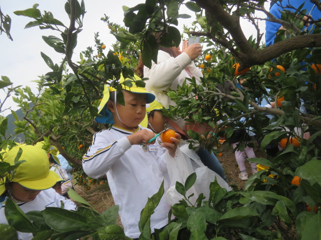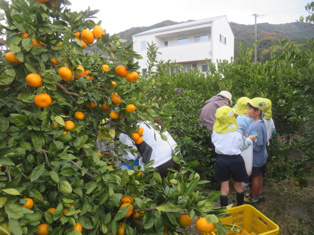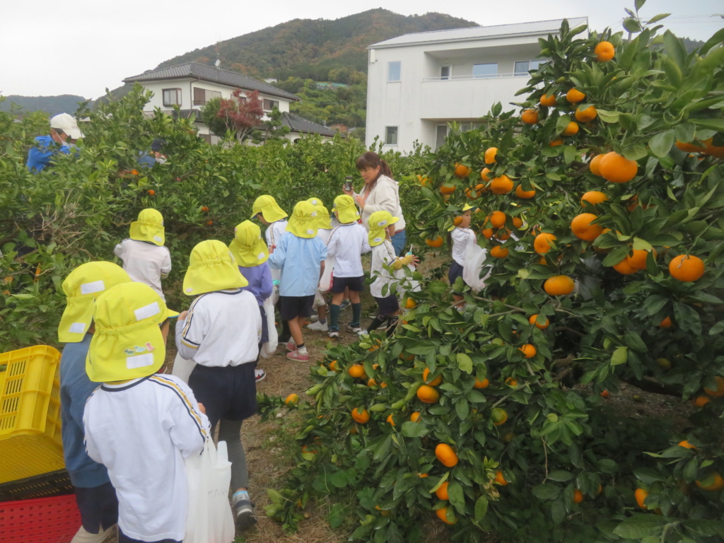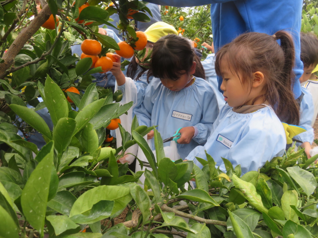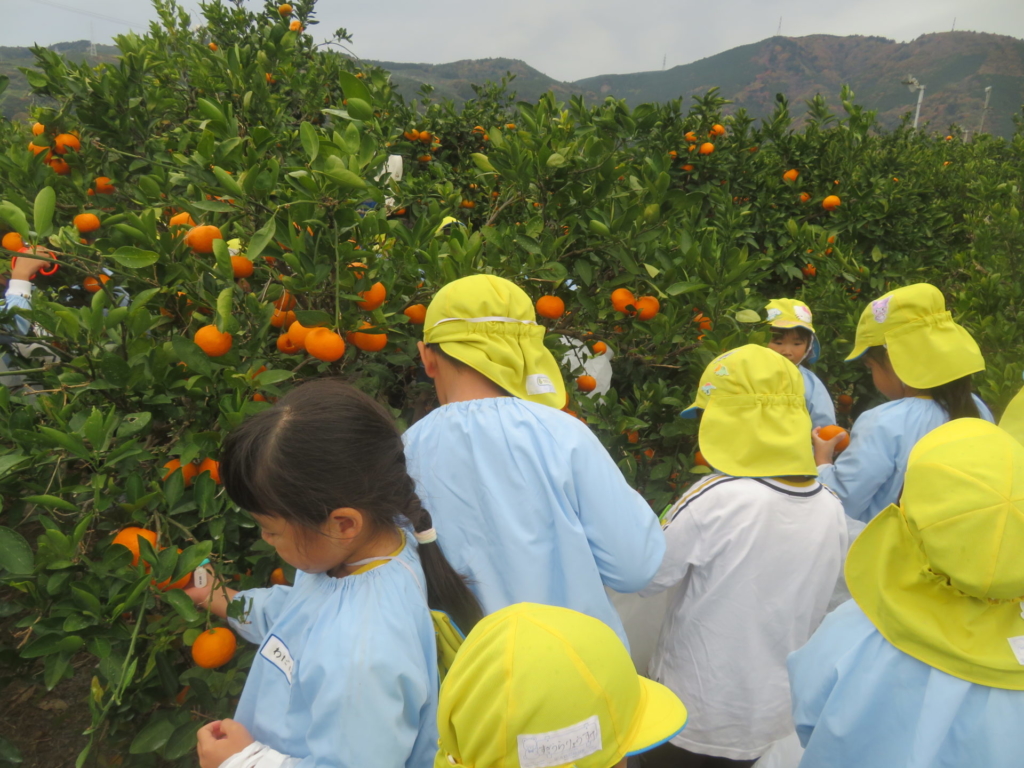 25日(火)に神座のみかん畑で、みかん狩り体験をしてきました。生産者さんから、ハサミでみかんを傷つけずに収穫する方法を聞いた後、早速自分たちで挑戦する事に・・・。「どれが美味しいみかんかなあ?」とみかんを一つ一つ選びながら収穫を楽しんでいた子どもたちでした。園に戻り、自分で収穫したみかんを食べると「おいし~い」「あま~い」と、ぱくぱく食べていました。沢山収穫できたので、お家の人へのお土産と縦割りのクラスや先生たちにもお裾分けをして、園全体で美味しいみかんを味わいました。