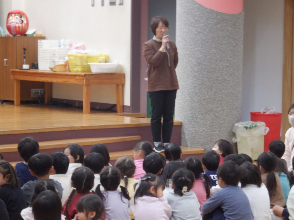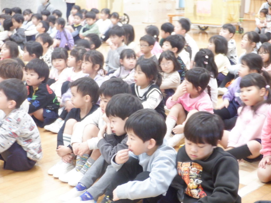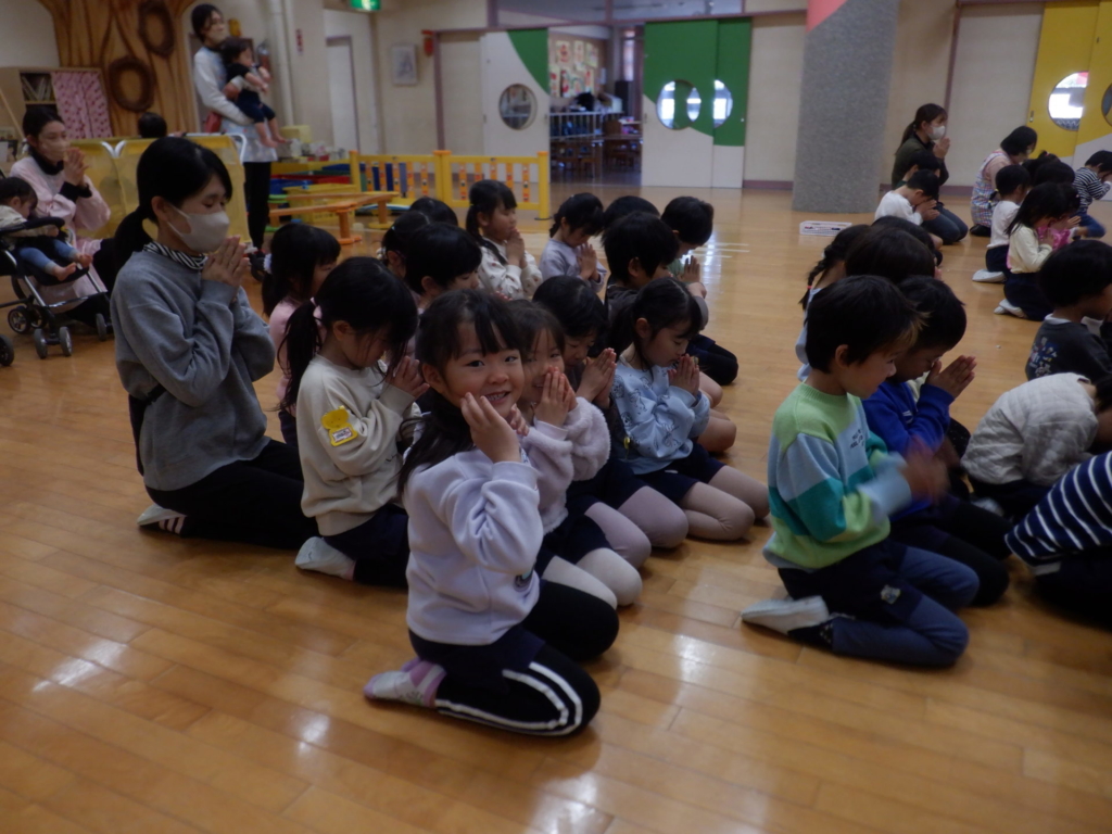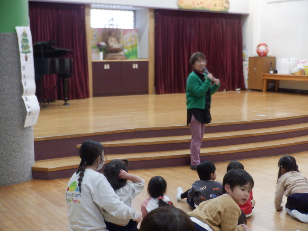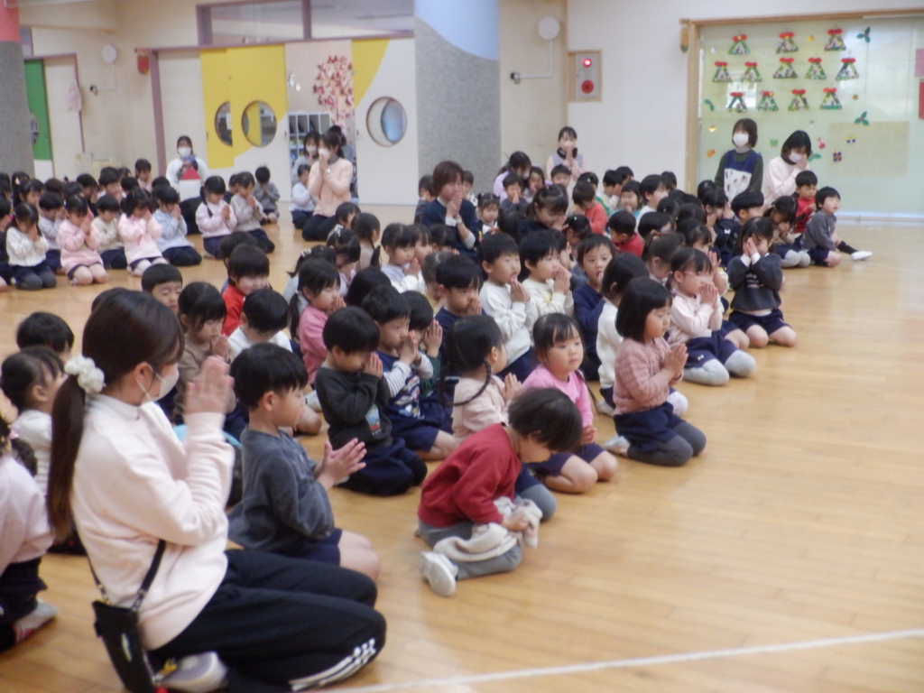 12月19日(金)2学期の終業式が行われました。たくさん頑張ったことがあった2学期・・・「みんなの頑張ったことは何かな?」代表で先生たちが頑張った事を発表しました。次に園長先生から「クリスマスからお正月の間に、今年頑張ったことを、お家の人にお話ししようね」と、宿題をもらった子どもたち。お家でも、頑張ったこと嬉しかったこと良かったことを聞いてあげてくださいね。どうぞ、お元気で楽しい冬休みをお過ごしください。