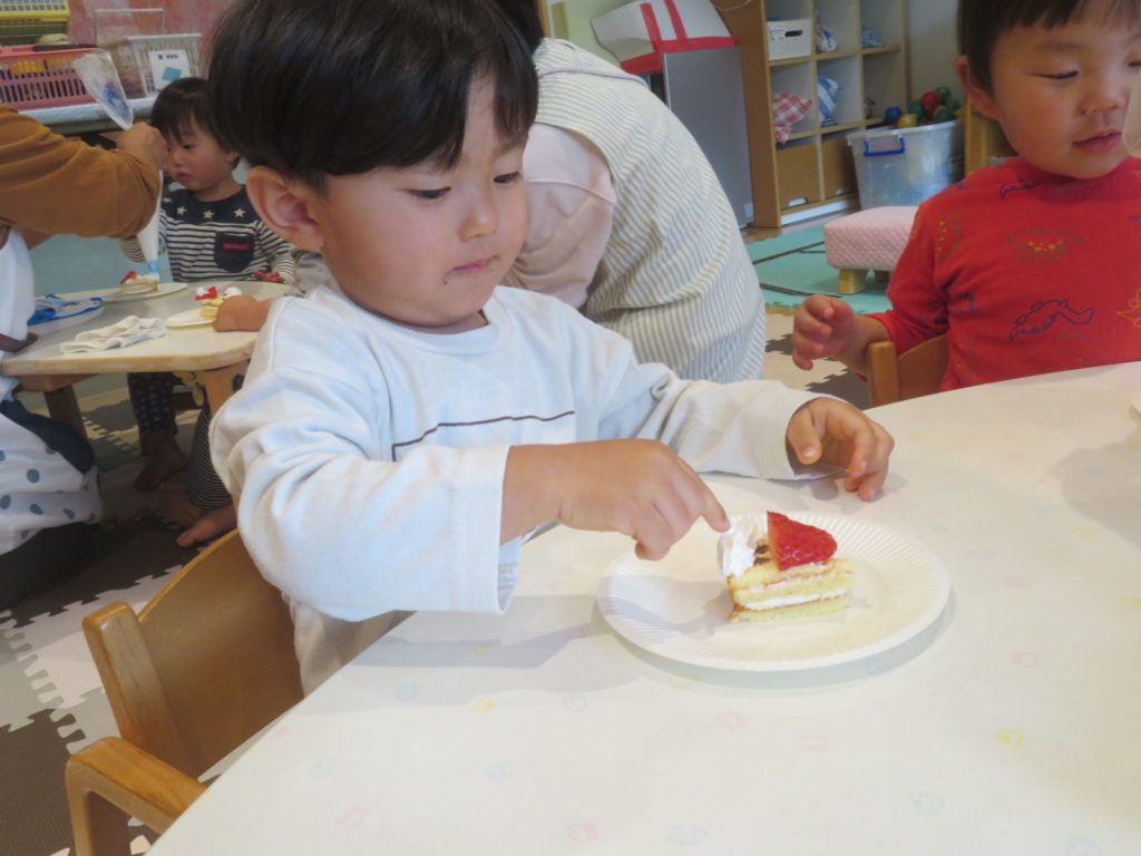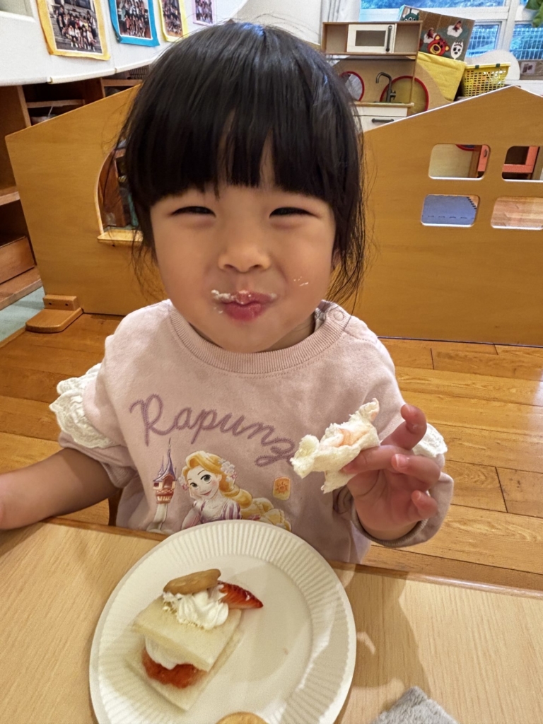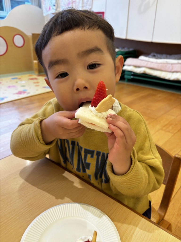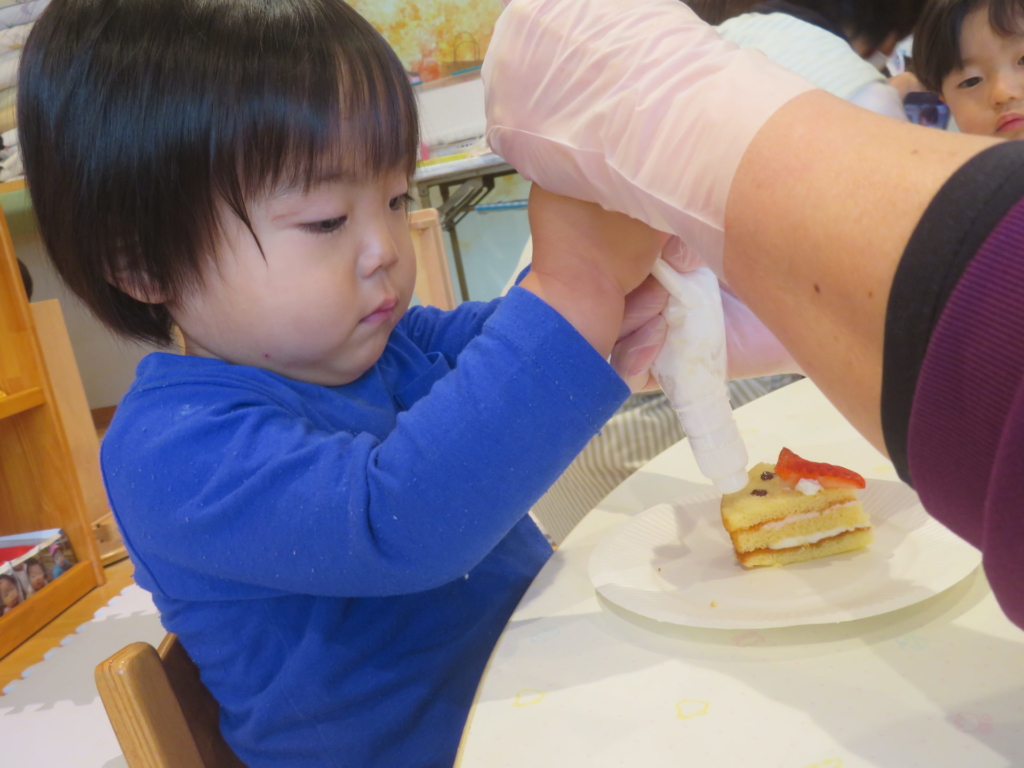 ちゅうりっぷのお友だちがクリスマスのお楽しみ活動の中で、ケーキにデコレーションをしました。小さな手でありったけの力を入れてクリームをむぎゅ~としぼり完成したケーキに大喜び!!早く食べたくてたまらない子どもたち。ケーキはあっという間に口の中へ・・・美味しい笑みがほころび、にこにこと満足気な子どもたちでした。帰りのお迎えに来たお母さんに一生懸命話す姿も見られました。それほど嬉しかったのですね♡