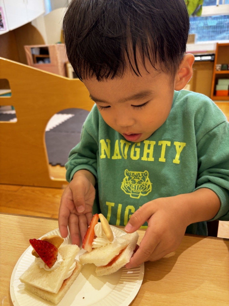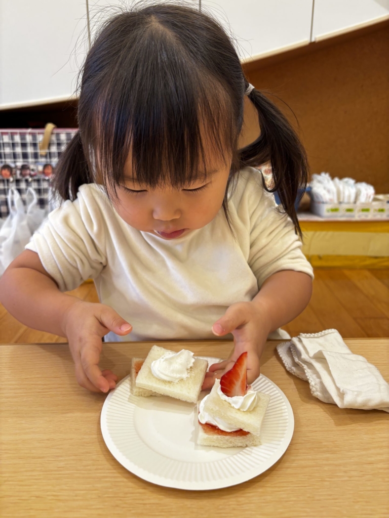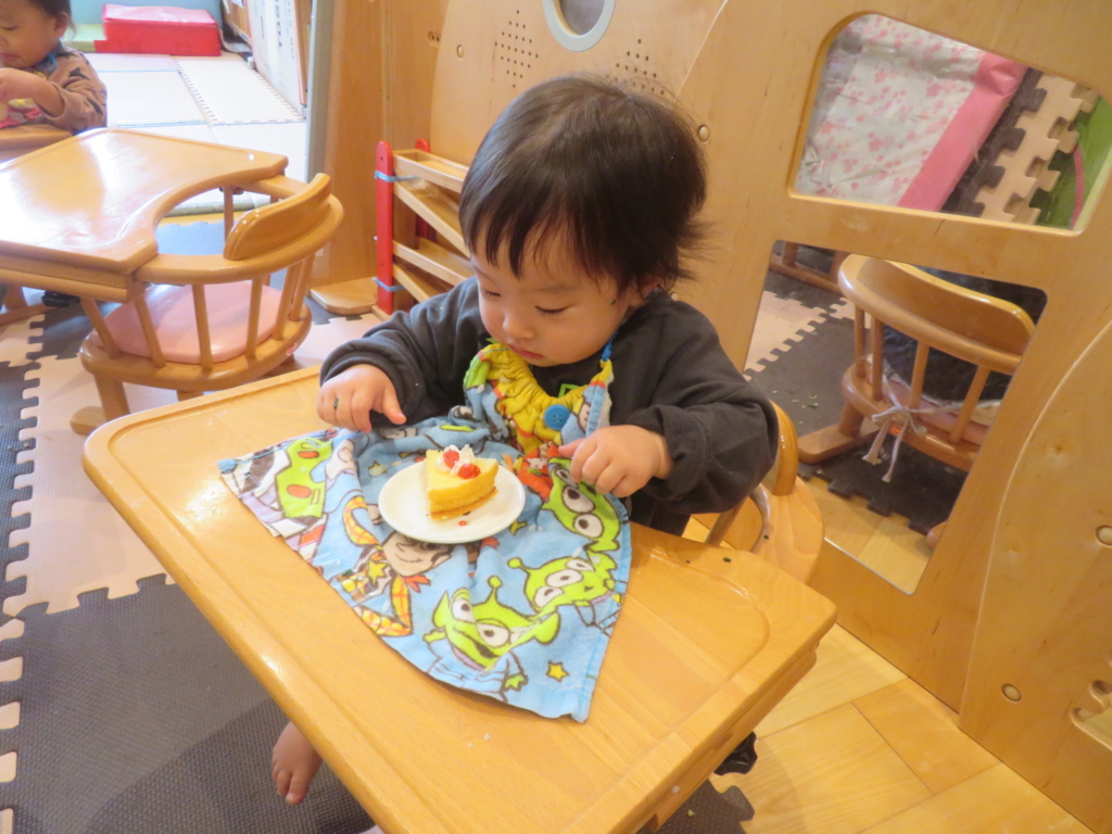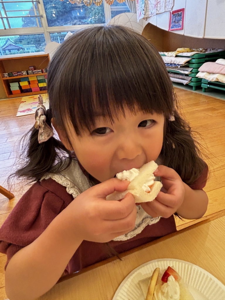 ちゅうりっぷのお友だちがクリスマスのお楽しみ活動の中で、ケーキにデコレーションをしました。小さな手でありったけの力を入れてクリームをむぎゅ~としぼり完成したケーキに大喜び!!早く食べたくてたまらない子どもたち。ケーキはあっという間に口の中へ・・・美味しい笑みがほころび、にこにこと満足気な子どもたちでした。帰りのお迎えに来たお母さんに一生懸命話す姿も見られました。それほど嬉しかったのですね♡