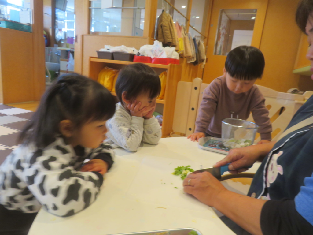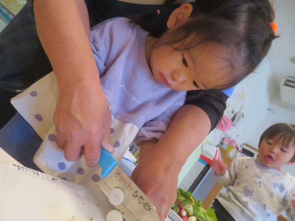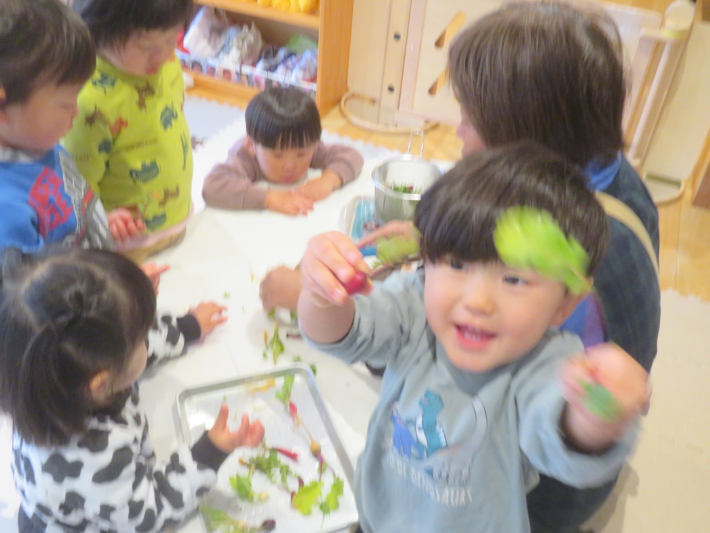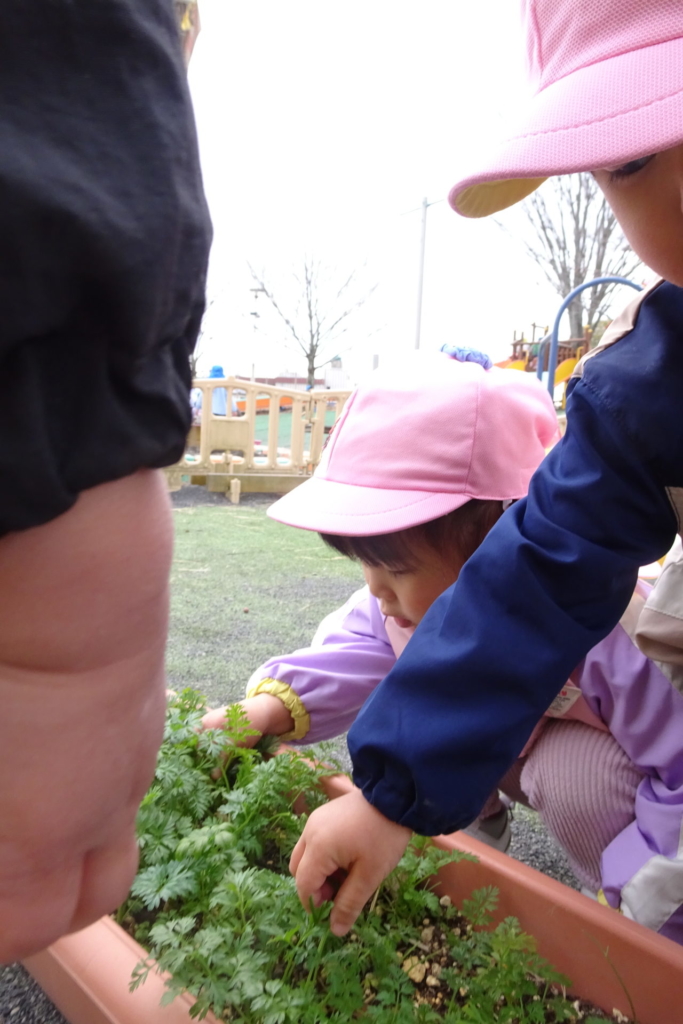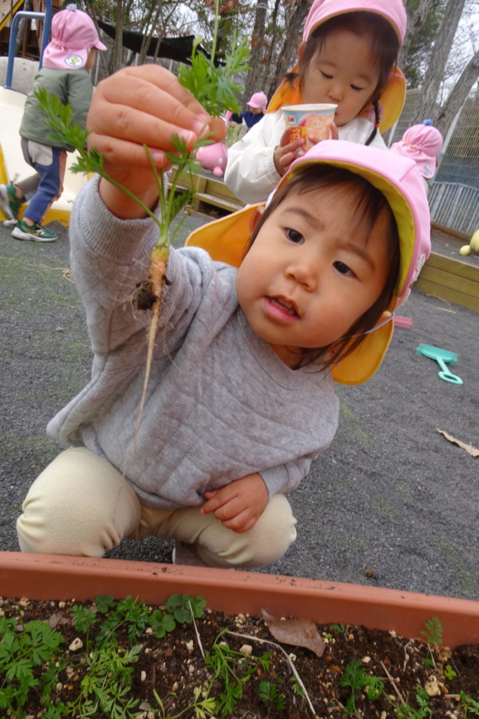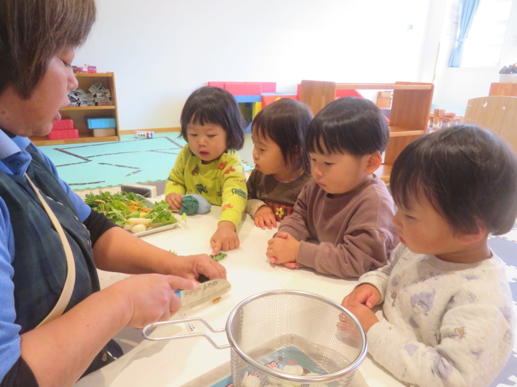 乳幼児園庭のプランターに種まきをし、水を掛け大切に育てていたお野菜を収穫しました。すぽすぽと抜ける感触が楽しく、あっという間に抜いてしまうほど・・・。その野菜を、先生と一緒にしっかり洗って切り、給食のお味噌汁の具材にプラスして食べました。いつもは苦手な野菜も今日ばかりは、おいしい野菜に変身し、ぱくぱくと食べきってしまう子もいました。種をまき、水をあげ、育っていく様子を日々見て、収穫をし、そして食する。おいしさ満点なお味噌汁でした。