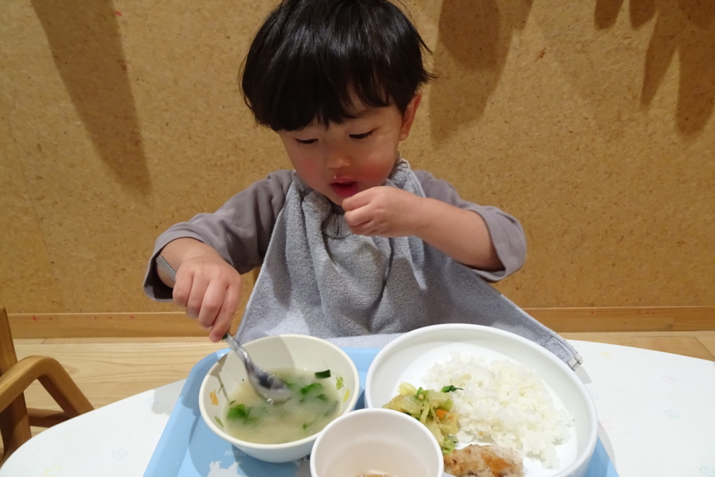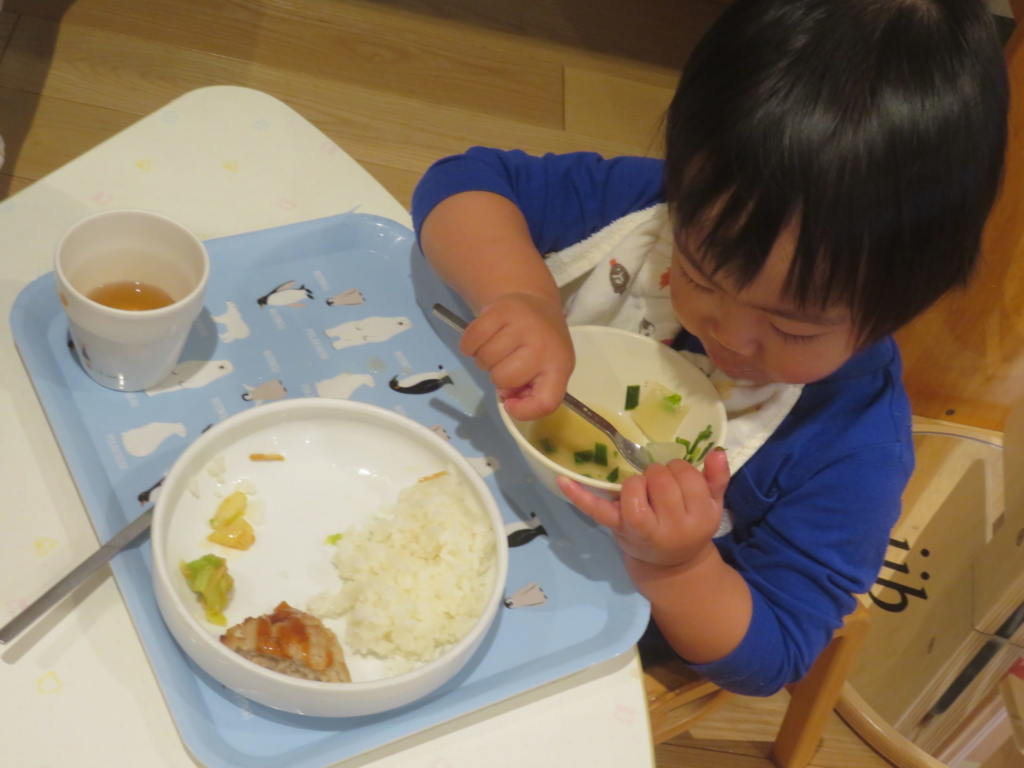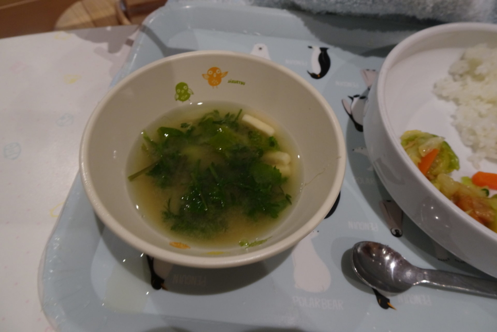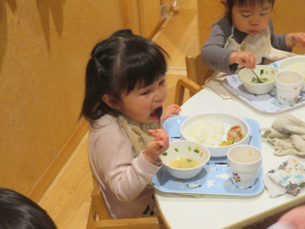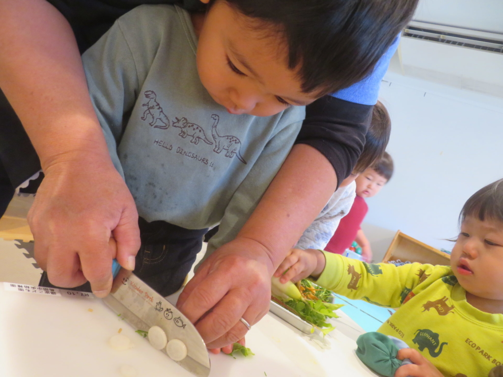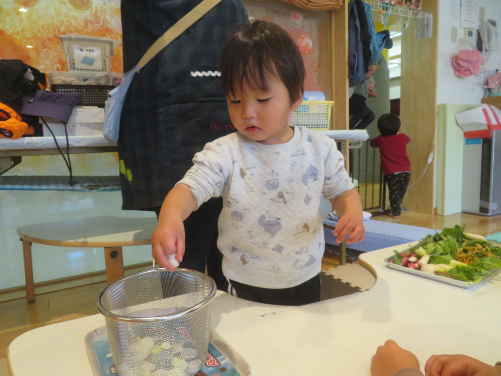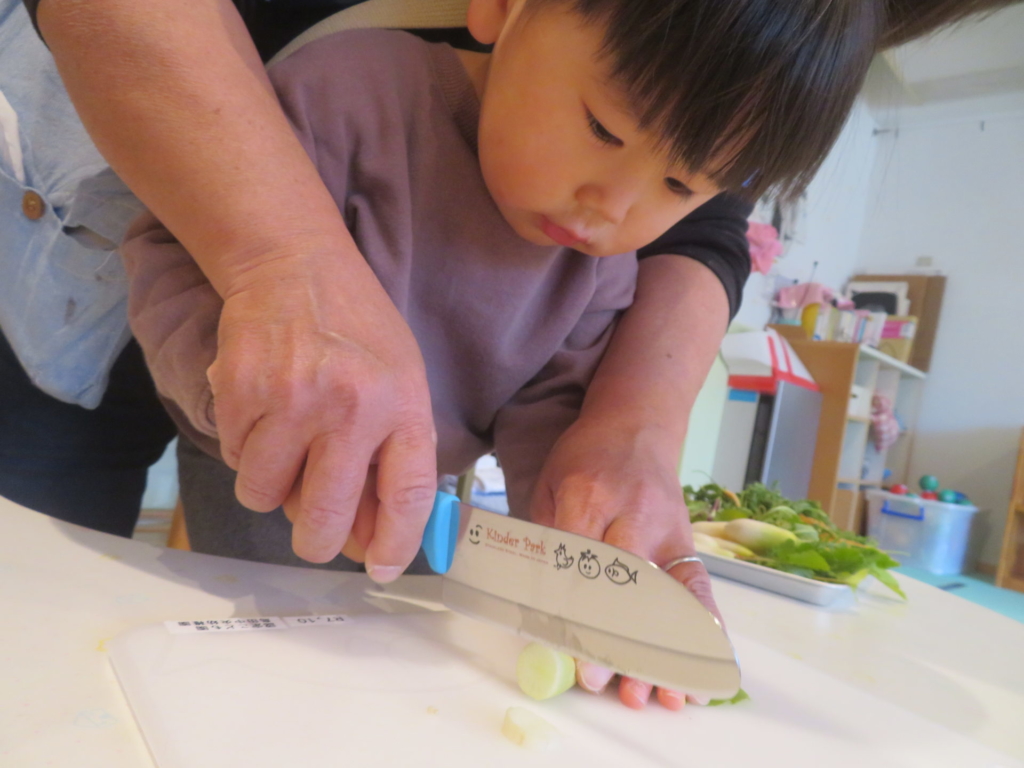 乳幼児園庭のプランターに種まきをし、水を掛け大切に育てていたお野菜を収穫しました。すぽすぽと抜ける感触が楽しく、あっという間に抜いてしまうほど・・・。その野菜を、先生と一緒にしっかり洗って切り、給食のお味噌汁の具材にプラスして食べました。いつもは苦手な野菜も今日ばかりは、おいしい野菜に変身し、ぱくぱくと食べきってしまう子もいました。種をまき、水をあげ、育っていく様子を日々見て、収穫をし、そして食する。おいしさ満点なお味噌汁でした。