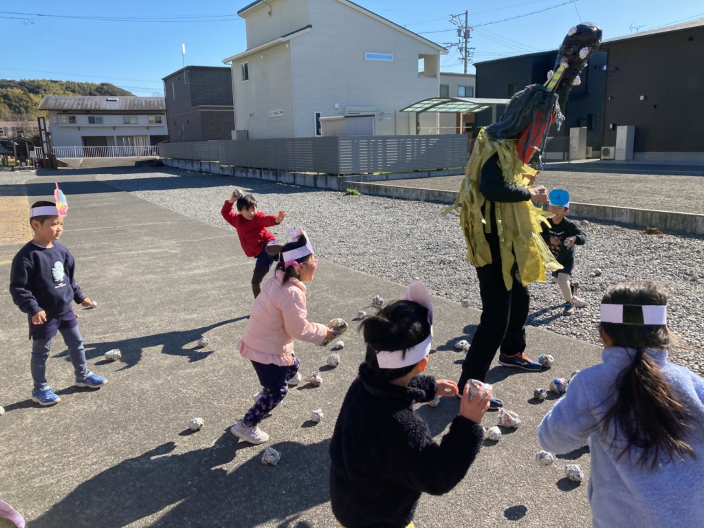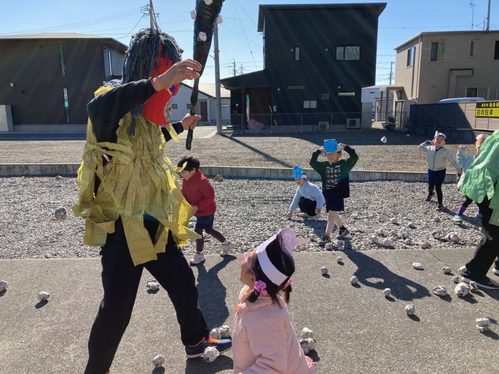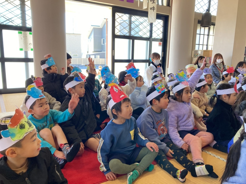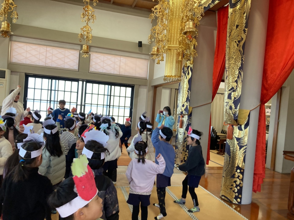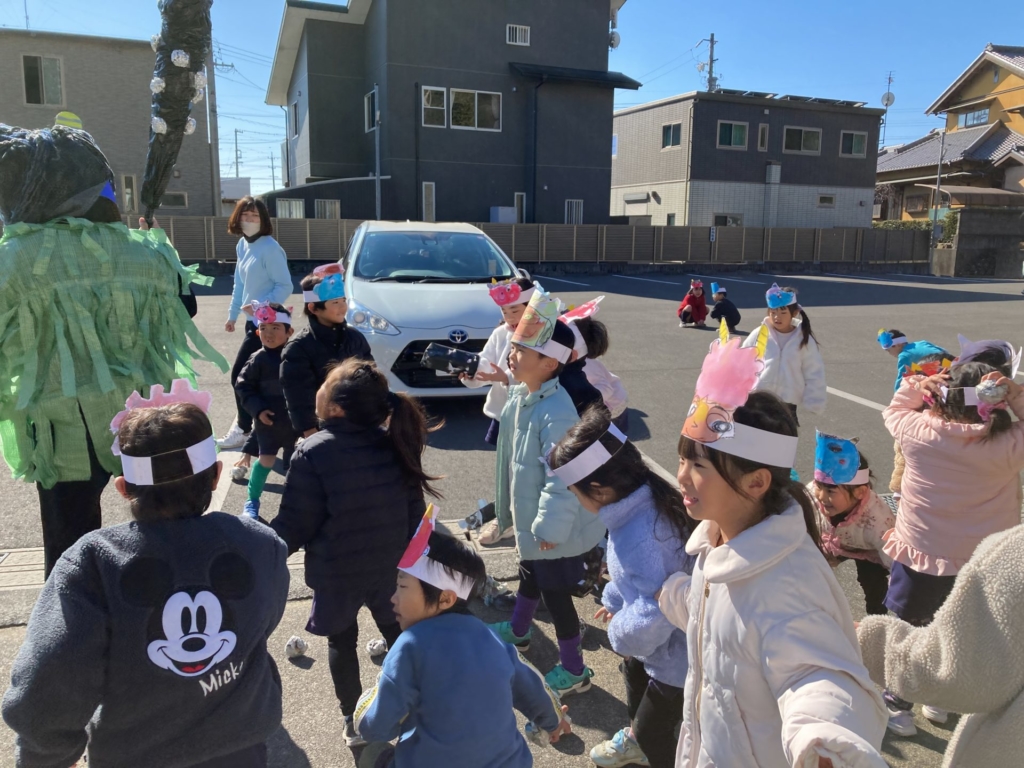 2月3日(火)の節分の日に、黄組の子どもたちは康泰寺に豆まきをしに行ってきました。自分たちで描いた鬼のお面をかぶり康泰寺に着くと住職さんから「お寺にやってくる人たちが襲われないように鬼を退治してほしい。」と頼まれた子どもたち。ドキドキしつつも、鬼たちが現れると勇気を出して豆をまき、鬼たちと戦いました。鬼の迫力に最初は圧倒された子どもたちも、最後には元気に「鬼は外!!福は内!!」と声を出し無事鬼を退治することが出来ました。その後は、大井神社に出掛け「元気な一年生になれますように」とみんなでお参り。黄組のみんなで力を合わせた楽しい思い出がまた一つ増えました。