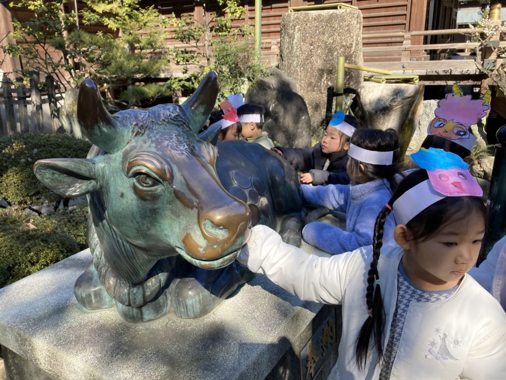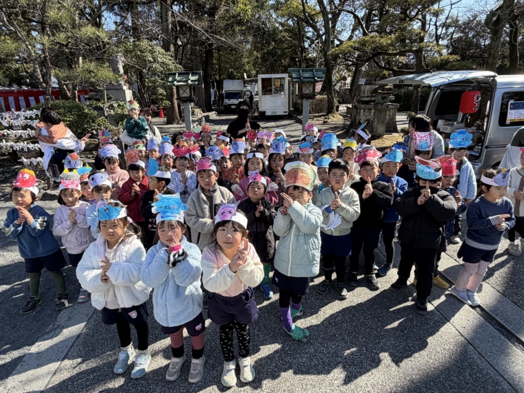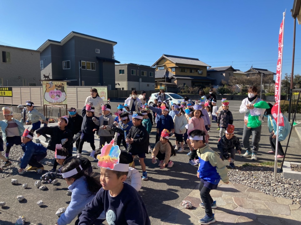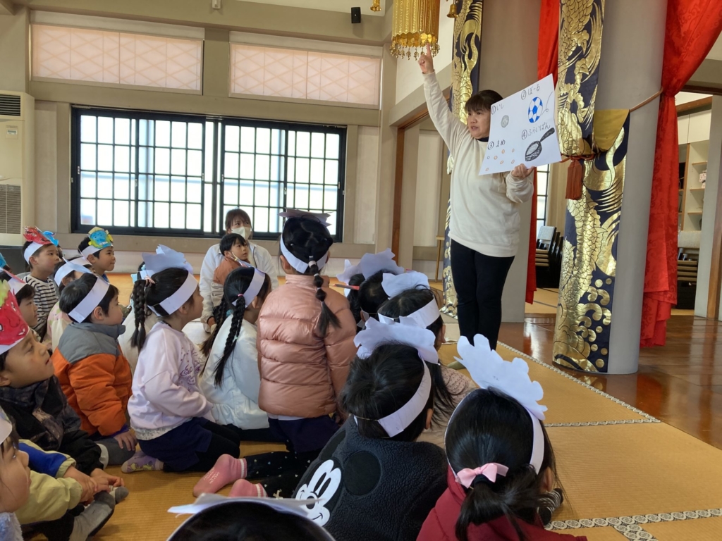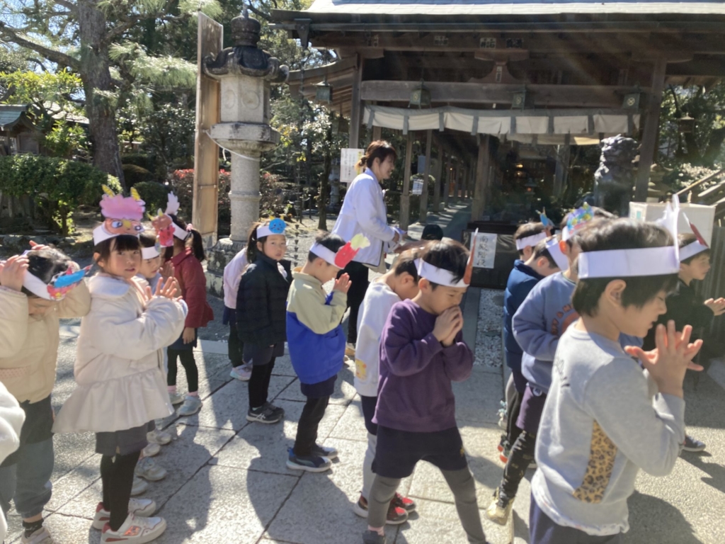 2月3日(火)の節分の日に、黄組の子どもたちは康泰寺に豆まきをしに行ってきました。自分たちで描いた鬼のお面をかぶり康泰寺に着くと住職さんから「お寺にやってくる人たちが襲われないように鬼を退治してほしい。」と頼まれた子どもたち。ドキドキしつつも、鬼たちが現れると勇気を出して豆をまき、鬼たちと戦いました。鬼の迫力に最初は圧倒された子どもたちも、最後には元気に「鬼は外!!福は内!!」と声を出し無事鬼を退治することが出来ました。その後は、大井神社に出掛け「元気な一年生になれますように」とみんなでお参り。黄組のみんなで力を合わせた楽しい思い出がまた一つ増えました。